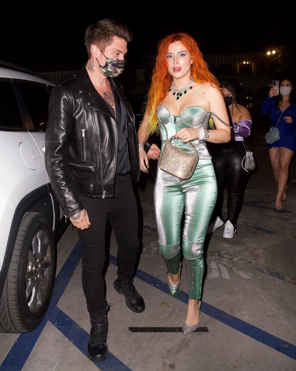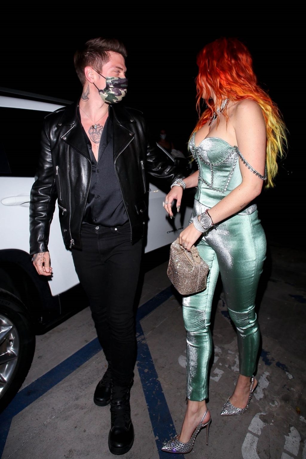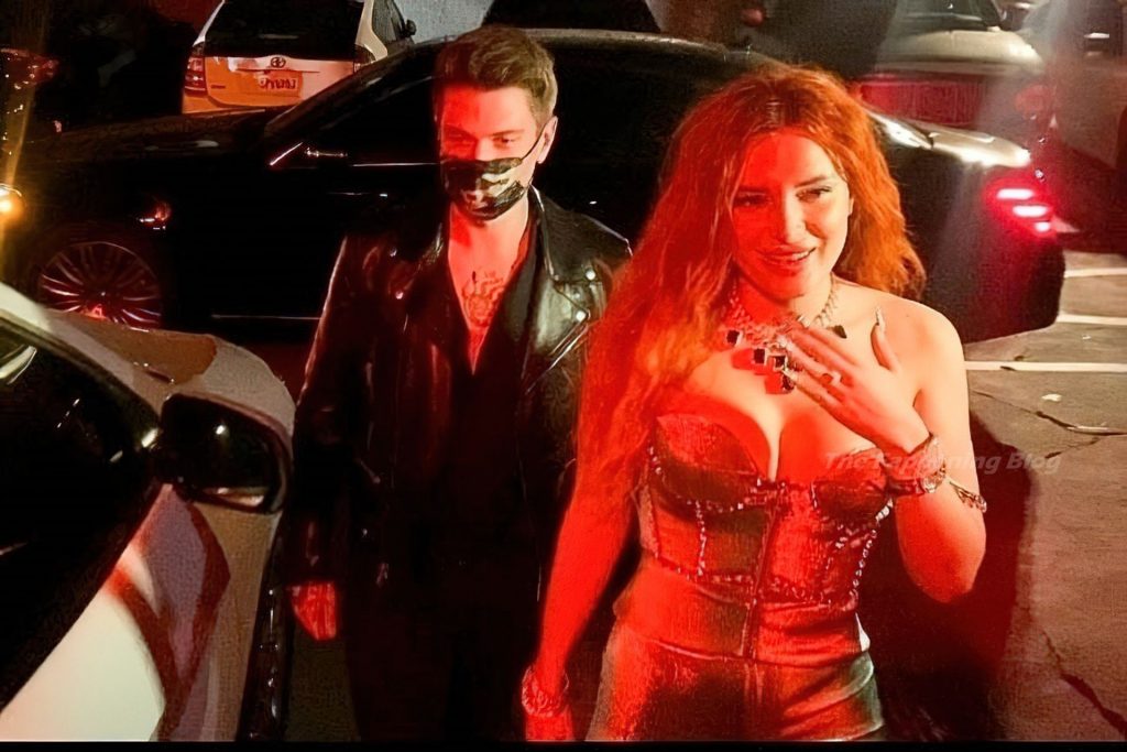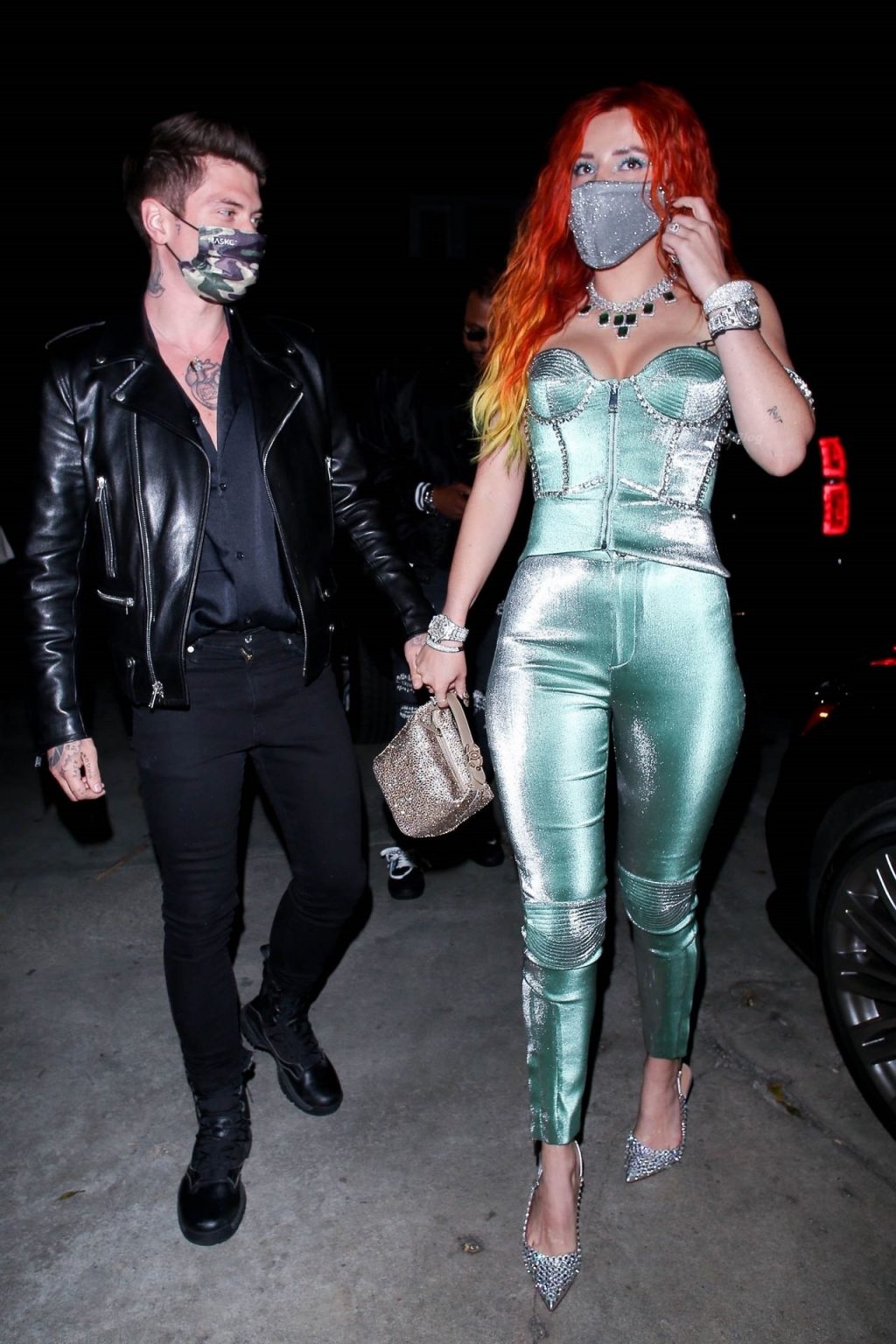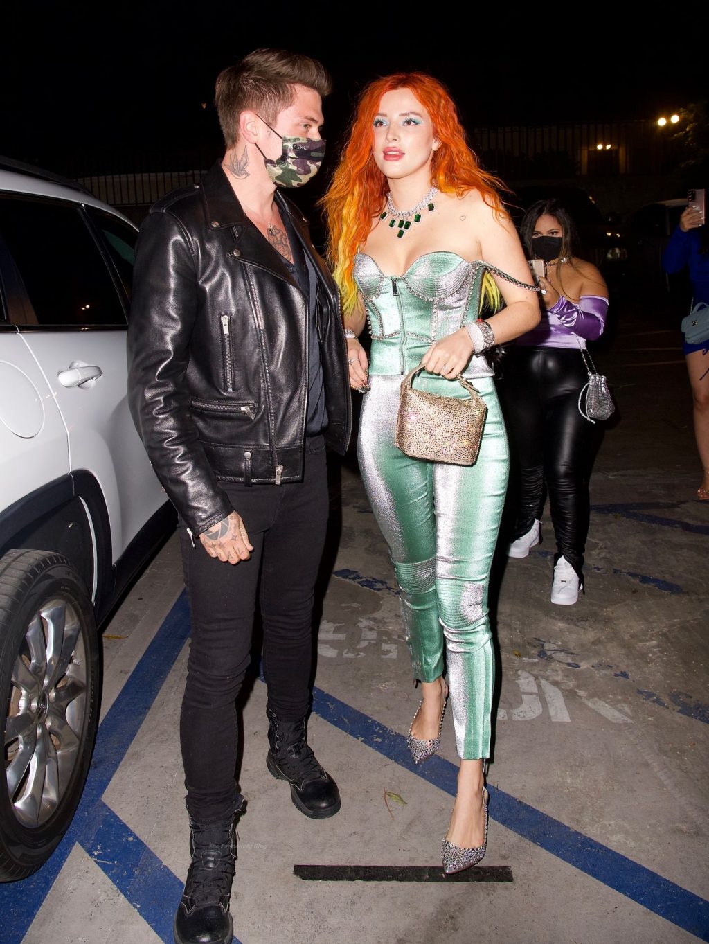 A estrela do Fappening Bella Thorne exibe seu anel de noivado com diamante enquanto celebra seu novo videoclipe com o noivo Benjamin Mascolo em Hollywood, 03/04/2021.