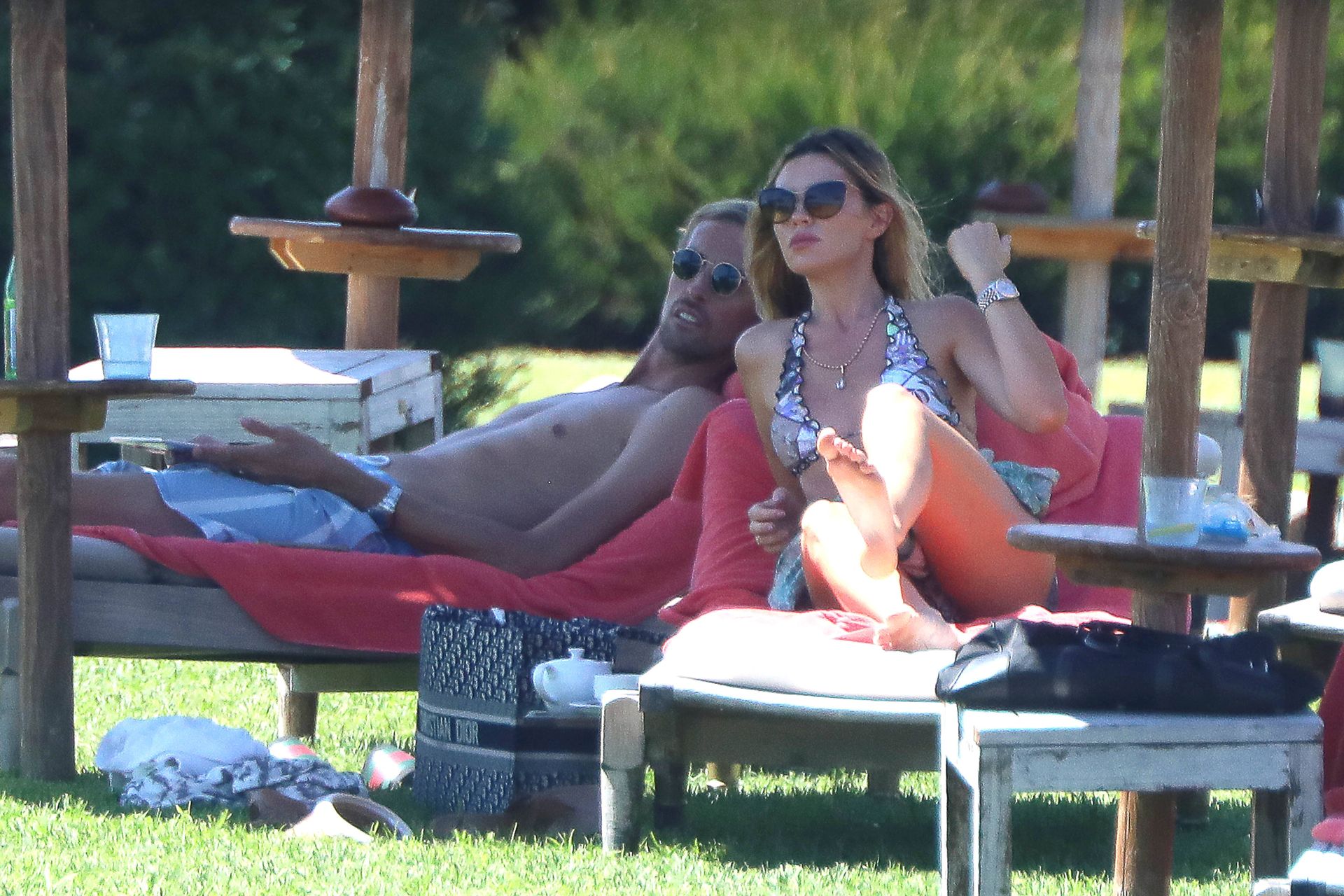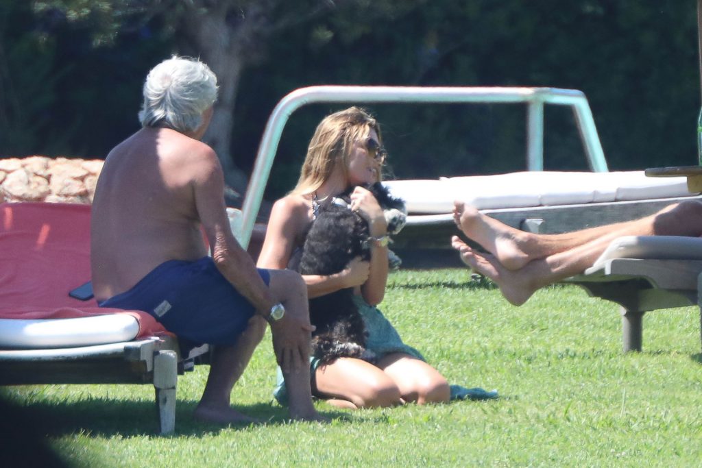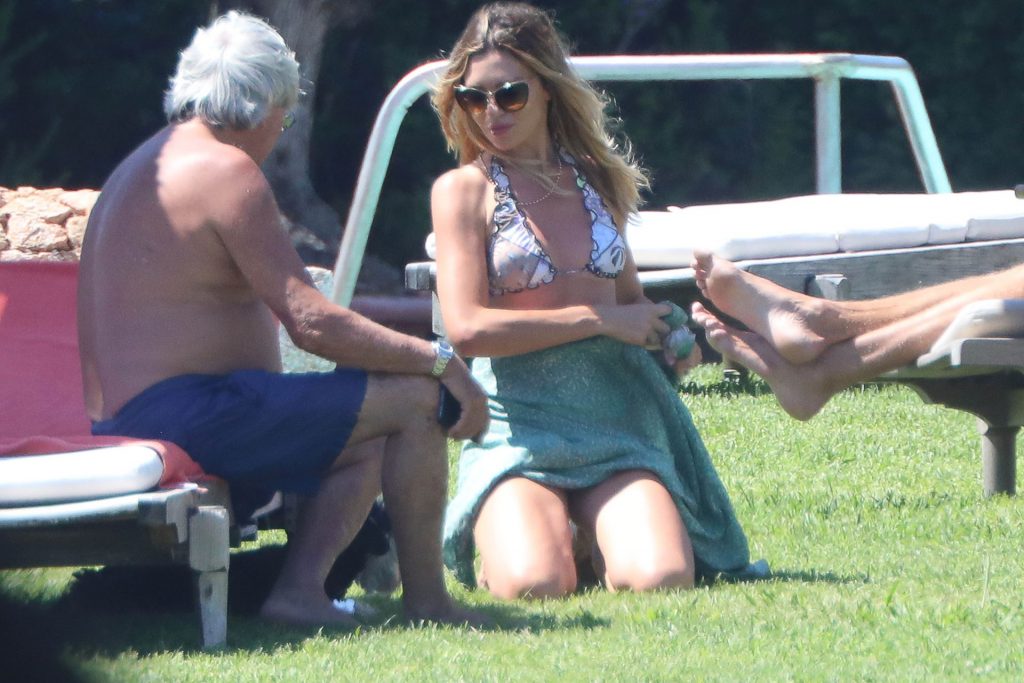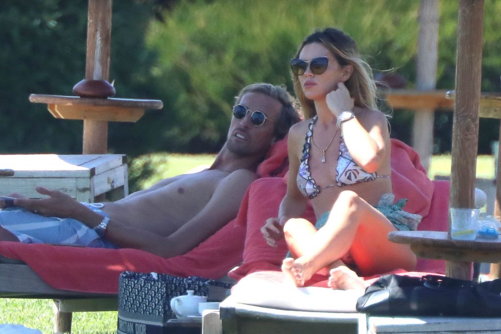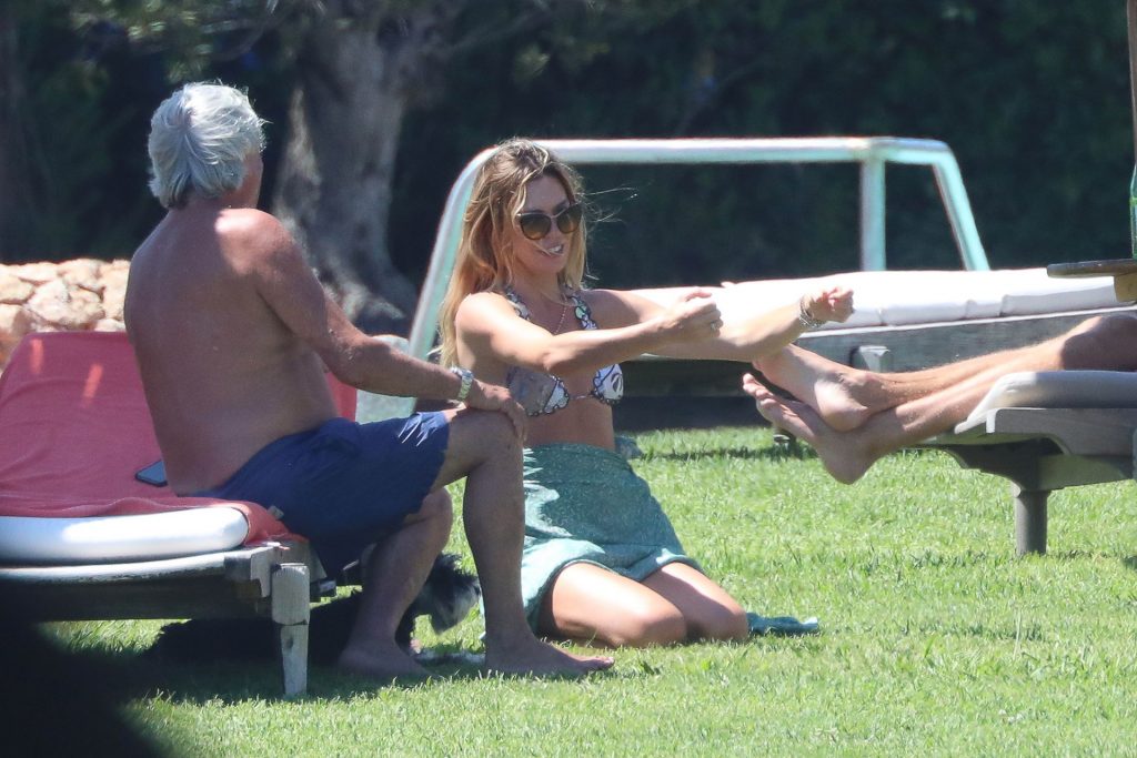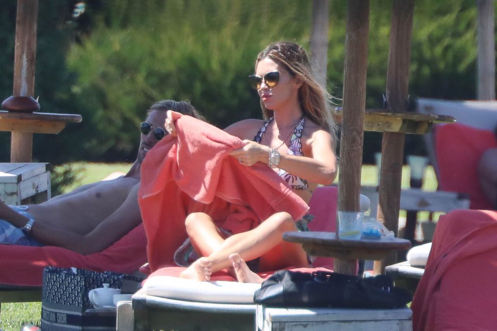 Abbey Clancy exibe seus abdominais definidos em um biquíni com babados enquanto relaxa nas férias com o marido Peter Crouch na Sardenha, 20/08/2020.