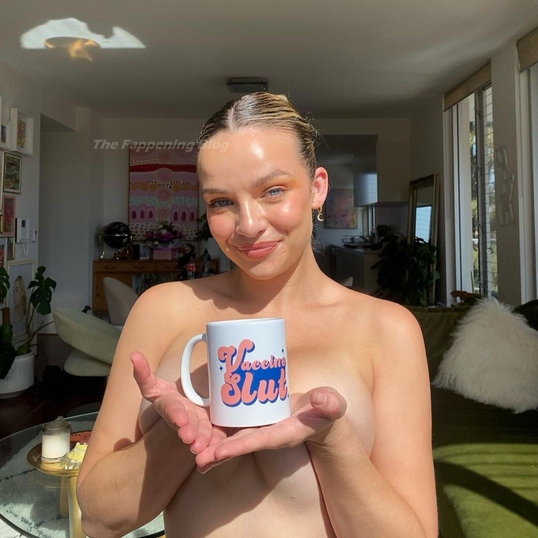 A estrela de reality show Abbie Chatfield posa topless, segurando uma caneca branca com as palavras “Vaccine Slut” – Instagram, 18/08/2021.
