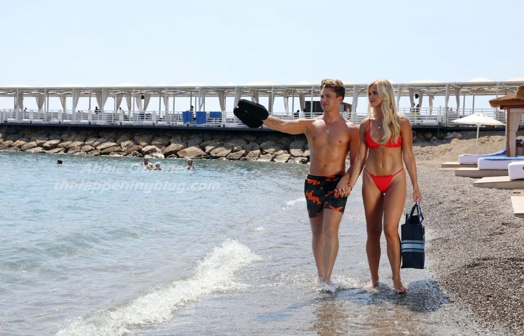 Abbie não passou despercebida também, pois ela usava um biquíni vermelho marcante exibindo seu corpo sexy de praia e figura atraente enquanto o casal dava um passeio sob o calor escaldante, literalmente fazendo as temperaturas subirem.