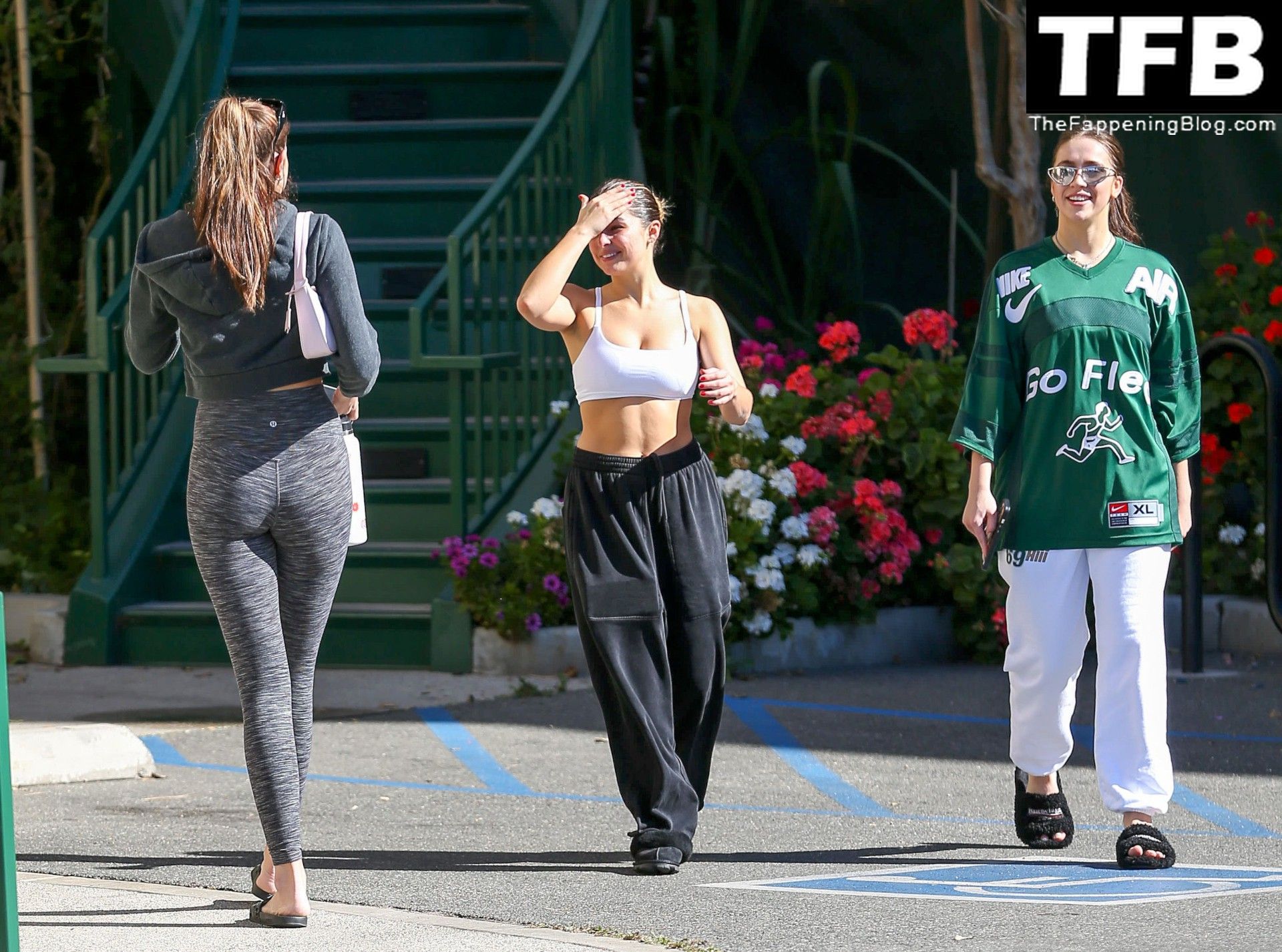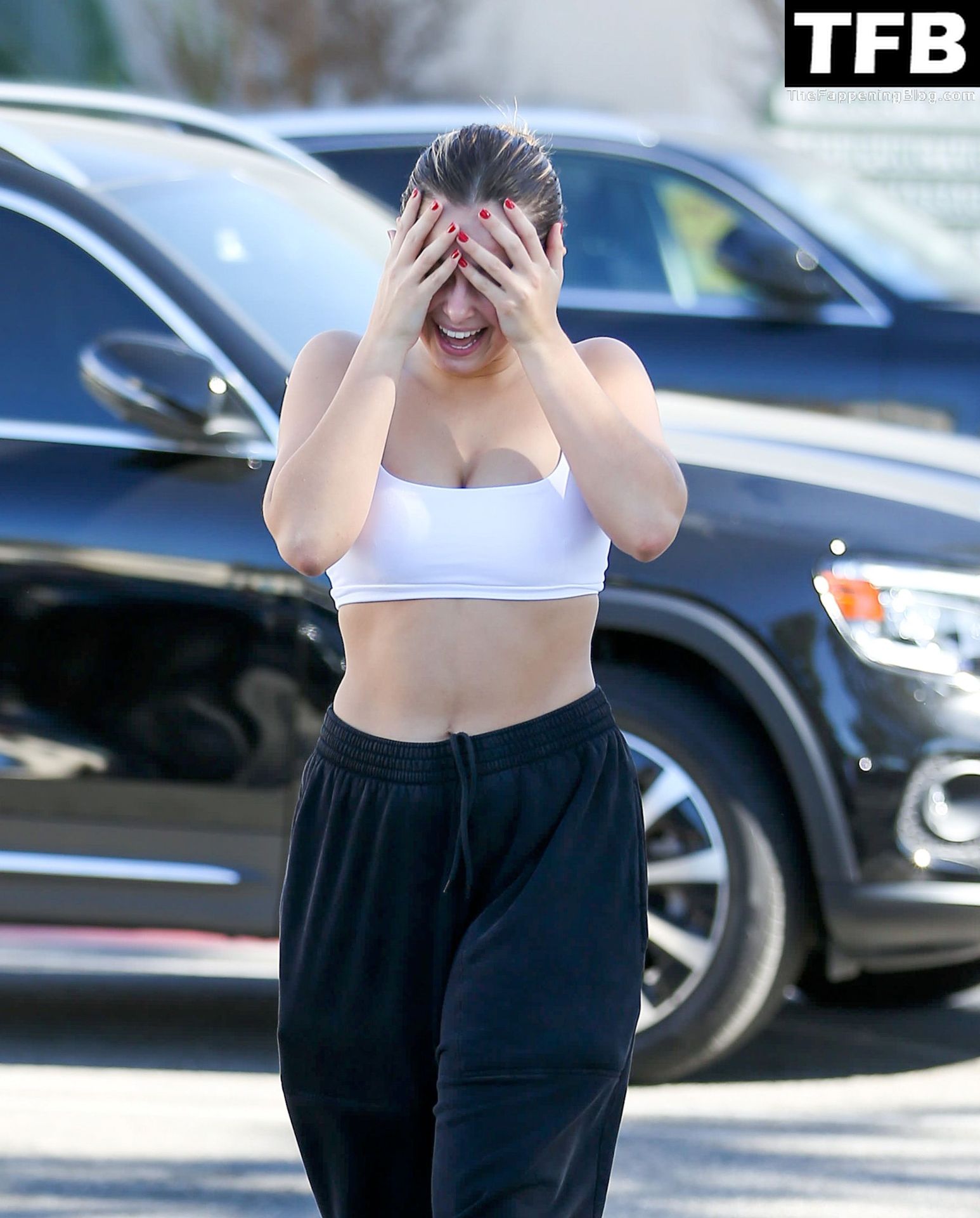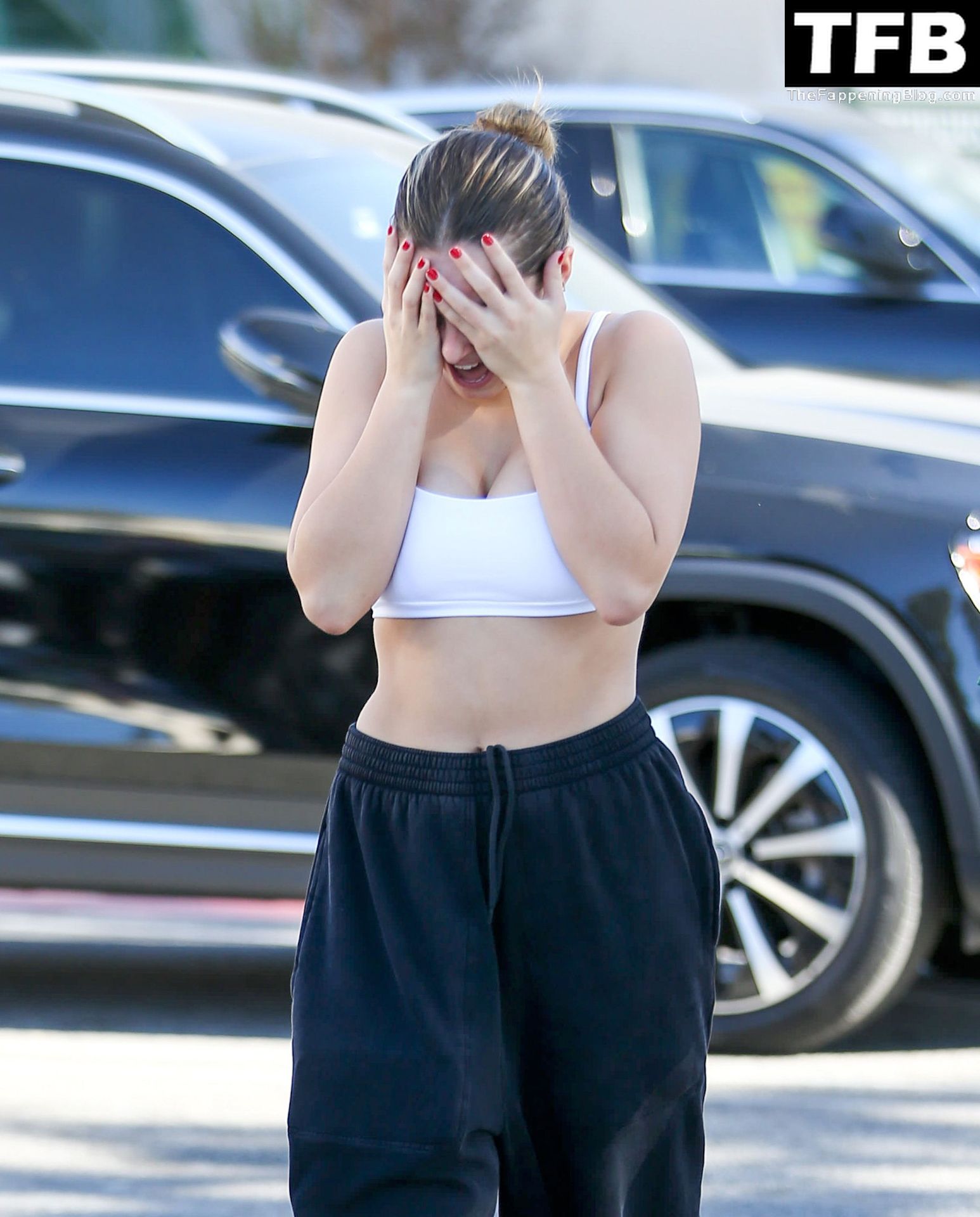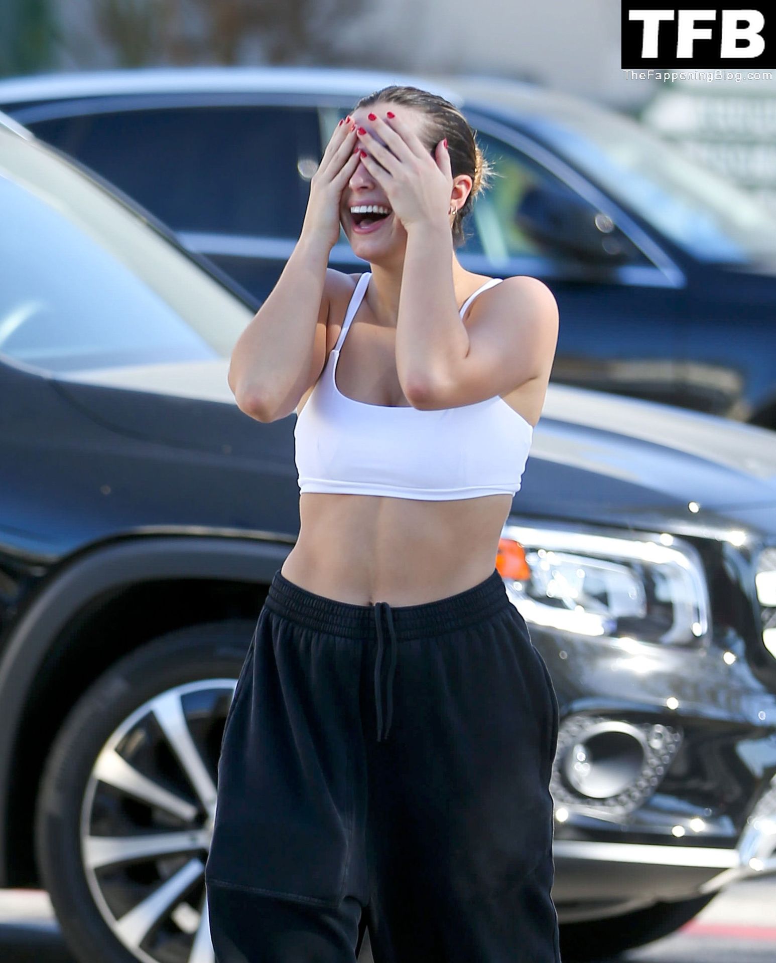 A estrela do TikTok Addison Rae está toda sorrisos enquanto cobre o rosto ao sair de uma aula de Pilates em West Hollywood, 17/02/2022.