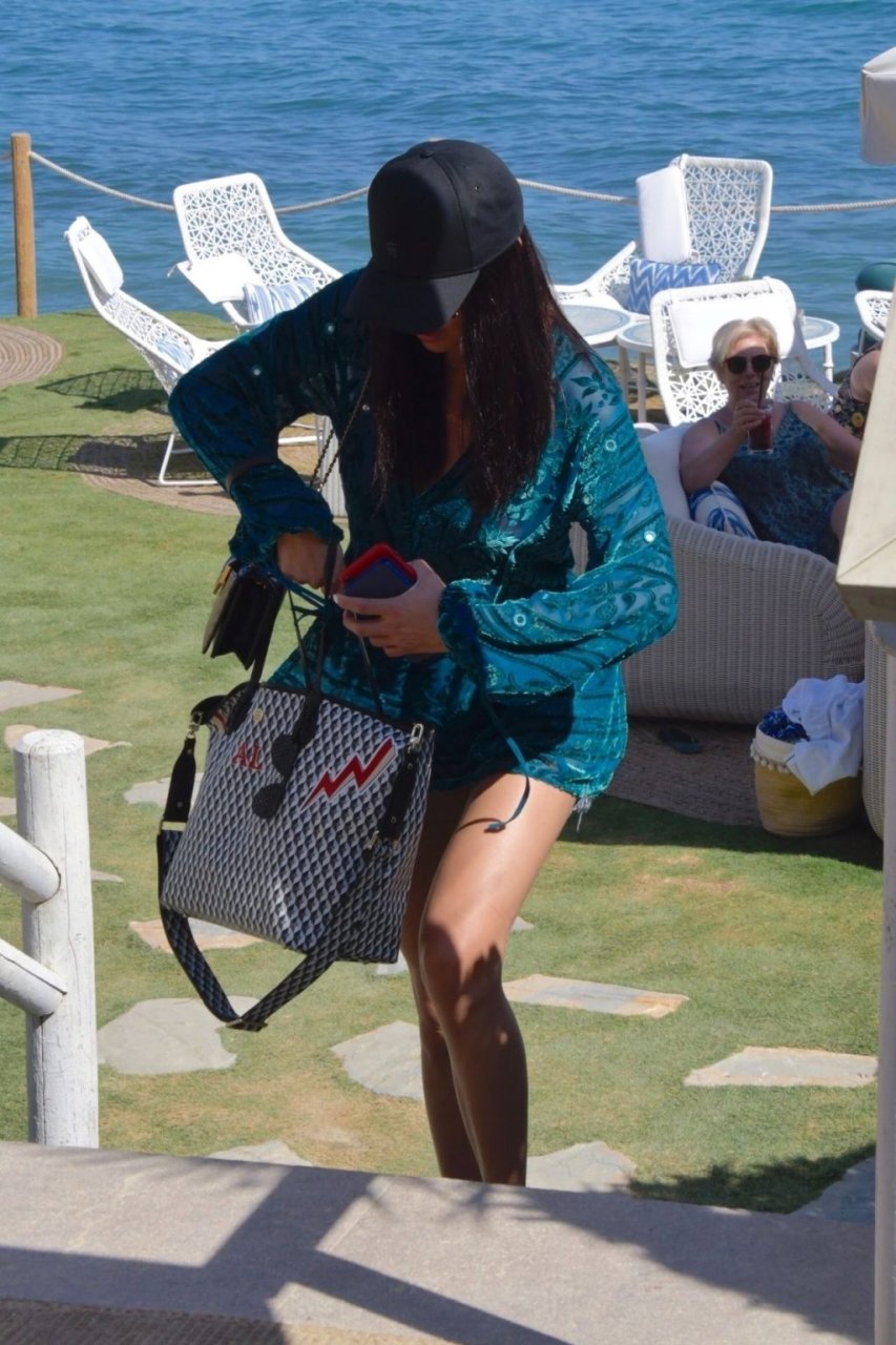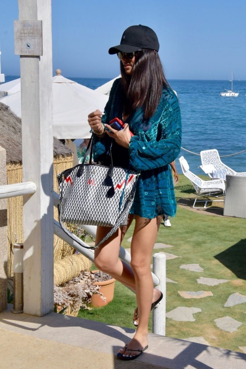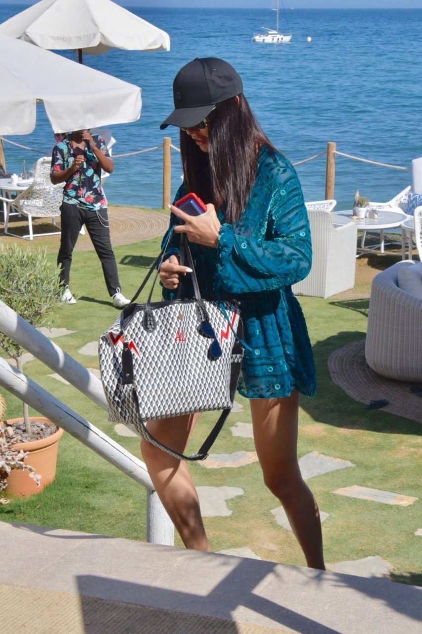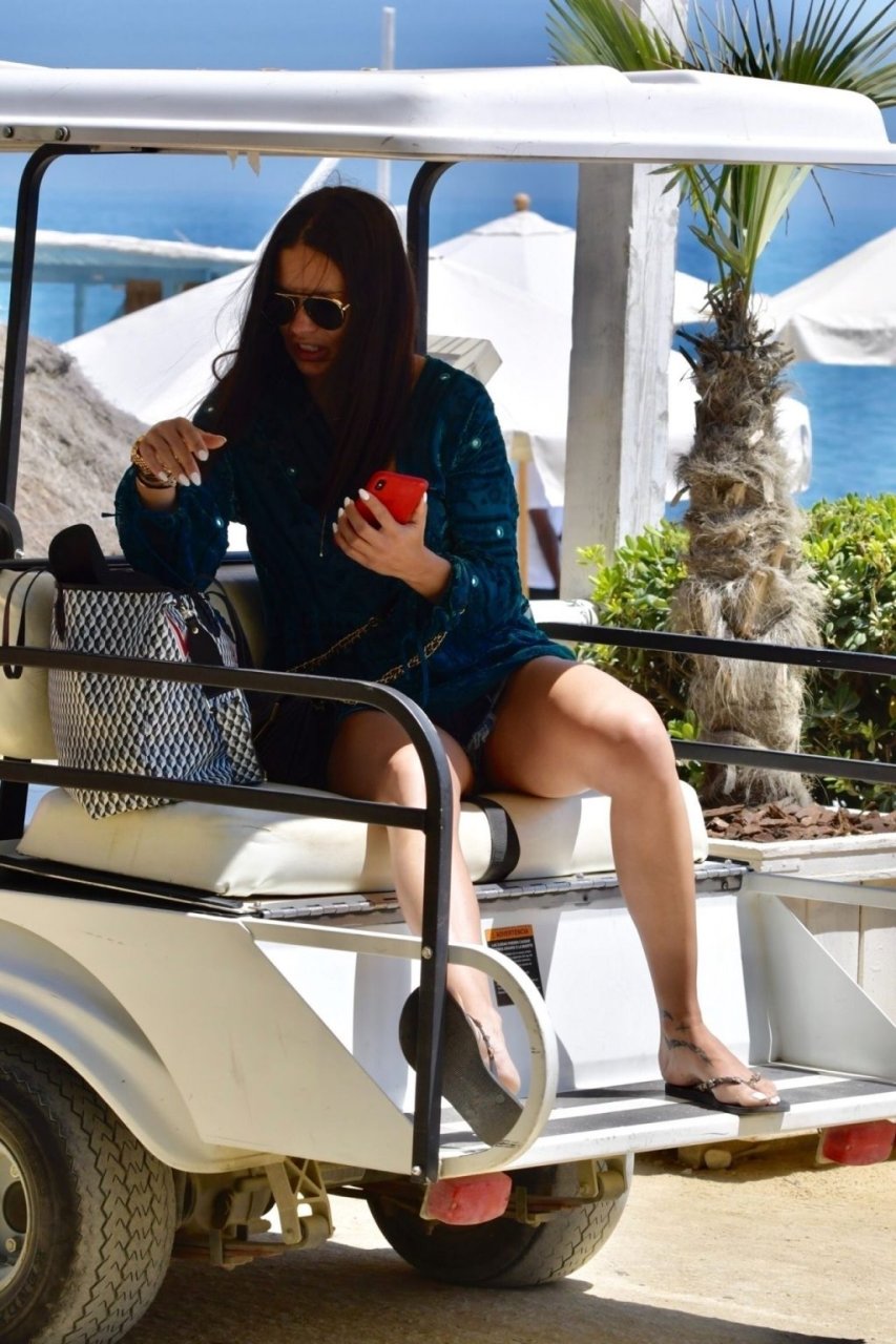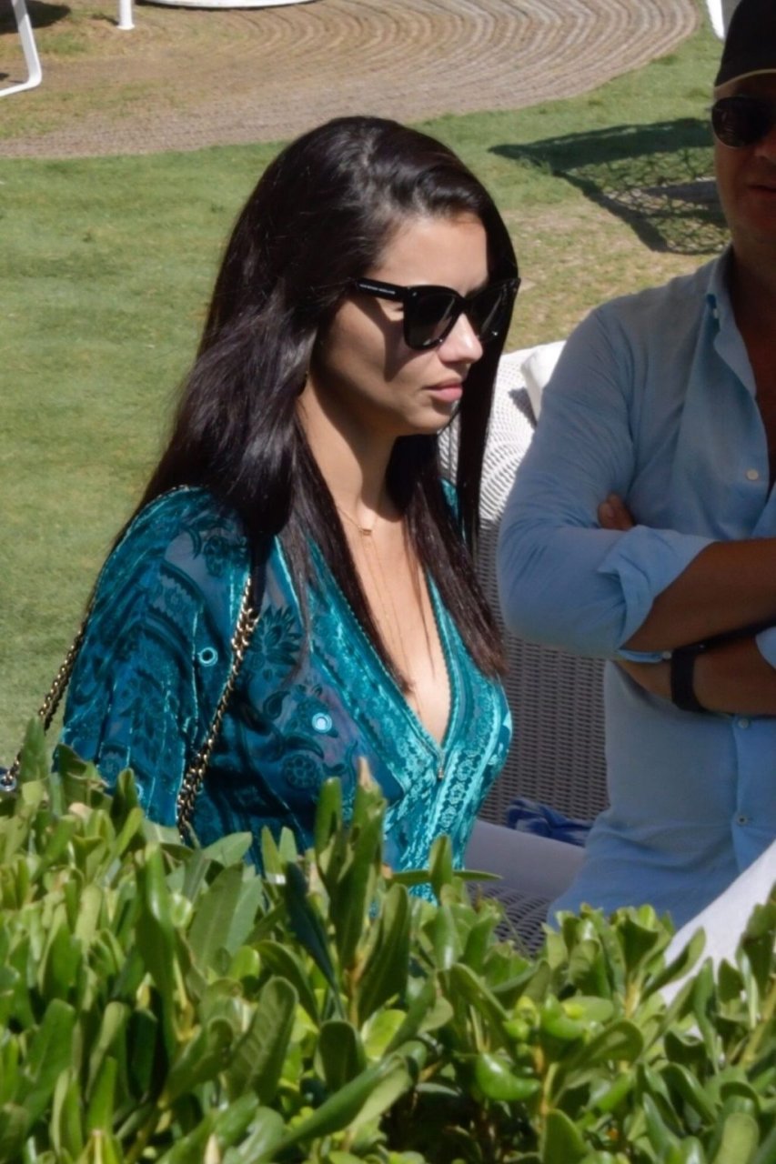Model Adriana Lima aproveita suas férias em um clube de praia em Marbella, 29/07/2019. Adriana está ótima com um vestido mini azul como saída de praia enquanto é vista curtindo o sol.