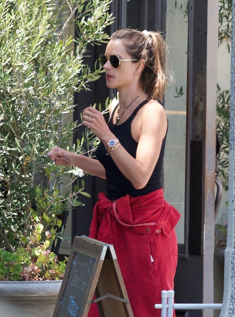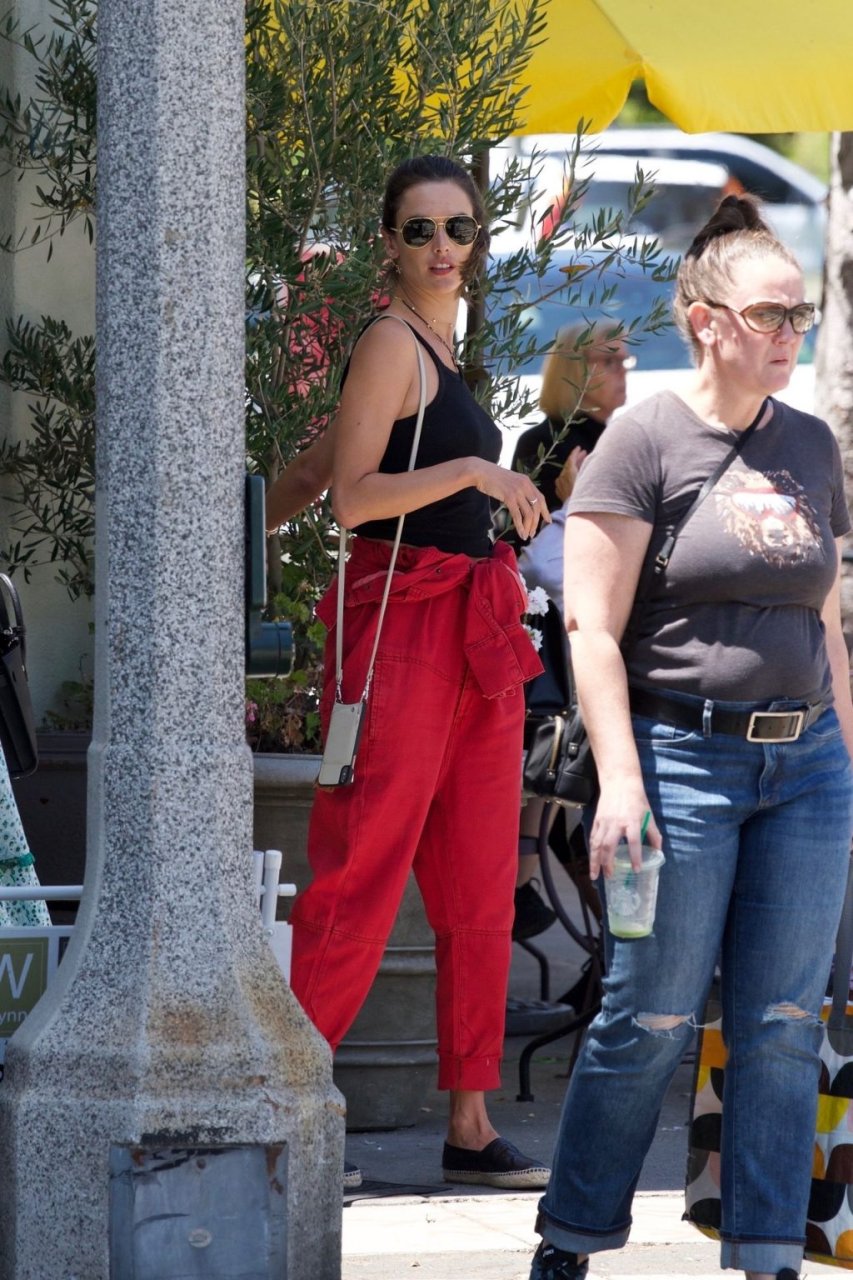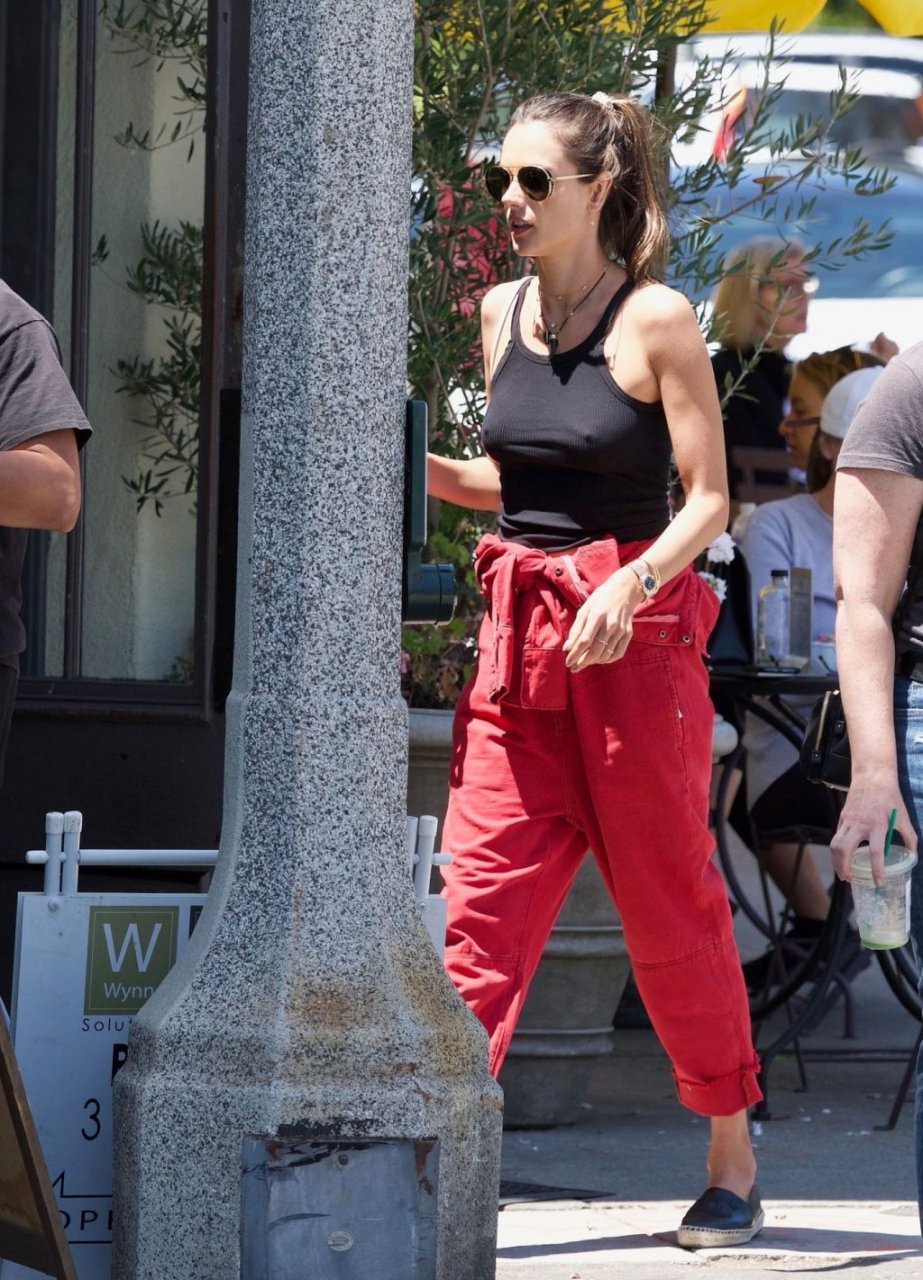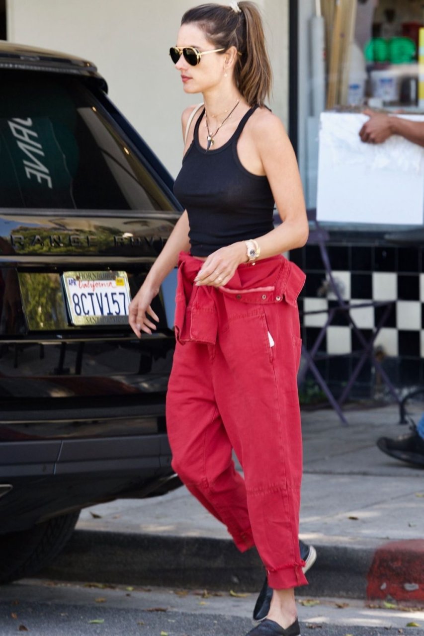 Alessandra Ambrosio e sua irmã param em uma padaria local para comprar algumas guloseimas – Los Angeles, 05/05/2019. A beleza brasileira optou por um visual casual, usando uma regata preta e sem sutiã com calças vermelhas.