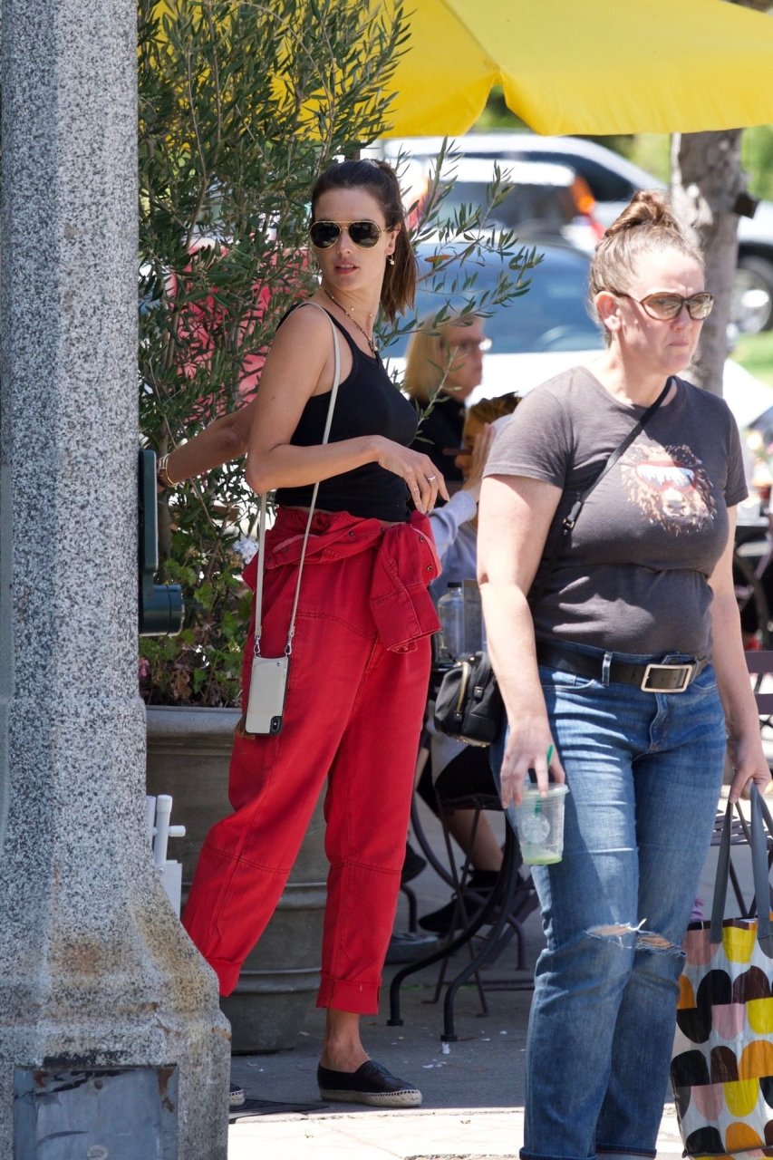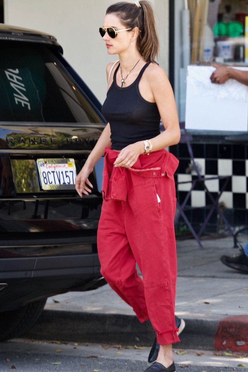 Alessandra Ambrosio e sua irmã param em uma padaria local para comprar algumas guloseimas – Los Angeles, 05/05/2019. A beleza brasileira optou por um visual casual, usando uma regata preta e sem sutiã com calças vermelhas.