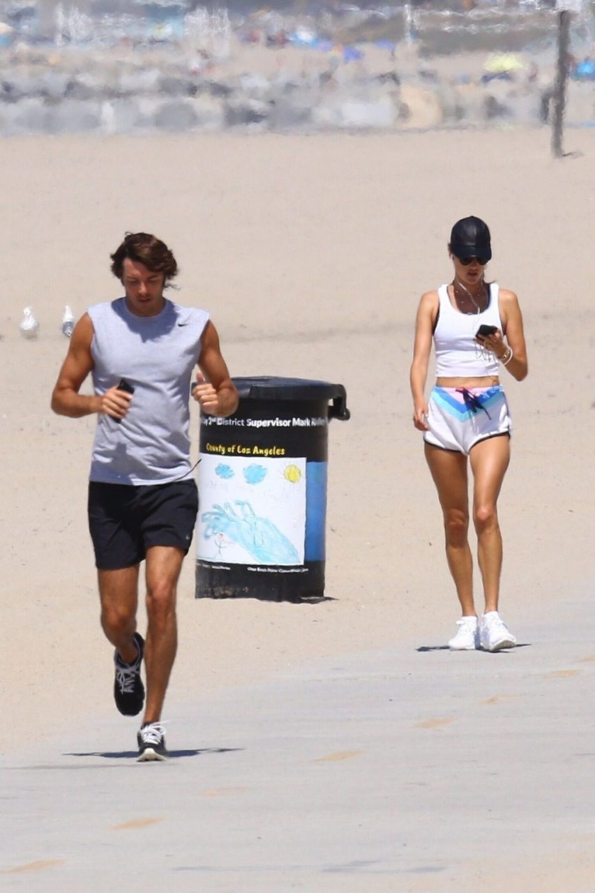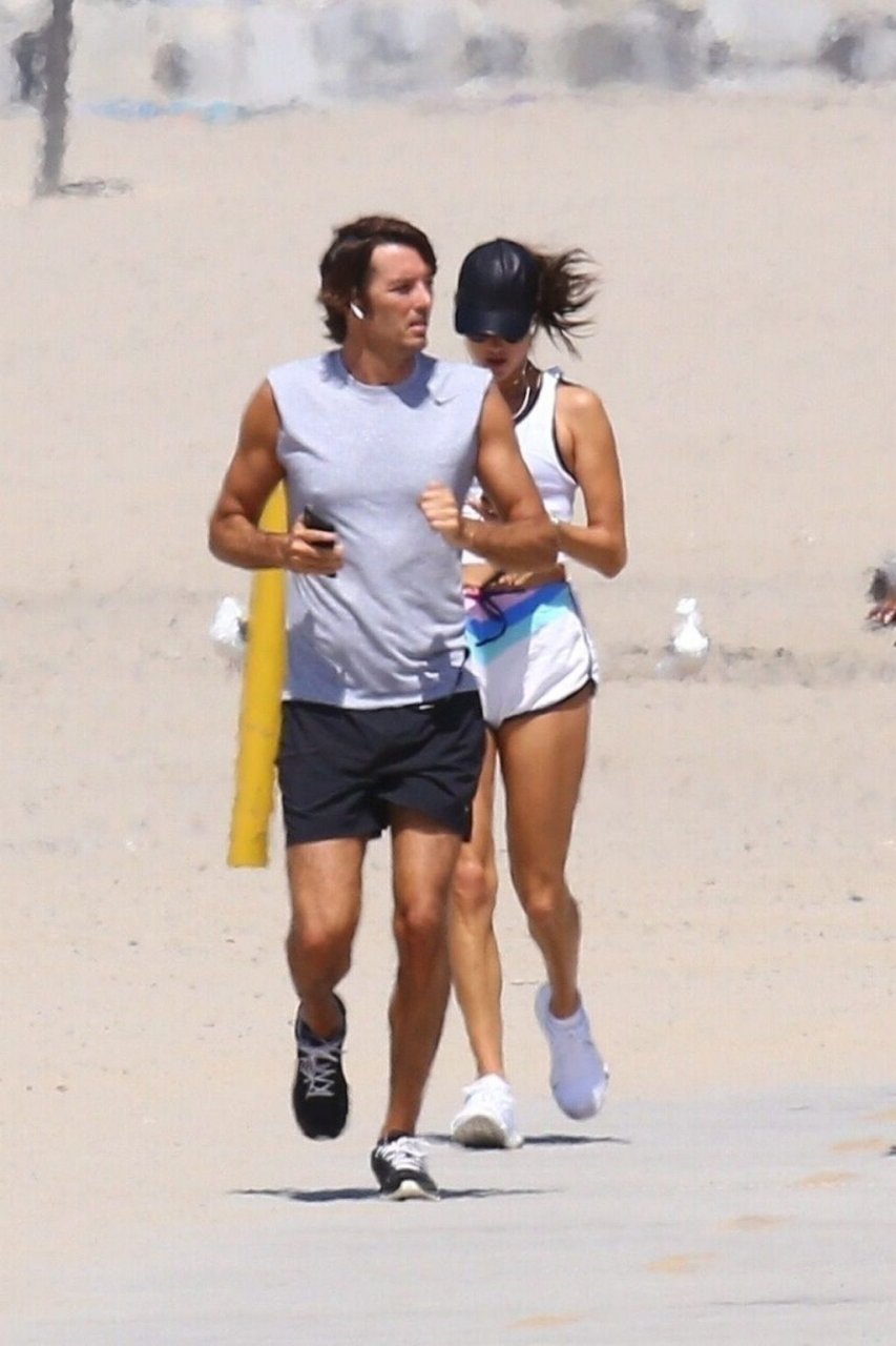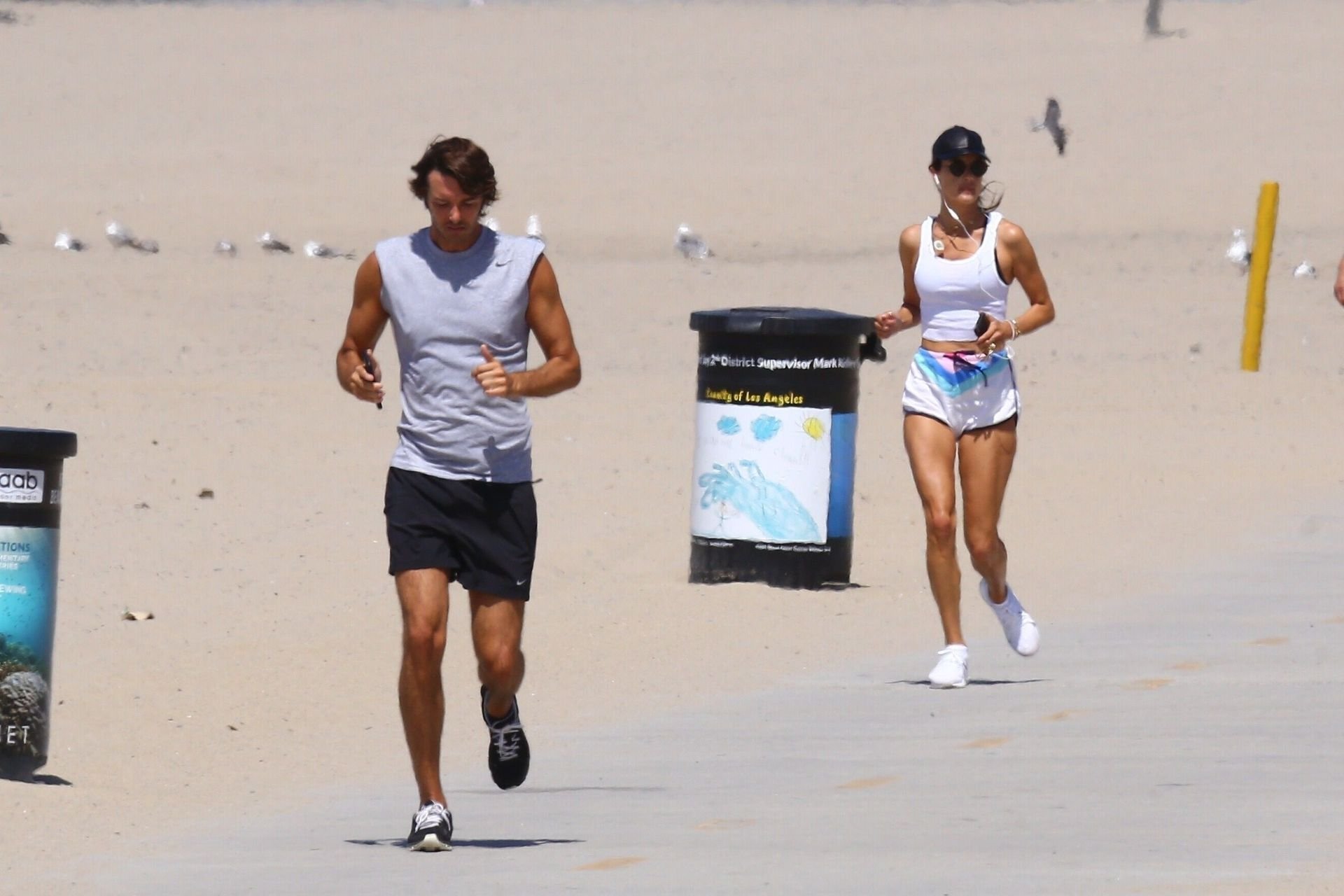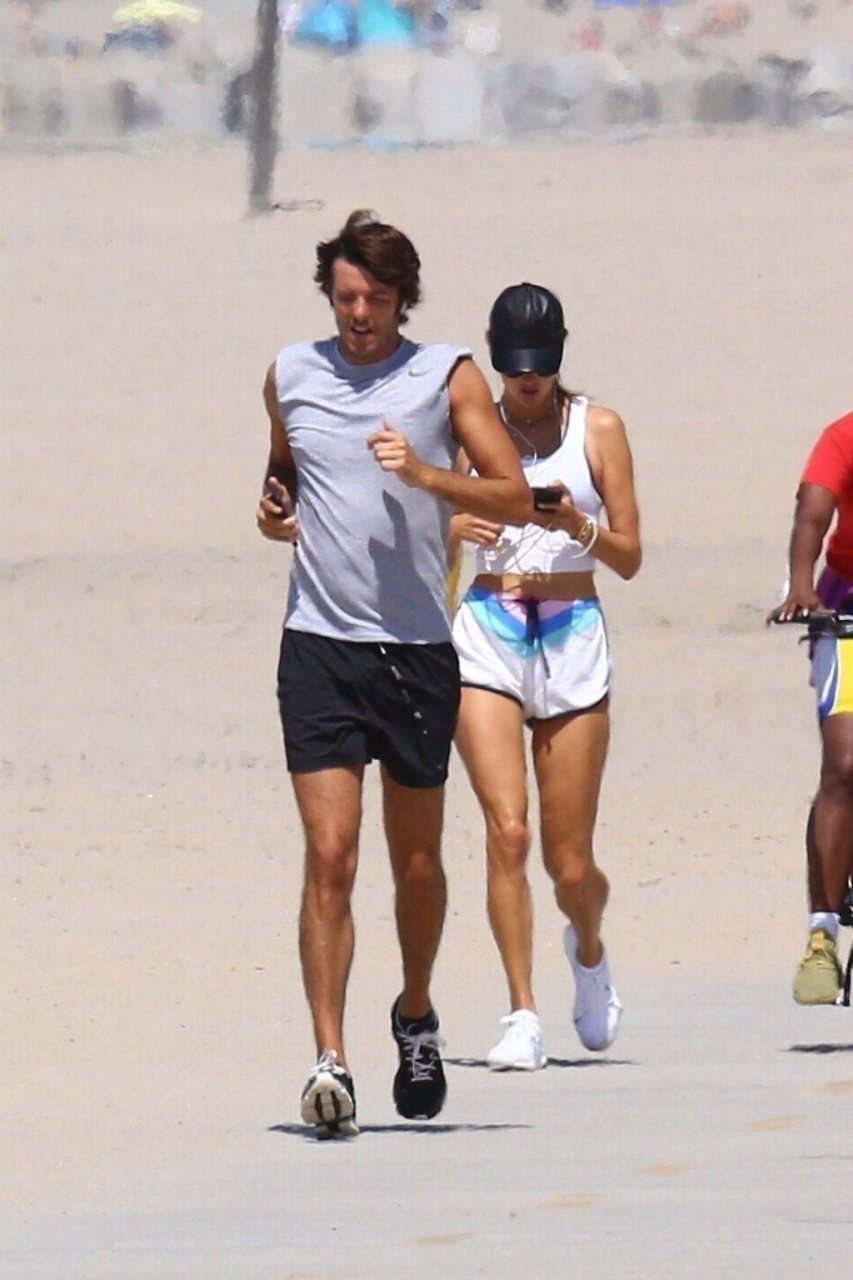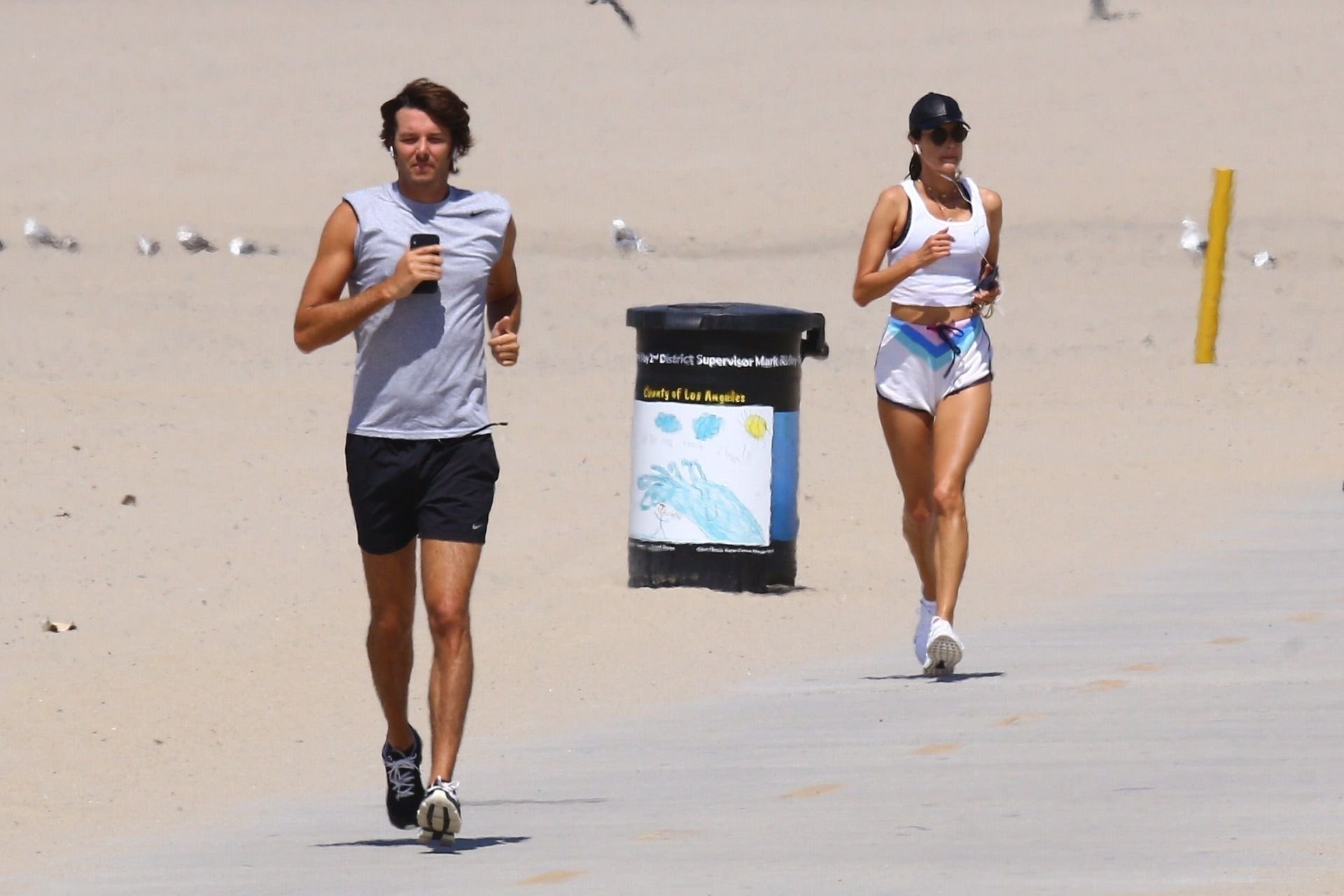 Alessandra Ambrosio e seu namorado Nicolo Oddi fazem uma corrida juntos na praia, 10/08/2019. A dupla parece casual enquanto aproveita seu exercício cênico.
