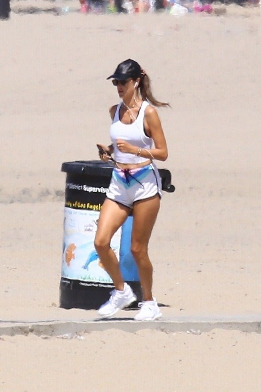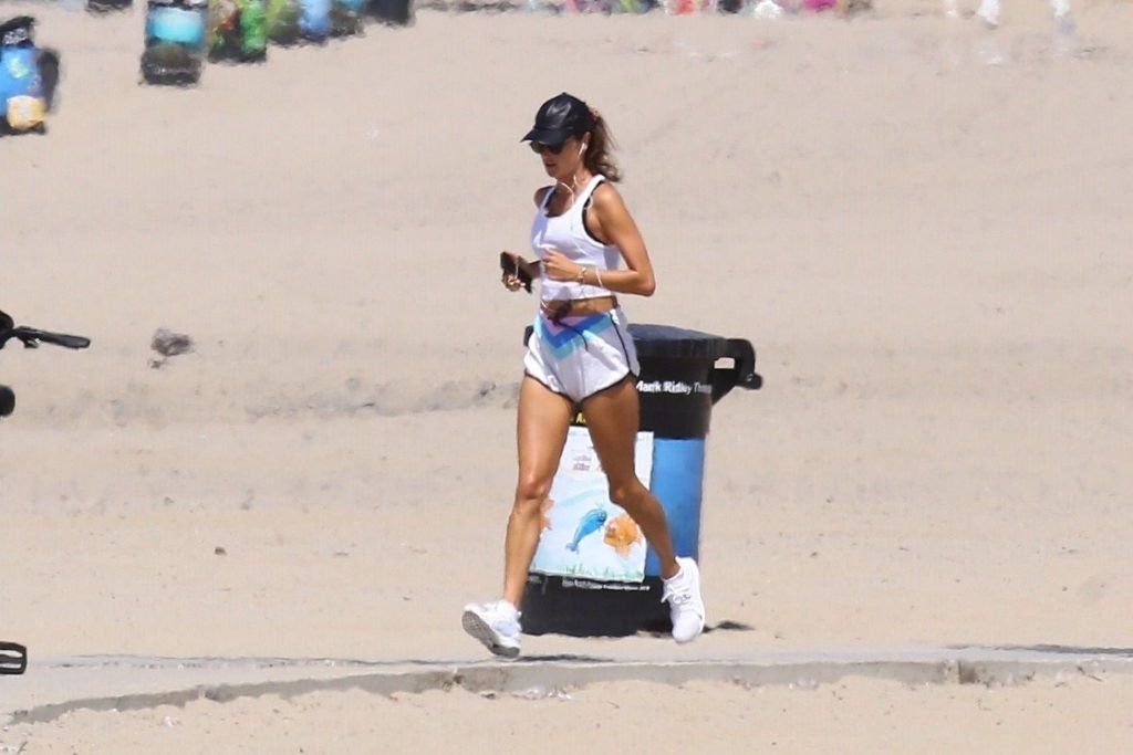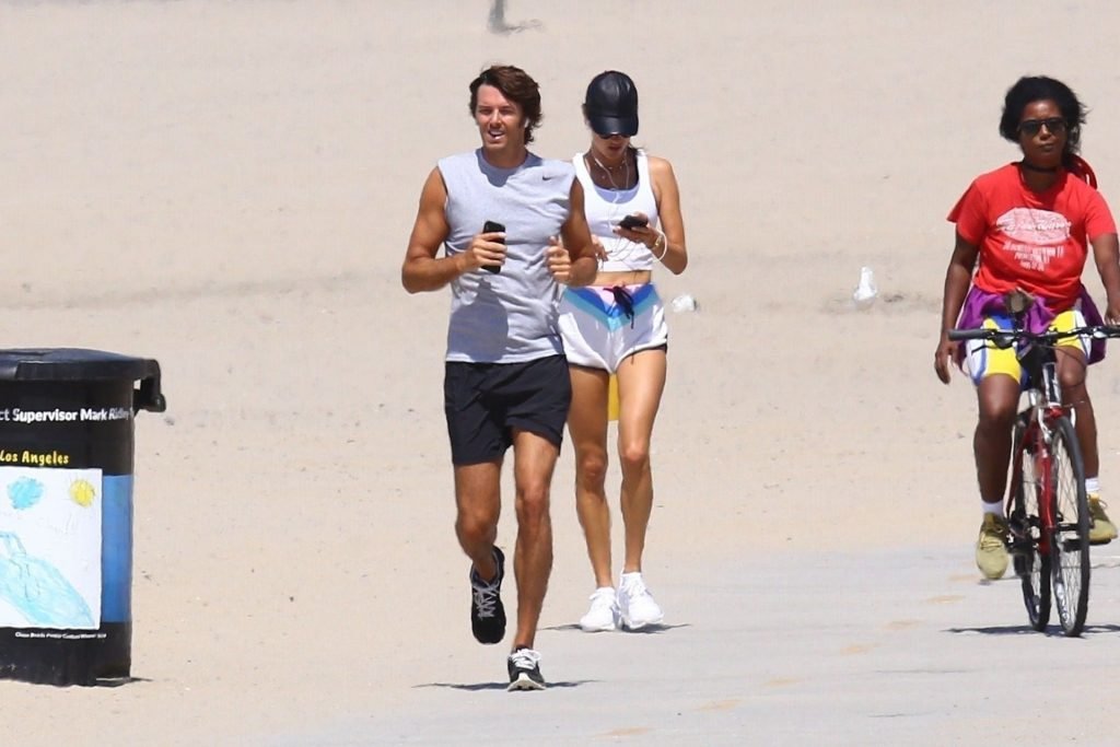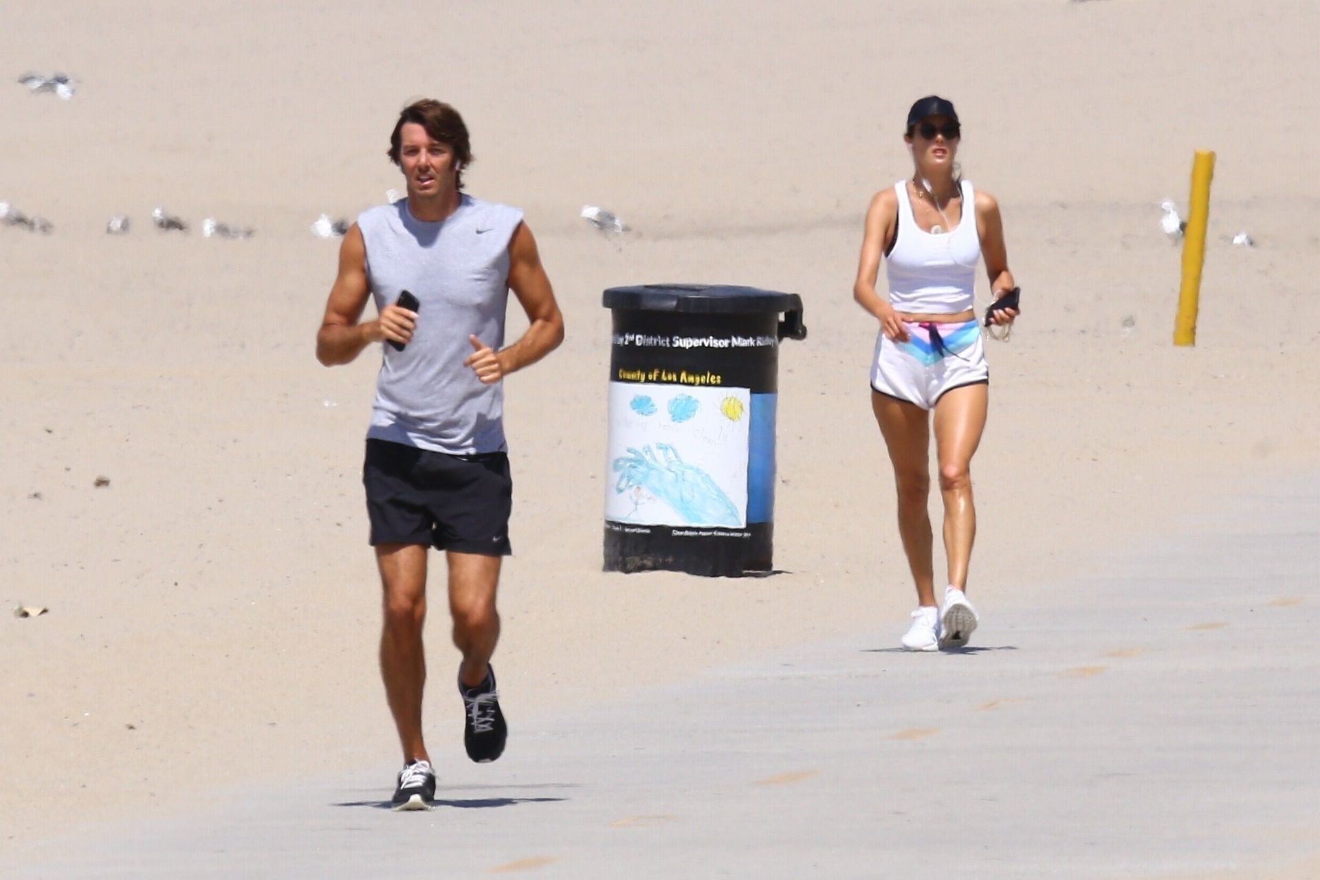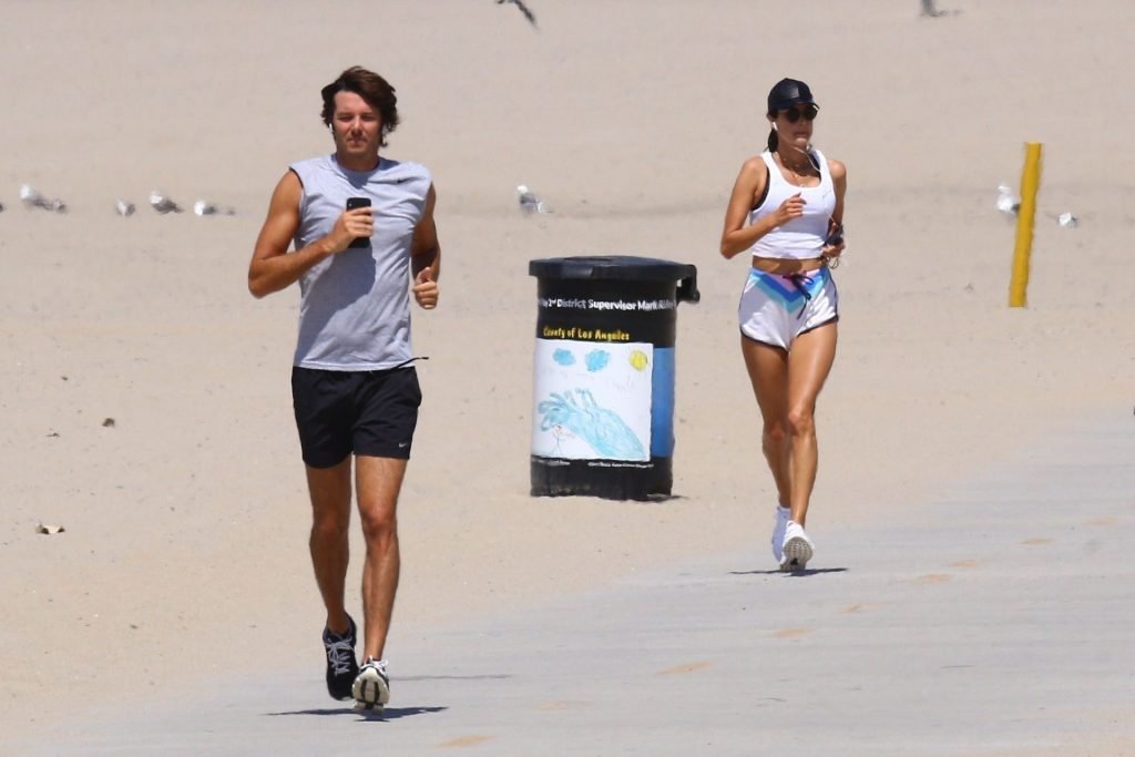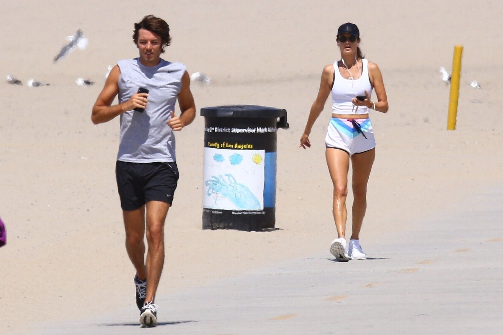 Alessandra Ambrosio e seu namorado Nicolo Oddi fazem uma corrida juntos na praia, 10/08/2019. A dupla parece casual enquanto aproveita seu exercício cênico.