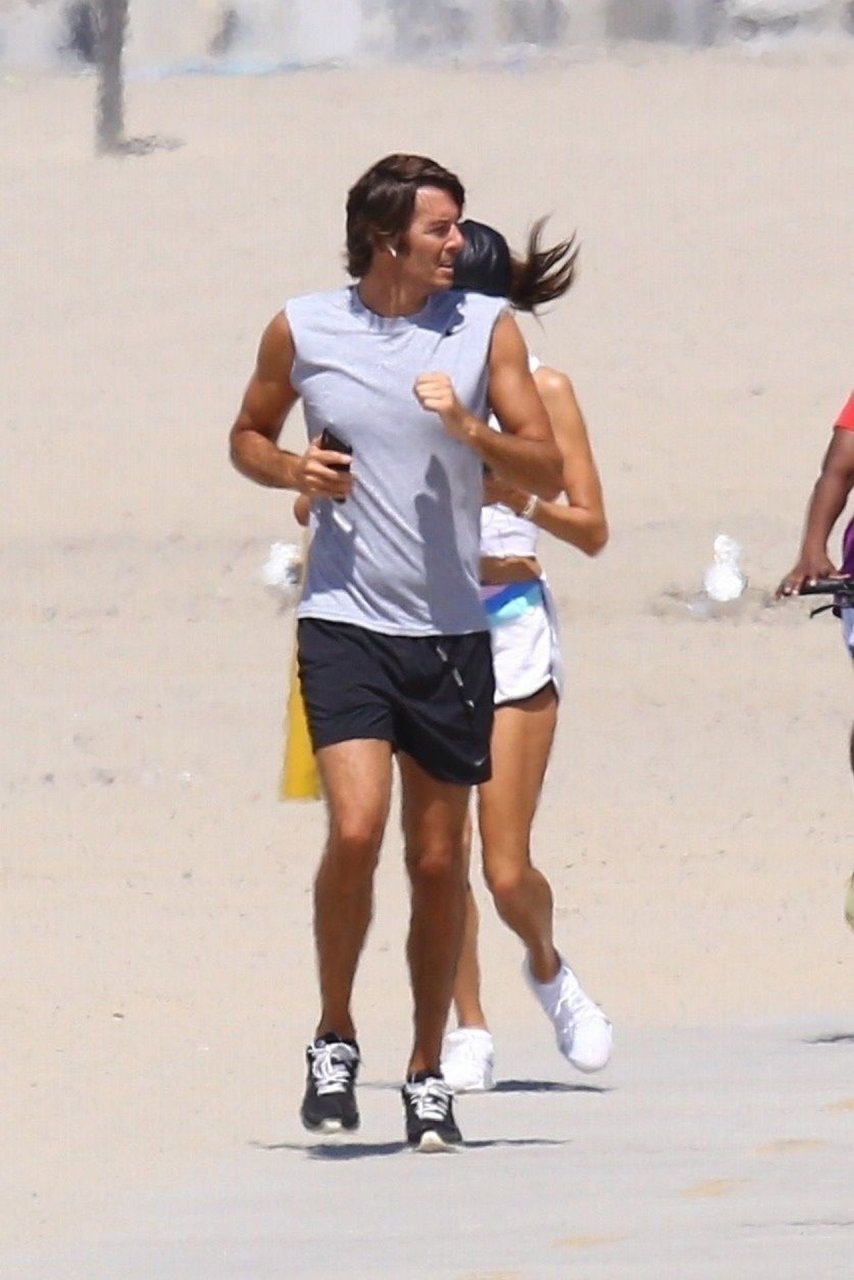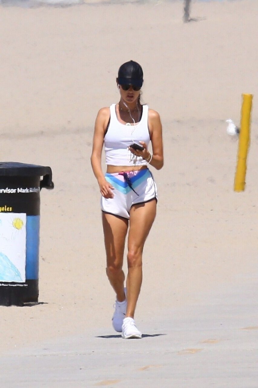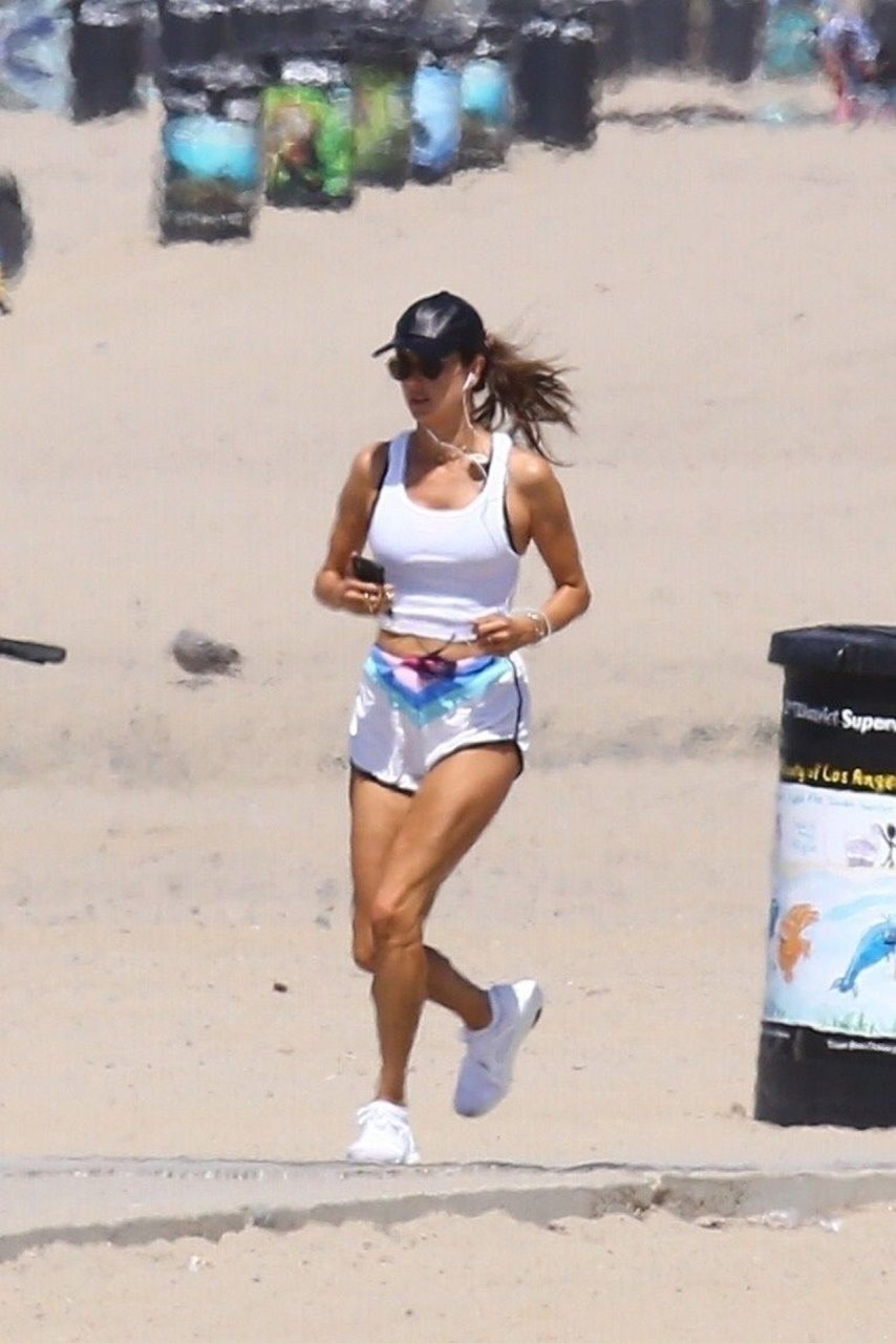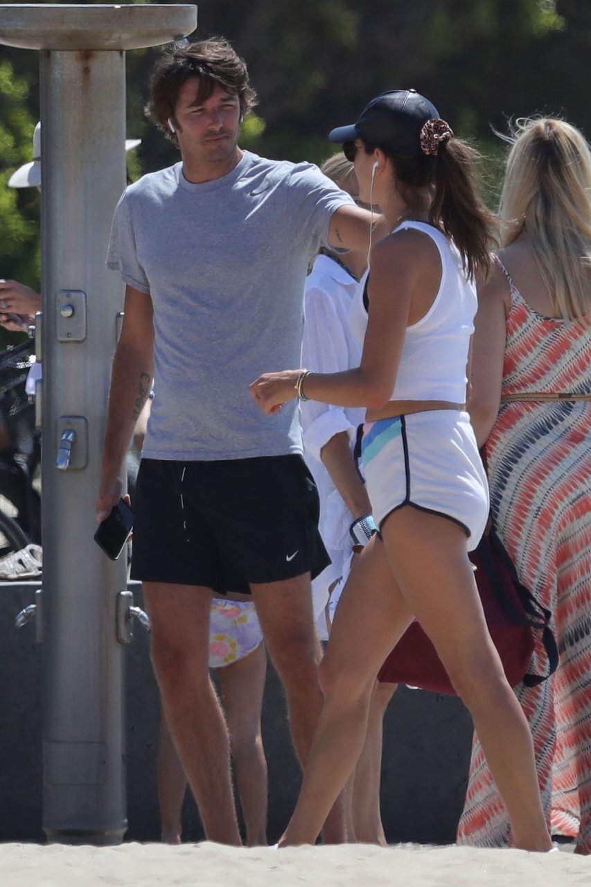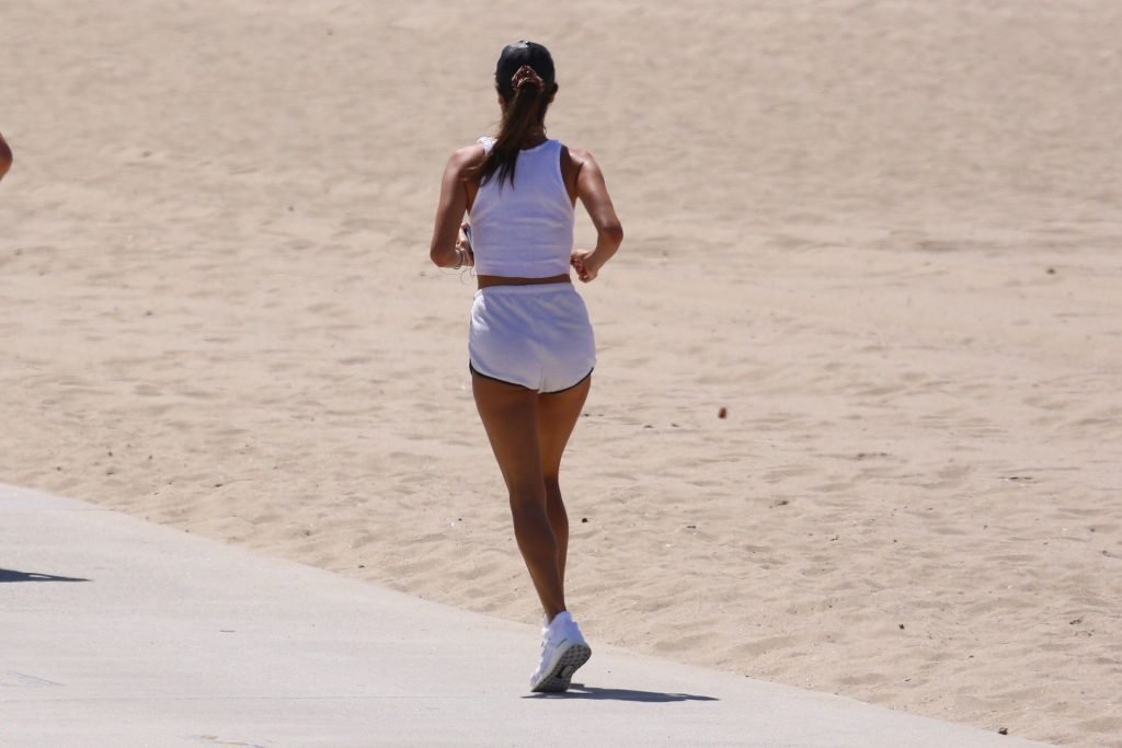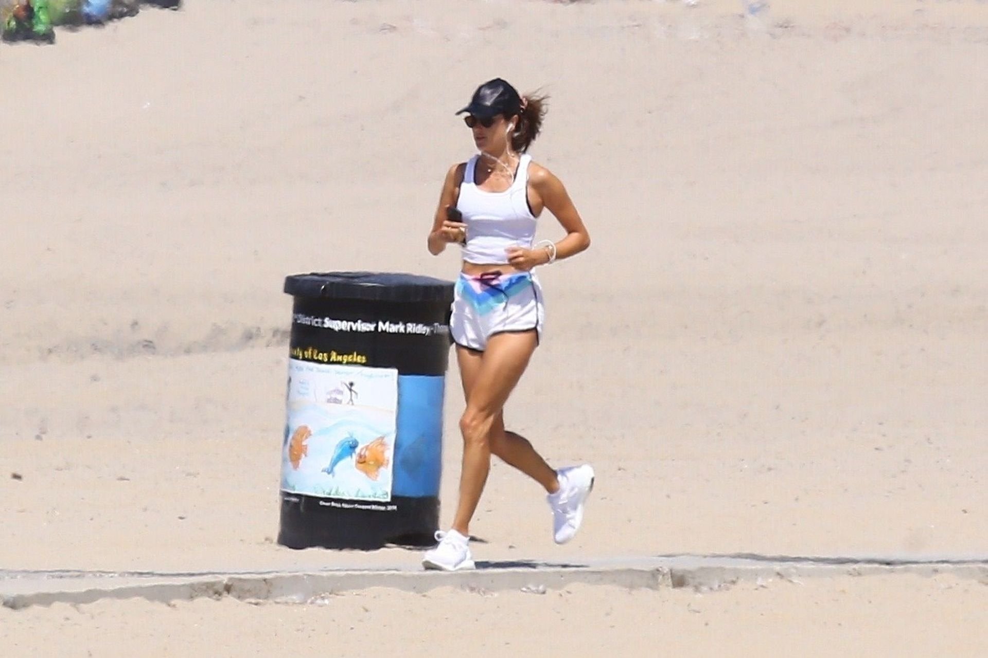 Alessandra Ambrosio e seu namorado Nicolo Oddi fazem uma corrida juntos na praia, 10/08/2019. A dupla parece casual enquanto aproveita seu exercício cênico.