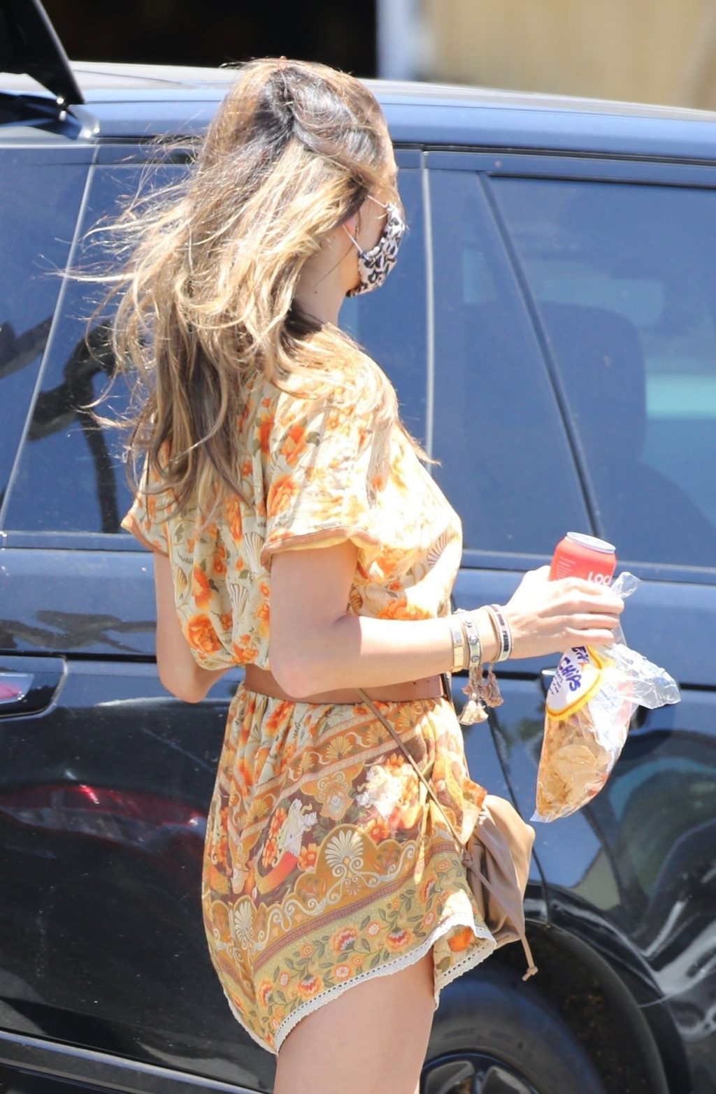 A supermodelo Alessandra Ambrosio foi vista com um estilo elegante em um macacão curto de estilo boêmio, sandálias, uma bolsa transversal e uma máscara de onça para a viagem a um Bristol Farms lotado em Santa Monica, 09/06/2020. A modelo da Victoria’s Secret comprou muitas flores e uma grande carga de mantimentos.