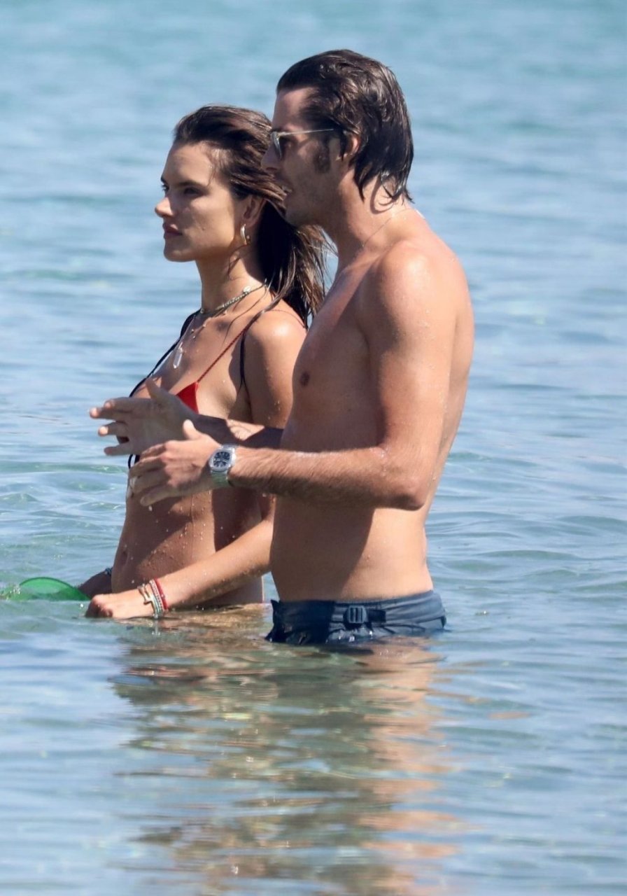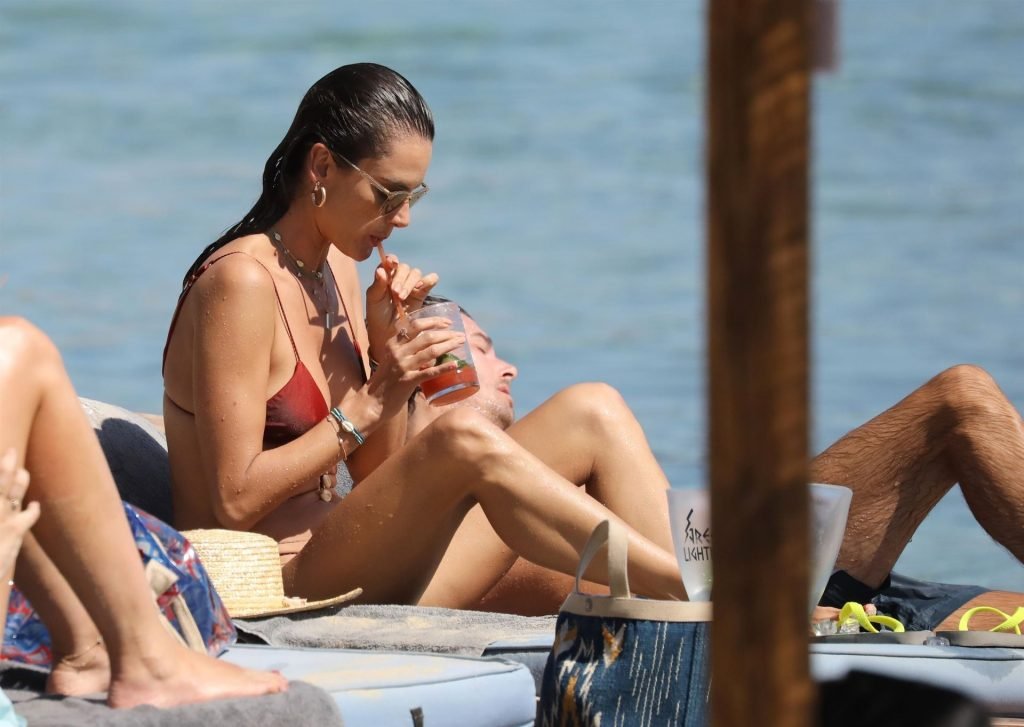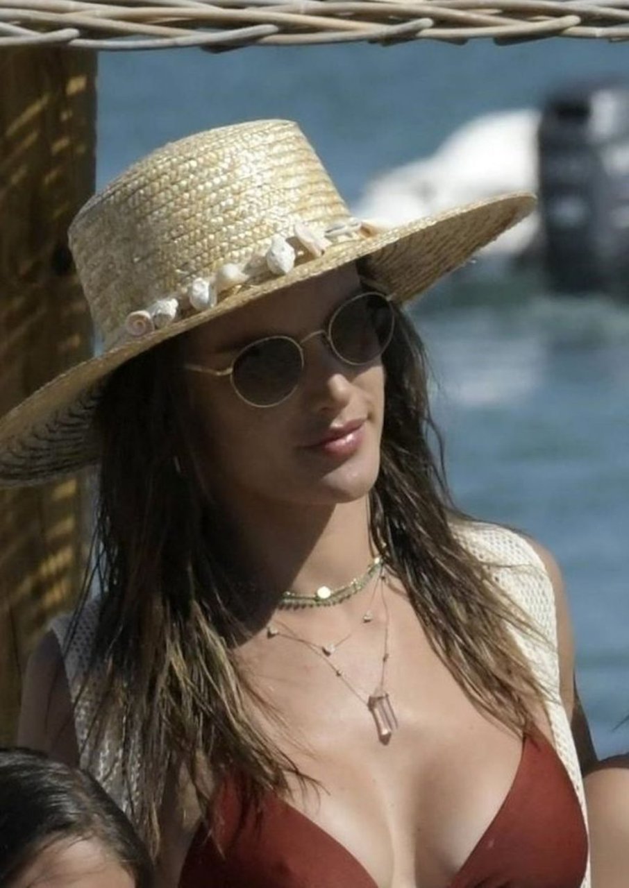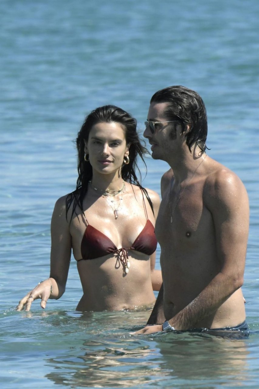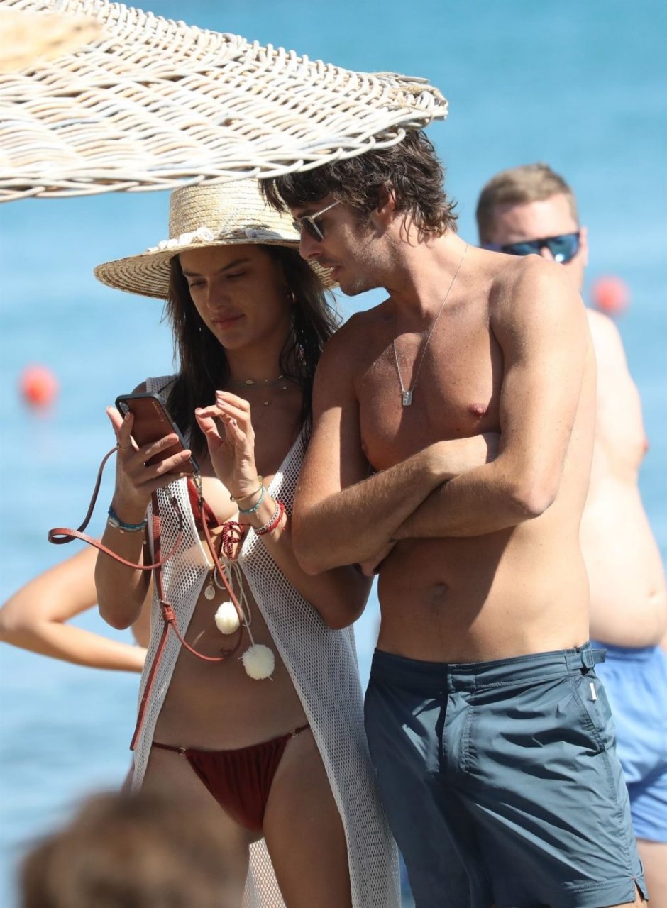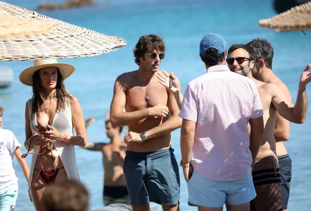 A supermodelo Alessandra Ambrosio e seu novo namorado Nicolo Oddi foram vistos em Mykonos junto com seus amigos Ana Beatriz Barros e seu marido empresário Karim El Chiaty, além do ex-noivo de Ambrosio, Jamie Mazur, e seus filhos Anja e Noah, em 13/07/2019.