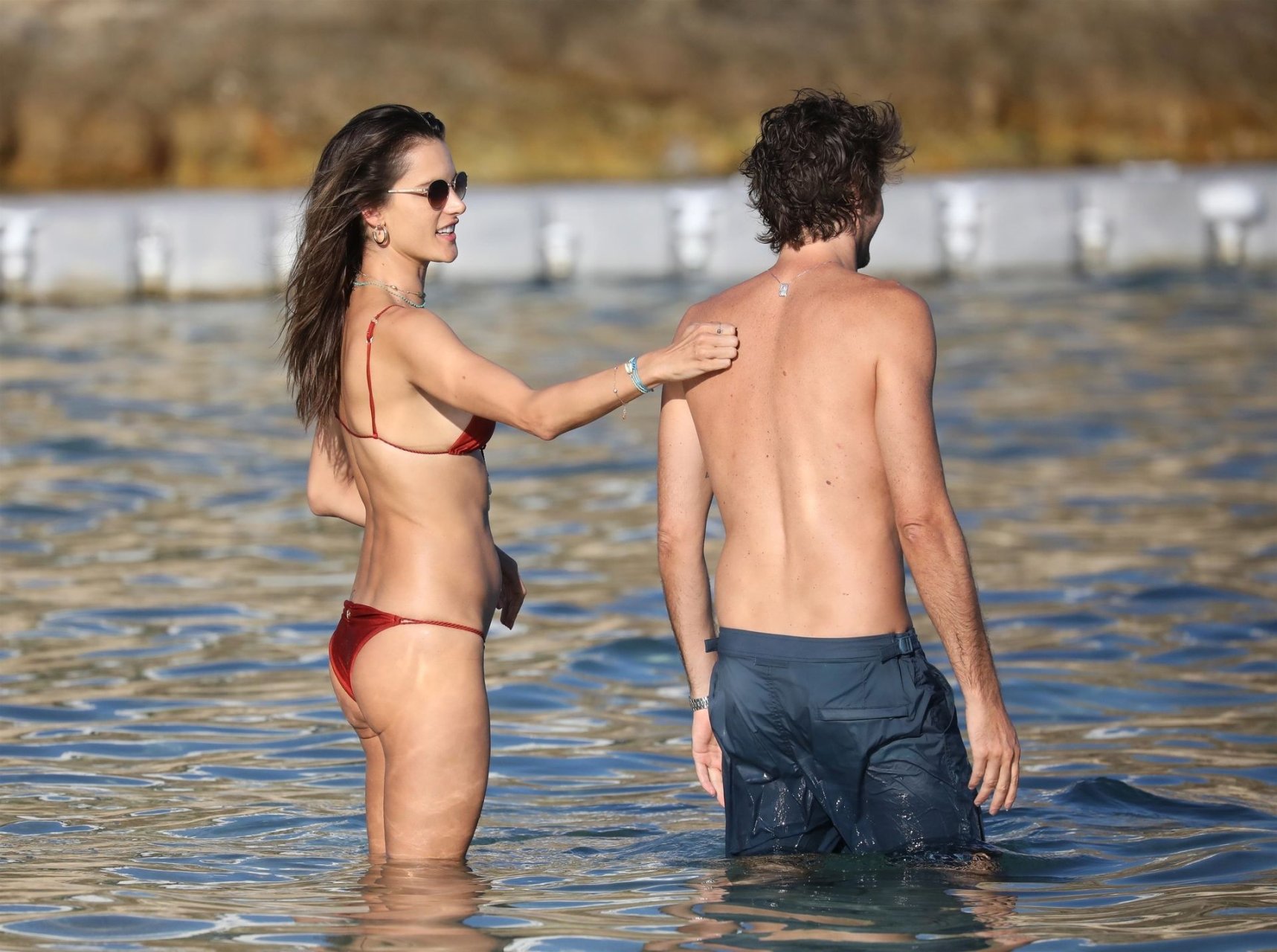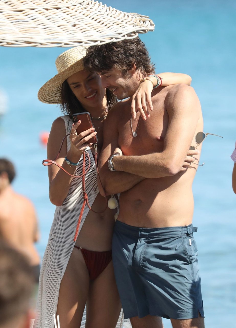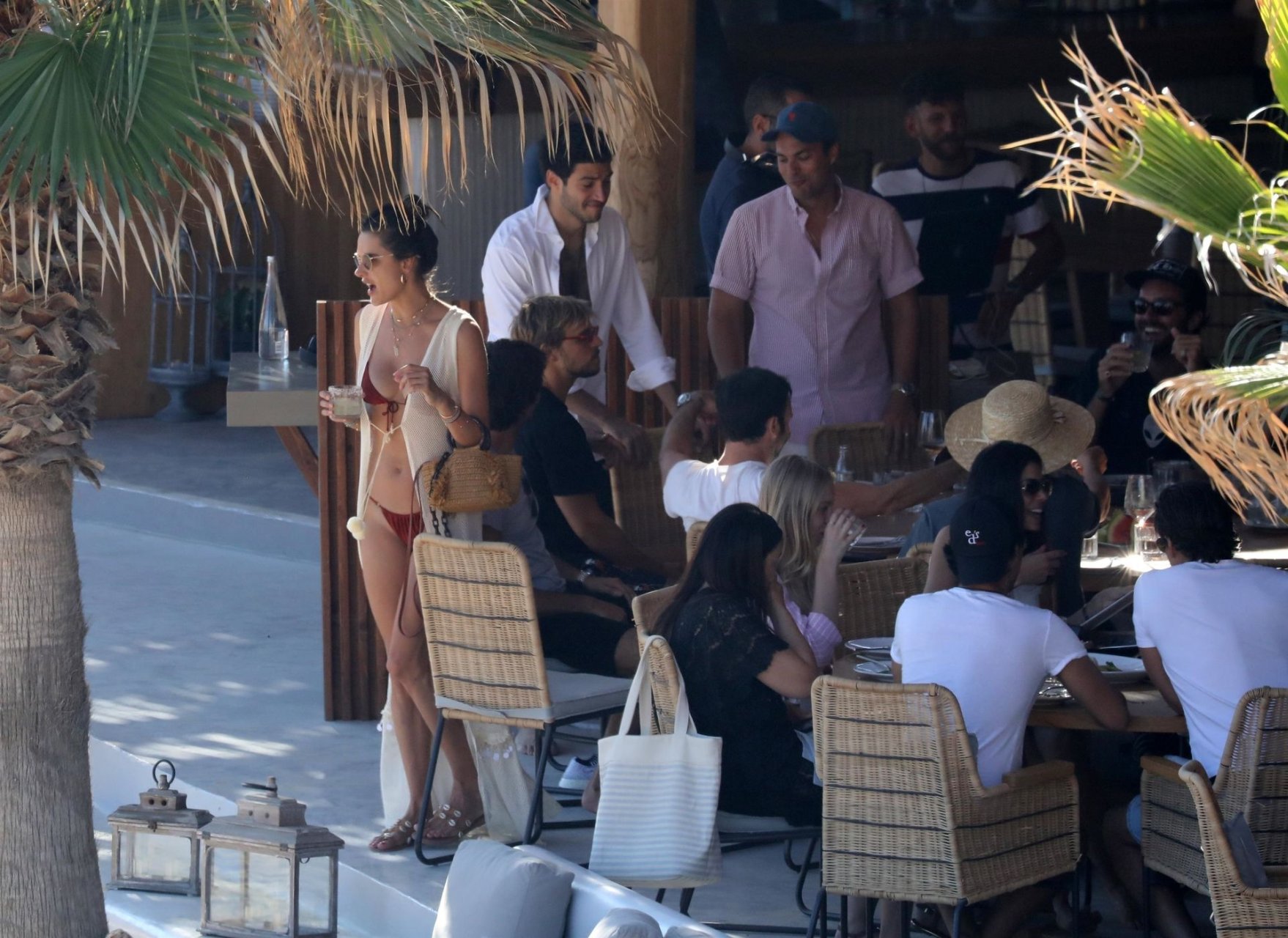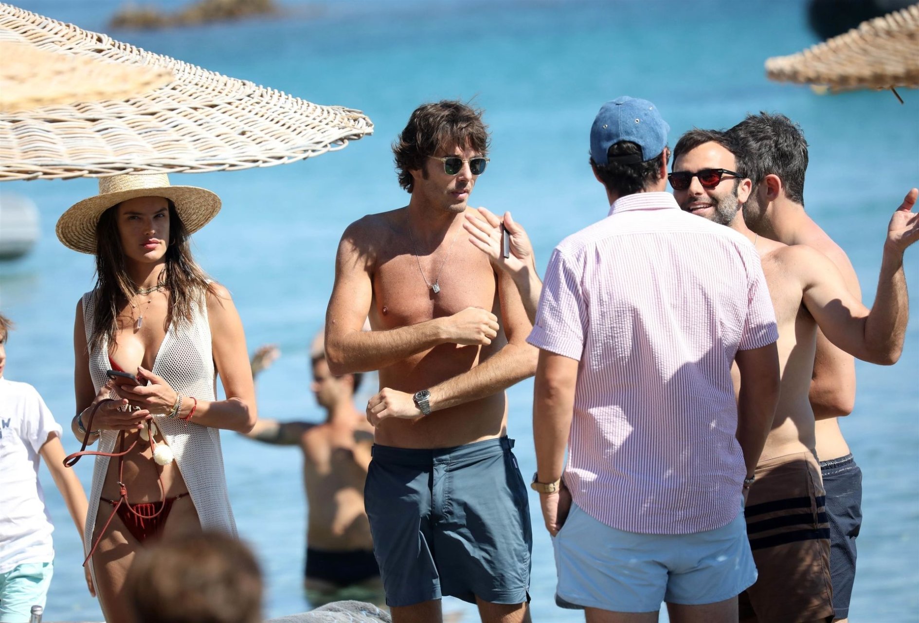 A supermodelo Alessandra Ambrosio e seu novo namorado Nicolo Oddi foram vistos em Mykonos junto com seus amigos Ana Beatriz Barros e seu marido empresário Karim El Chiaty, além do ex-noivo de Ambrosio, Jamie Mazur, e seus filhos Anja e Noah, em 13/07/2019.