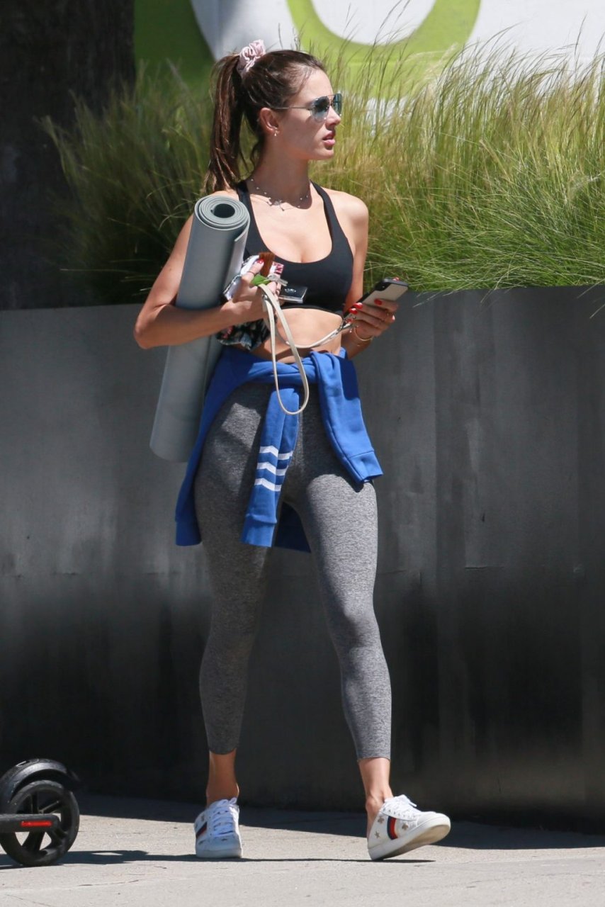 Alessandra Ambrosio exibe seus abdominais definidos com um top esportivo preto enquanto sai de uma aula de yoga em Los Angeles, 20/05/2019. A deslumbrante modelo parecia natural sem maquiagem e com o cabelo preso em um scrunchie, enquanto carregava seu tapete de yoga e seu telefone ao sair da aula. Vestindo leggings cinza e um top esportivo preto, Alessandra conversava ao telefone enquanto se dirigia ao seu carro.