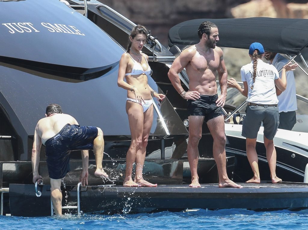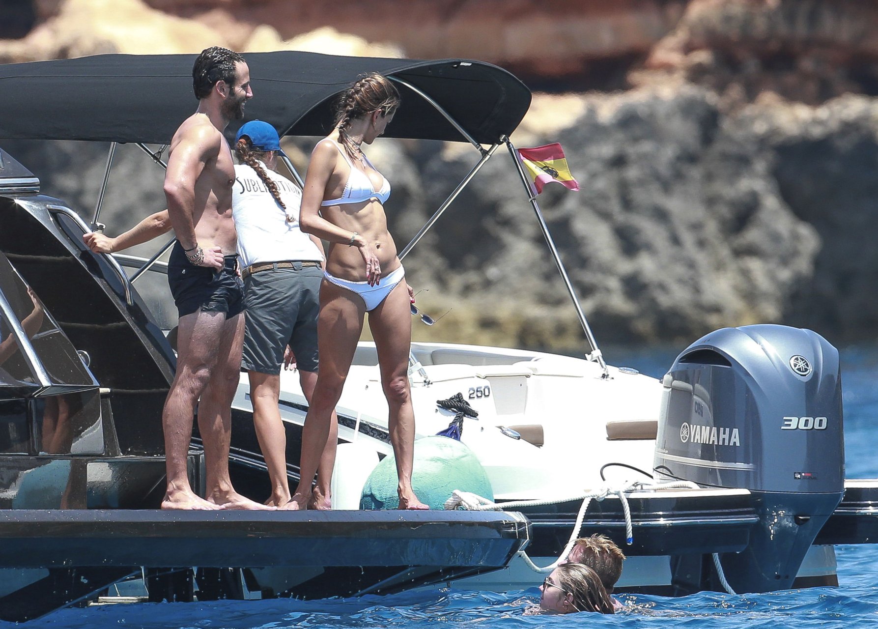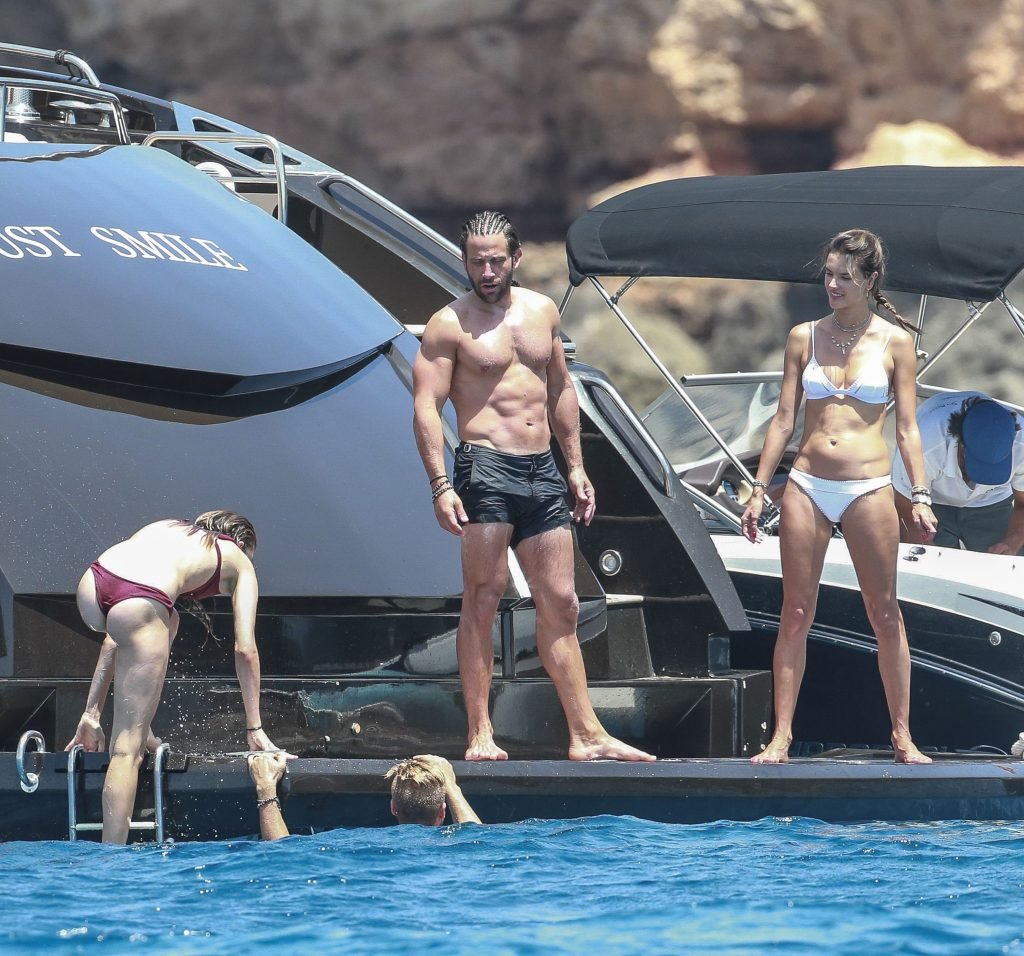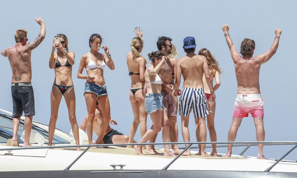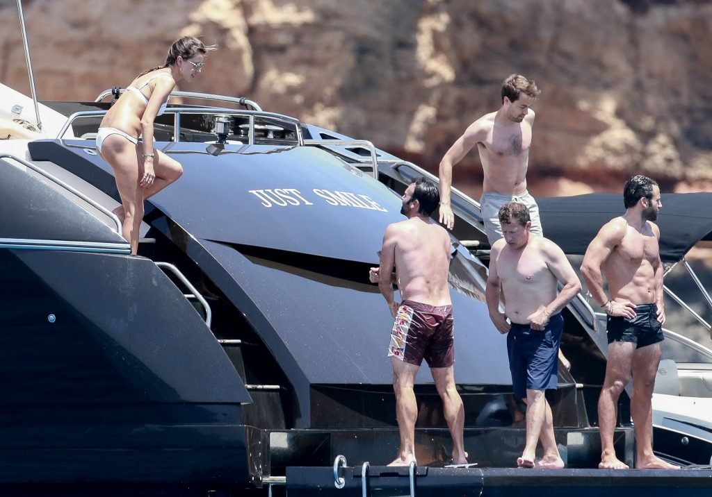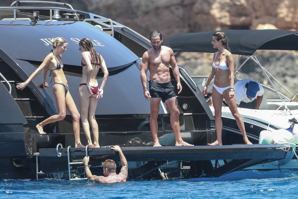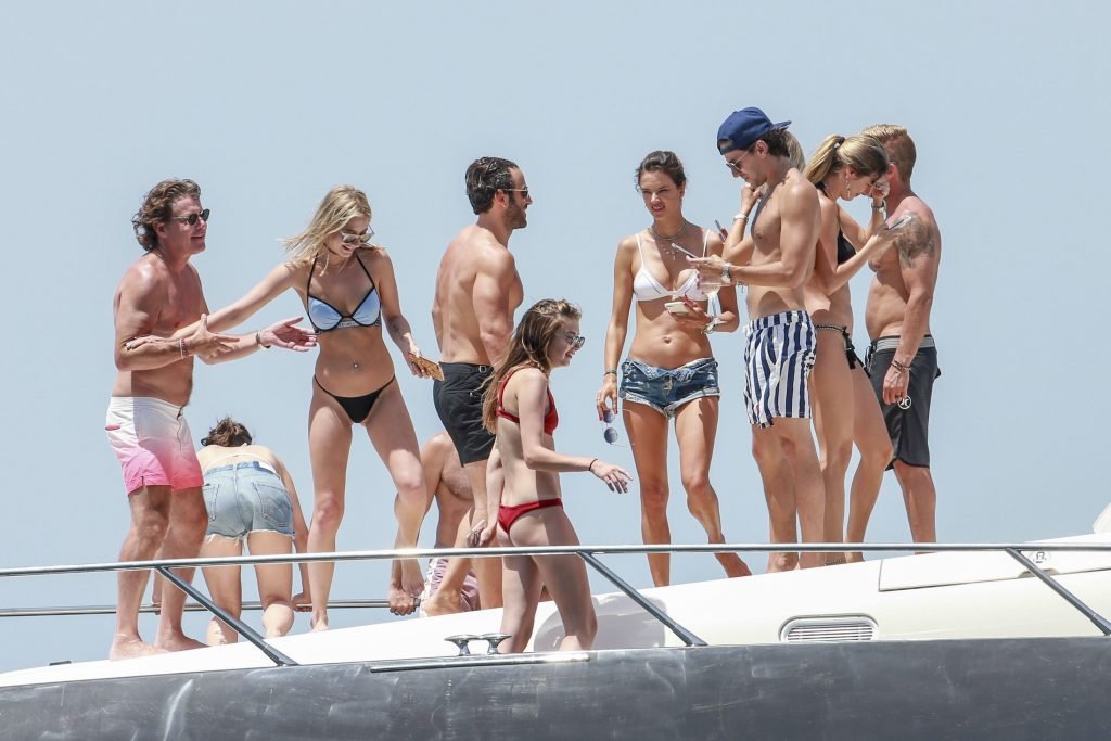 Supermodelo Alessandra Ambrosio com o noivo Jamie Mazur, Talita Correa, Ludi Delfino e outros amigos aproveitaram um belo barco durante as férias em Ibiza, 11/07/2017.