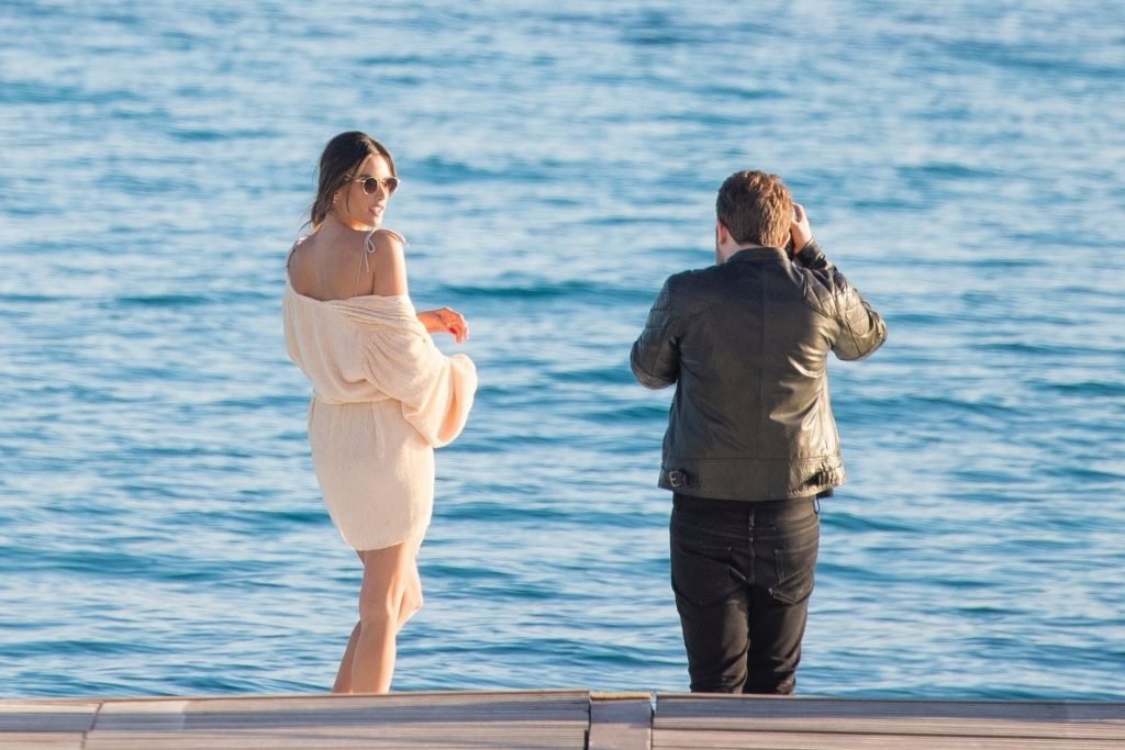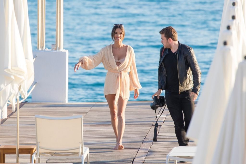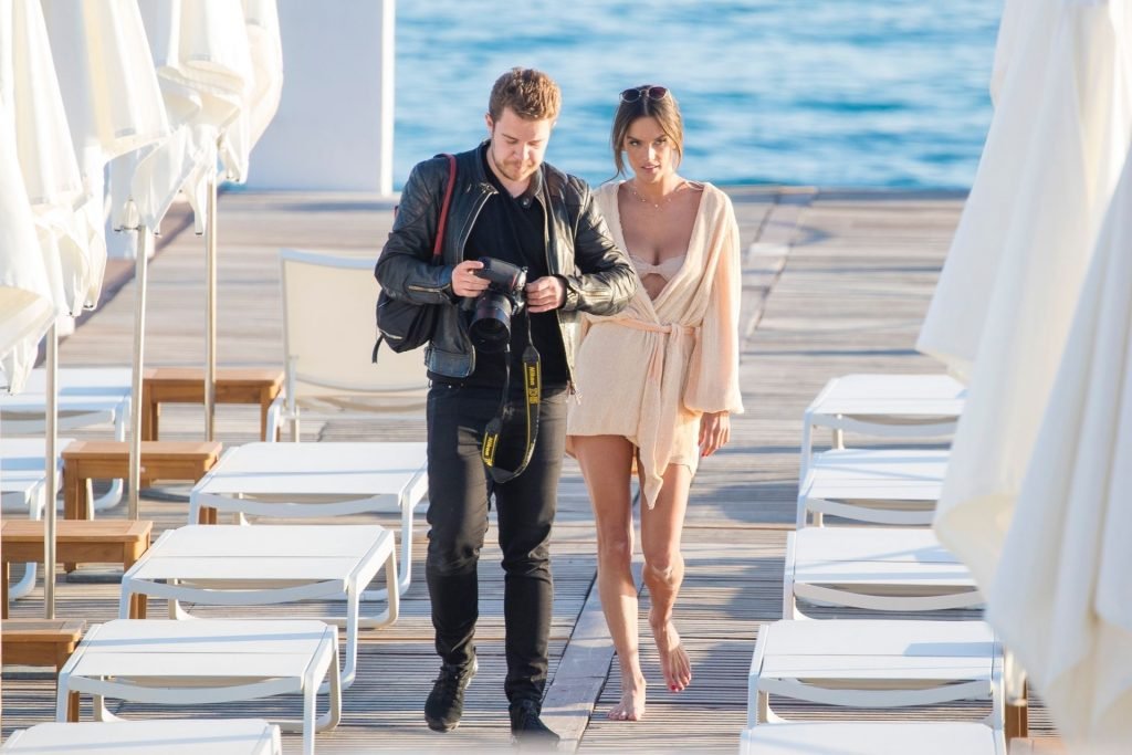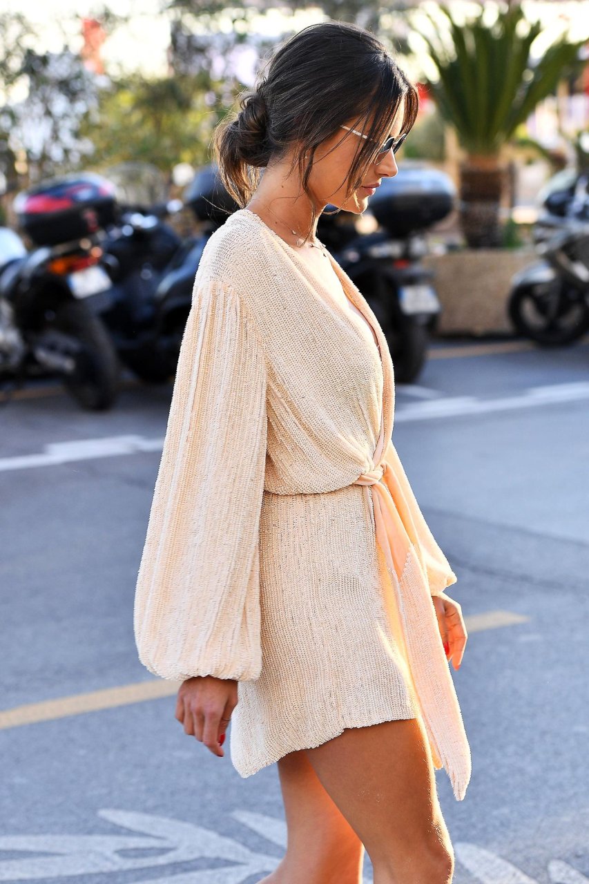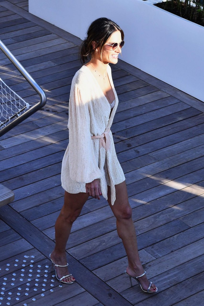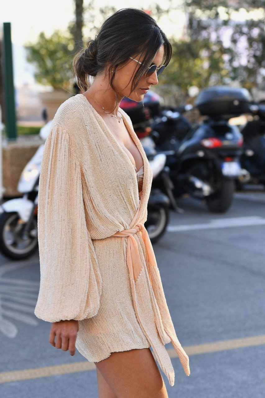 A supermodelo brasileira Alessandra Ambrosio foi vista usando um vestido creme envolvente ao sair do Hotel Martinez no 72º Festival de Cinema de Cannes, 15/05/2019.