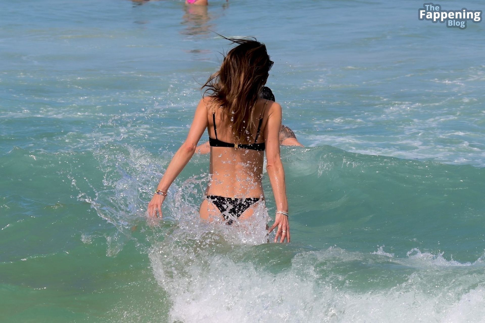 A modelo Alessandra Ambrosio é vista usando um biquíni preto minúsculo na praia em Florianópolis.