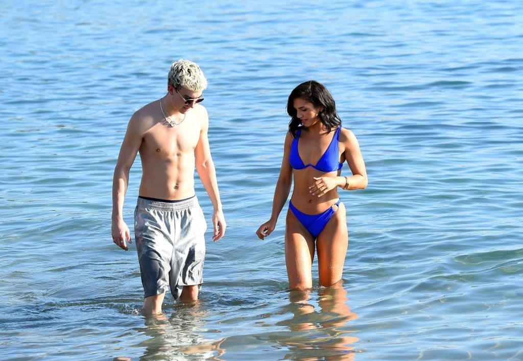 Alexandra Cane, do Love Island, exibe sua incrível perda de peso de 2 pedras enquanto grava seu plano de fitness The Happy Body Plan em Tenerife, 01/01/2020. A estrela da realidade é vista se exercitando de biquíni azul na praia.