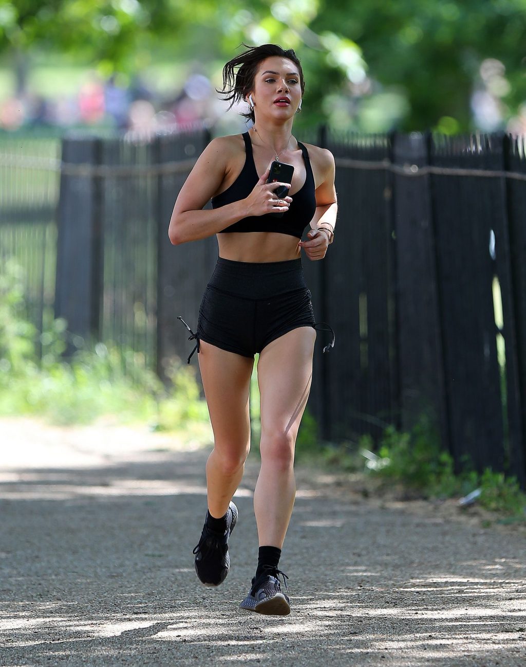 Love Island’s Alexandra Cane está com um corpo super tonificado usando um top esportivo preto, shorts e tênis enquanto corre em um dia quente em Londres, 25/05/2020.