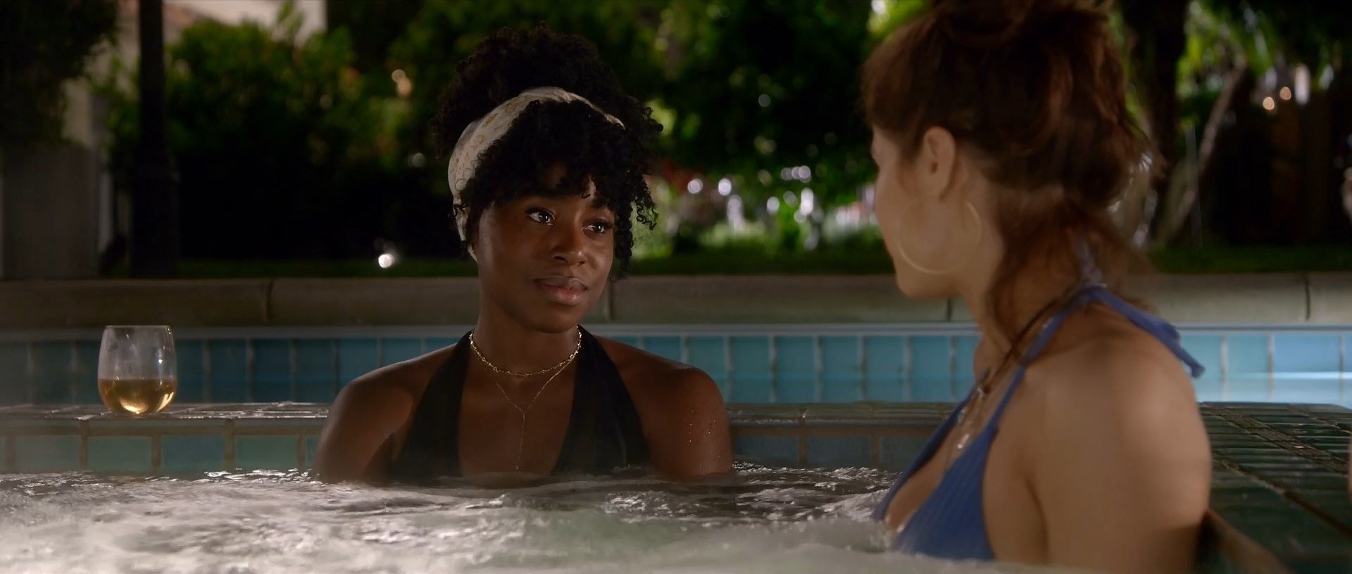 Assista a mais uma cena quente não nua de Alexandra Daddario em “Why Women Kill” (2019) Temporada 1 Episódio 2 (s01e02), onde você pode vê-la (como Jade) sentada em uma banheira de hidromassagem com Kirby Howell-Baptiste (como Taylor Harding). Alexandra está mostrando o decote em seu biquíni azul. Alex e Kirby quase se beijam, interrompidas por um cara que se junta a elas na banheira. Ah, elas teriam feito uma boa cena de sexo interracial!