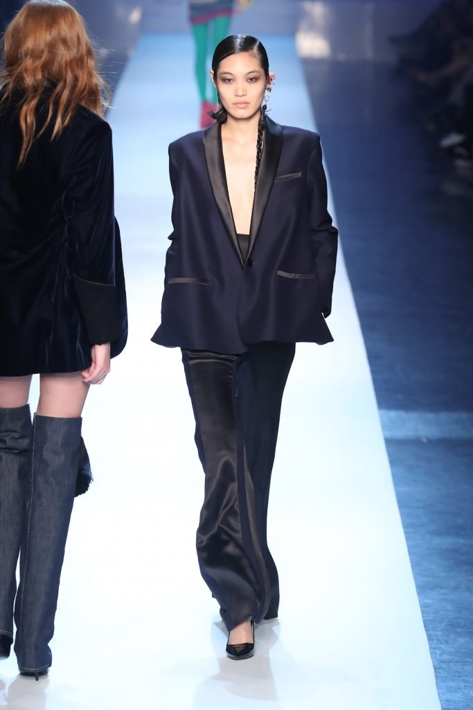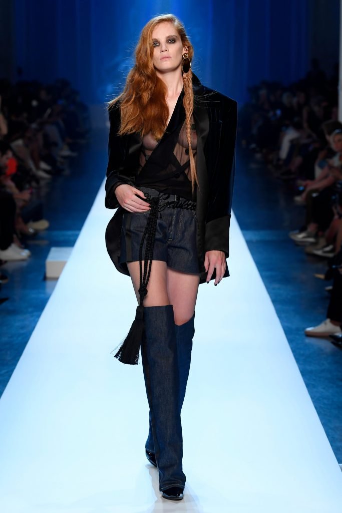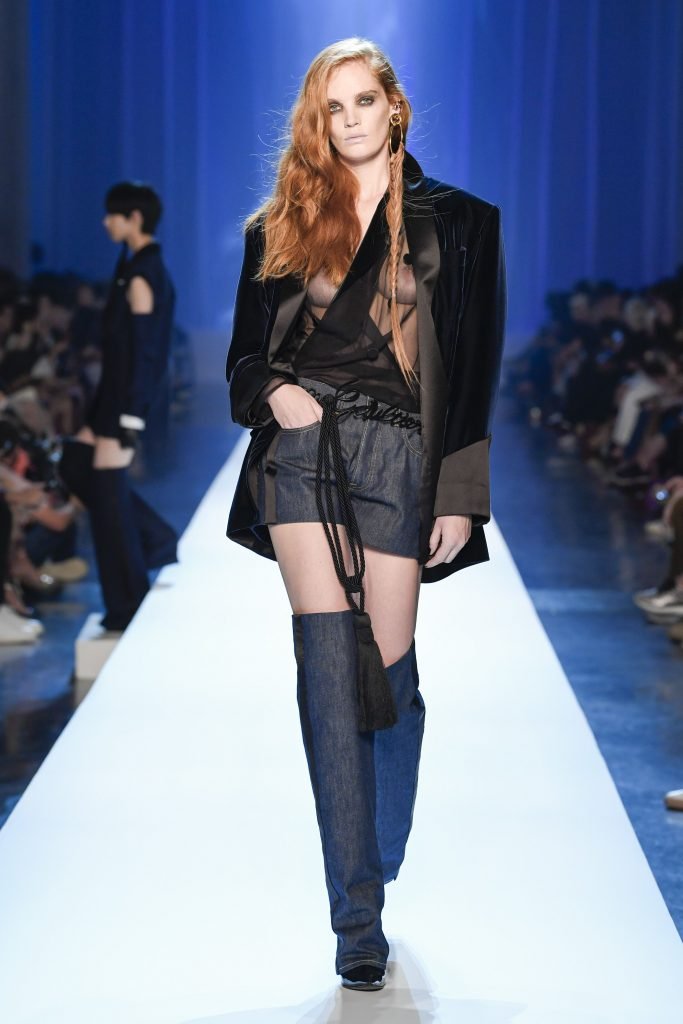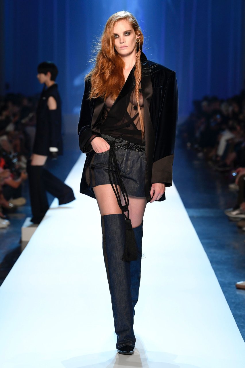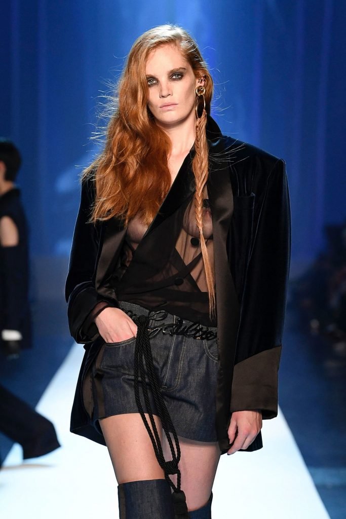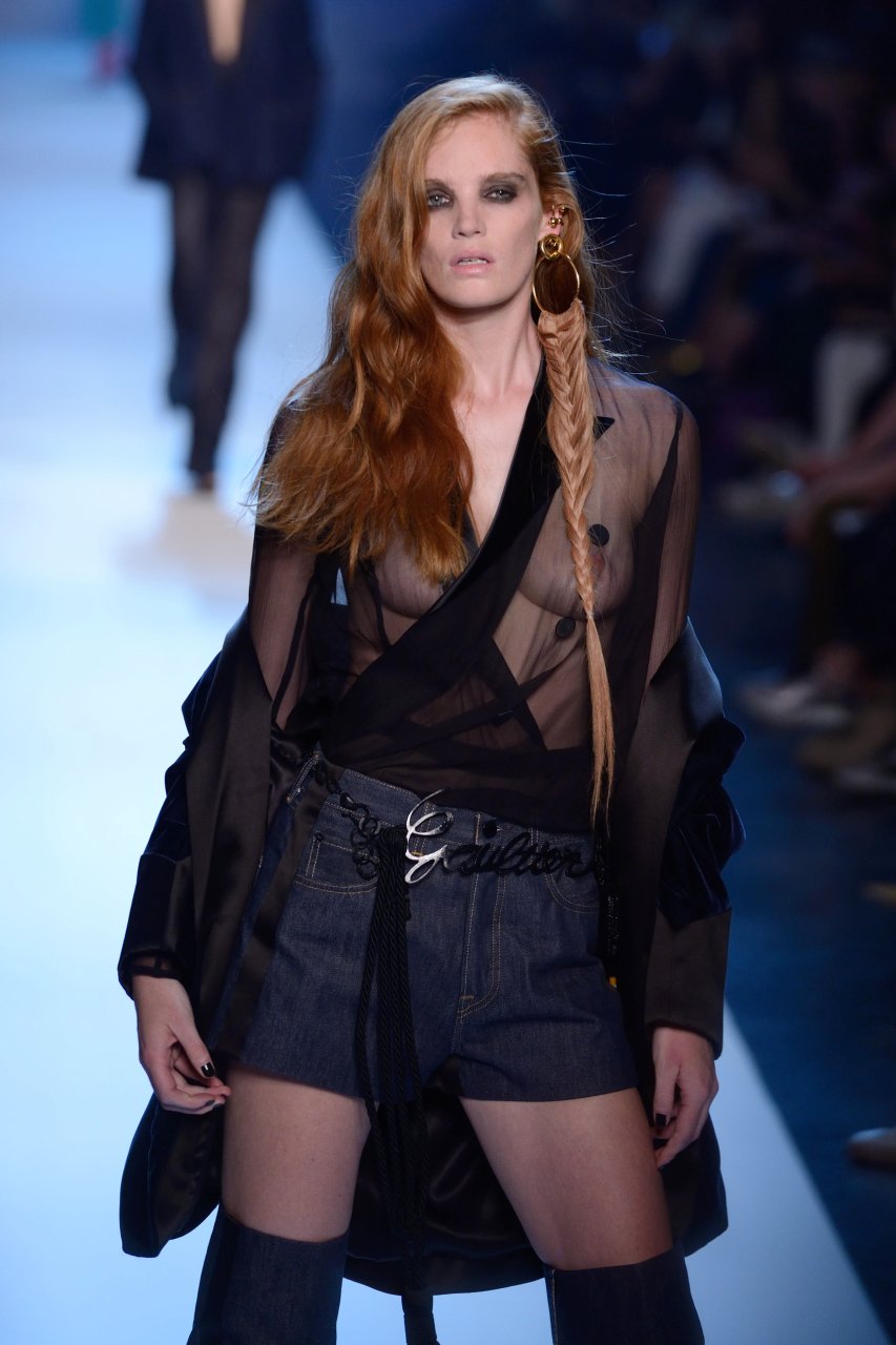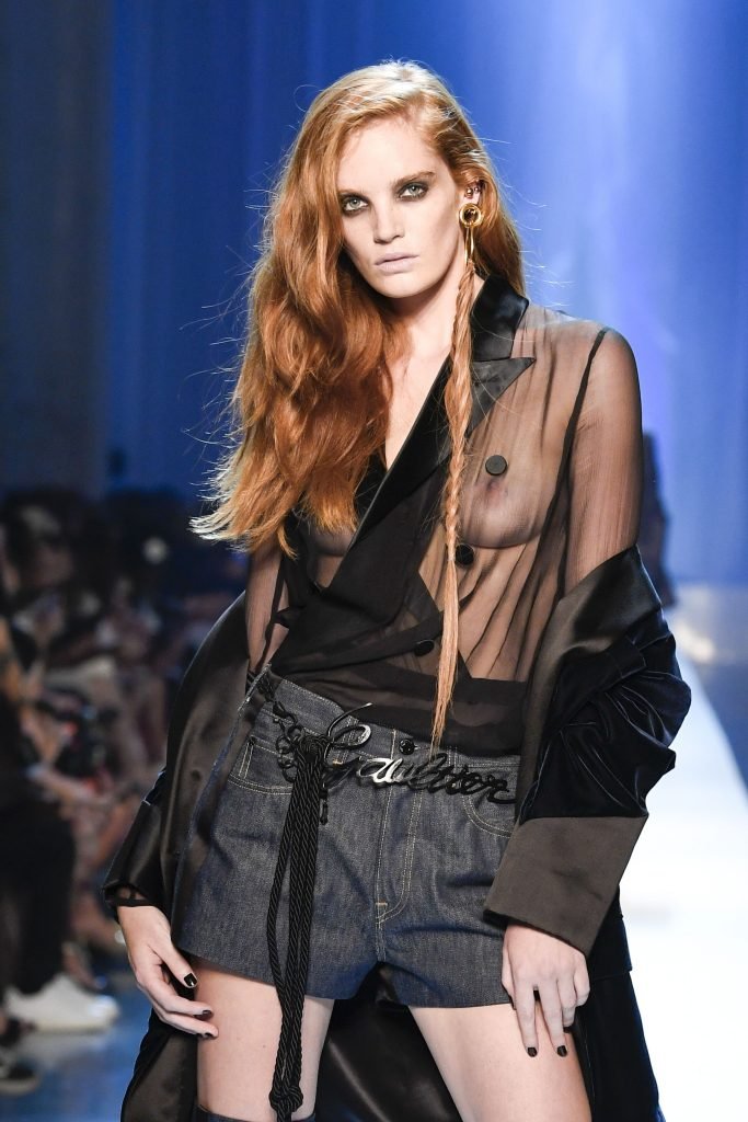Model Alexina Graham desfila sem sutiã durante a Semana de Moda Haute Couture Outono/Inverno 2018/19 de Jean-Paul Gaultier em Paris, França, 07/04/2018.
