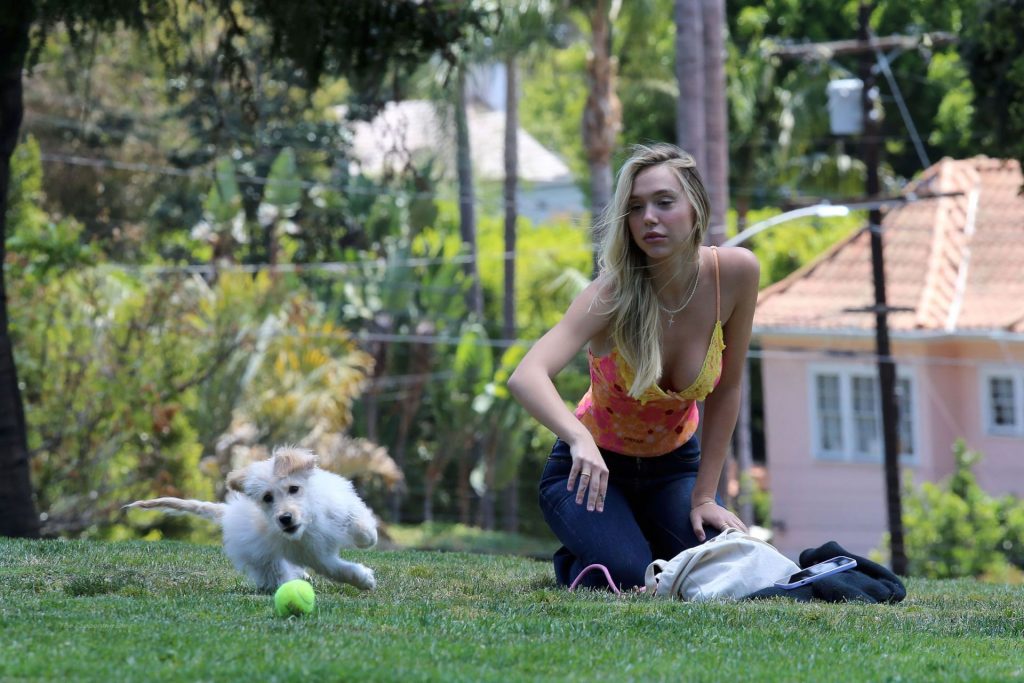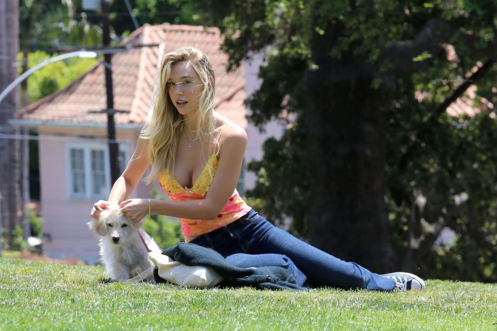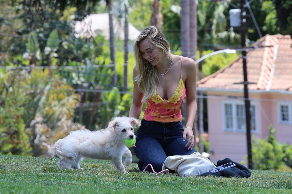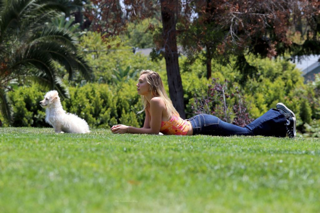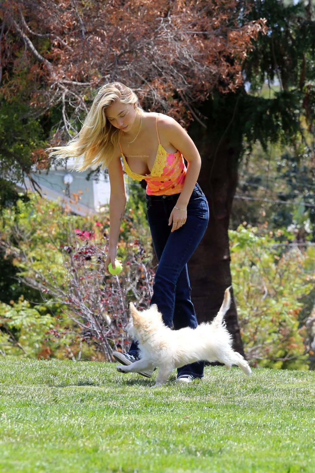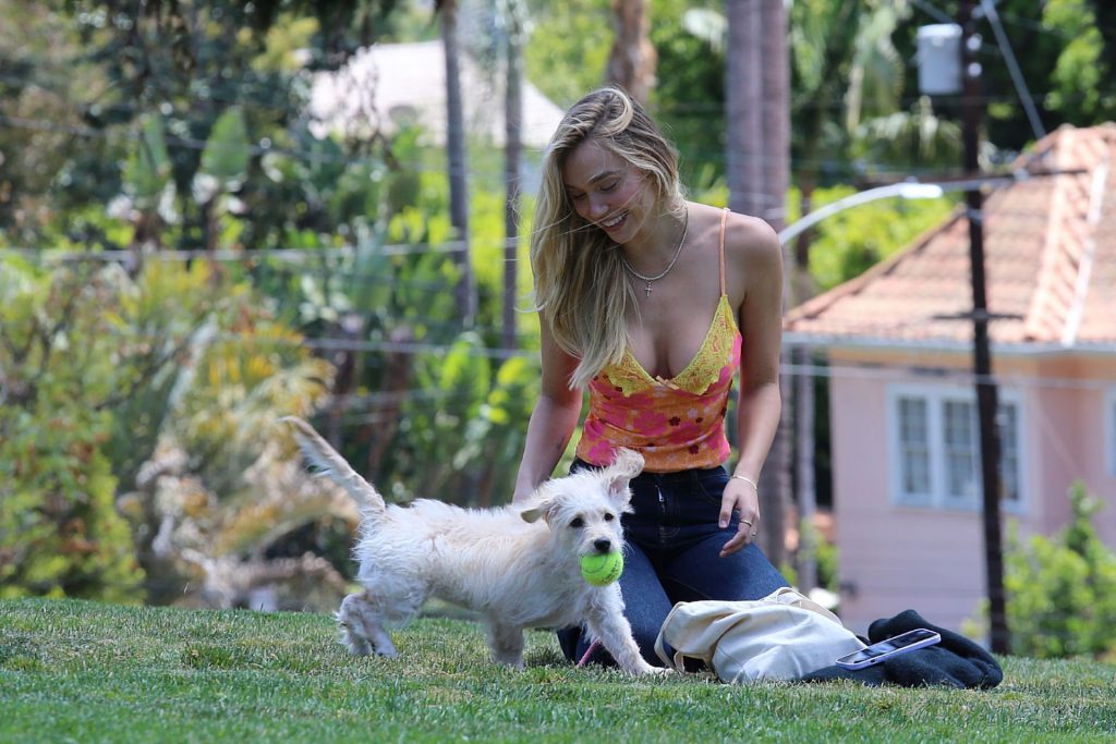 Alexis Ren é vista se divertindo com seu cachorro Angel em um parque local, 28/04/2021.