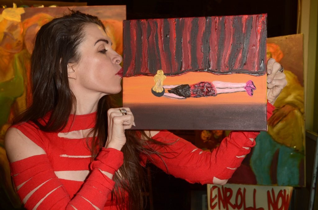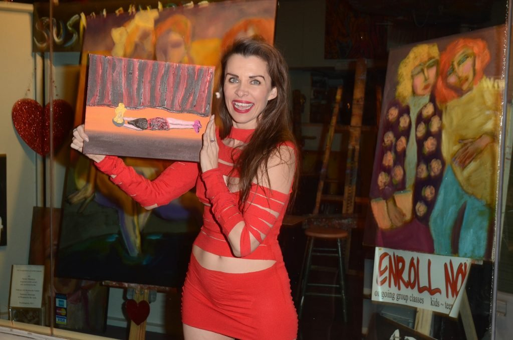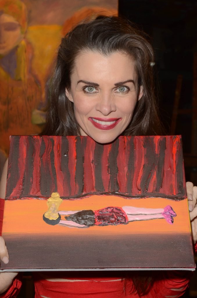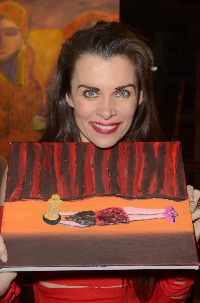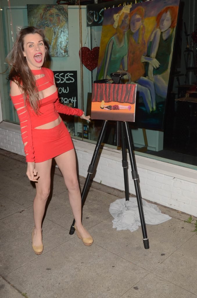 A atriz de Baywatch Alicia Arden troca de roupa para um vestido revelador para mostrar à imprensa a pintura vencedora, uma representação dela morrendo no palco enquanto recebe um Oscar em um concurso de mídia social – Los Angeles, 01/05/2018.