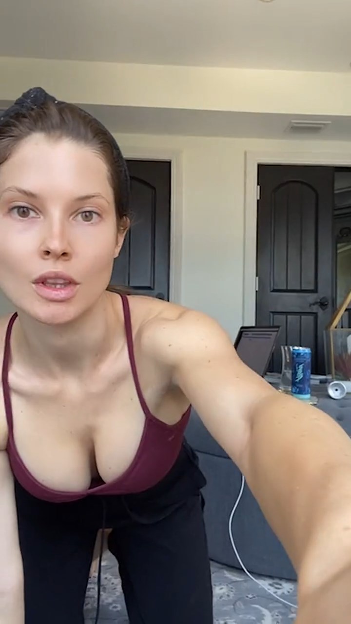 Social media star Amanda Cerny tira selfie em foto e vídeo, exibindo seu belo decote, vestindo um top esportivo – Instagram, 15/04/2021.