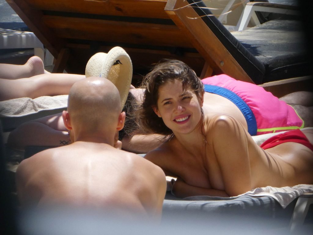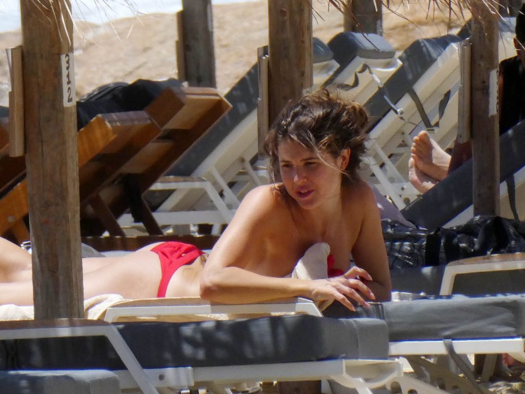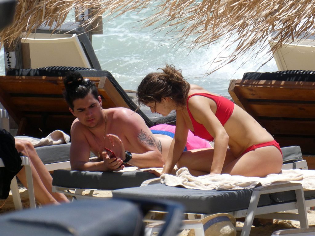 Atriz americana, modelo e estrela das redes sociais Amanda Cerny é vista topless na praia em Mykonos com amigos e seu namorado Johannes Bartl, 28/06/2018.
