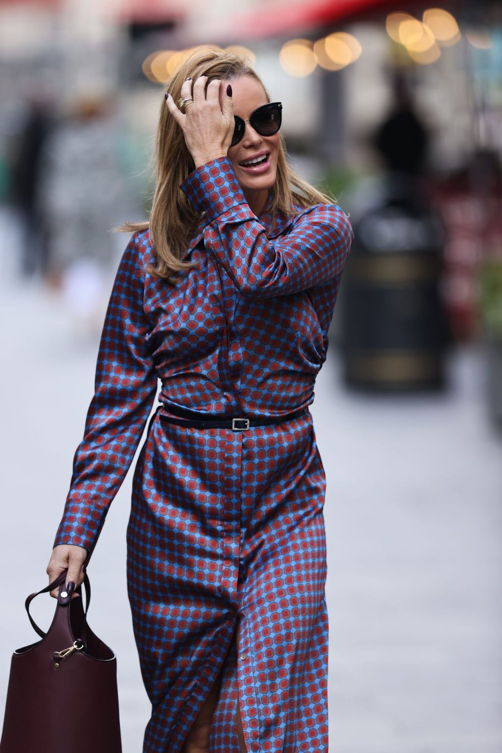 A jurada do Britain’s Got Talent e apresentadora de rádio Amanda Holden mostra suas pernas e “pokies” em vestido estampado na rádio Heart em Londres, 24/09/2020.