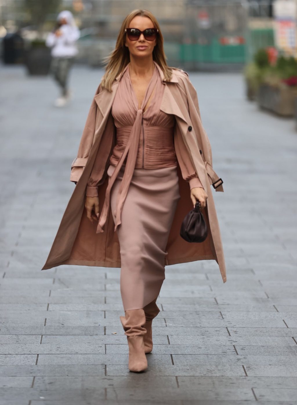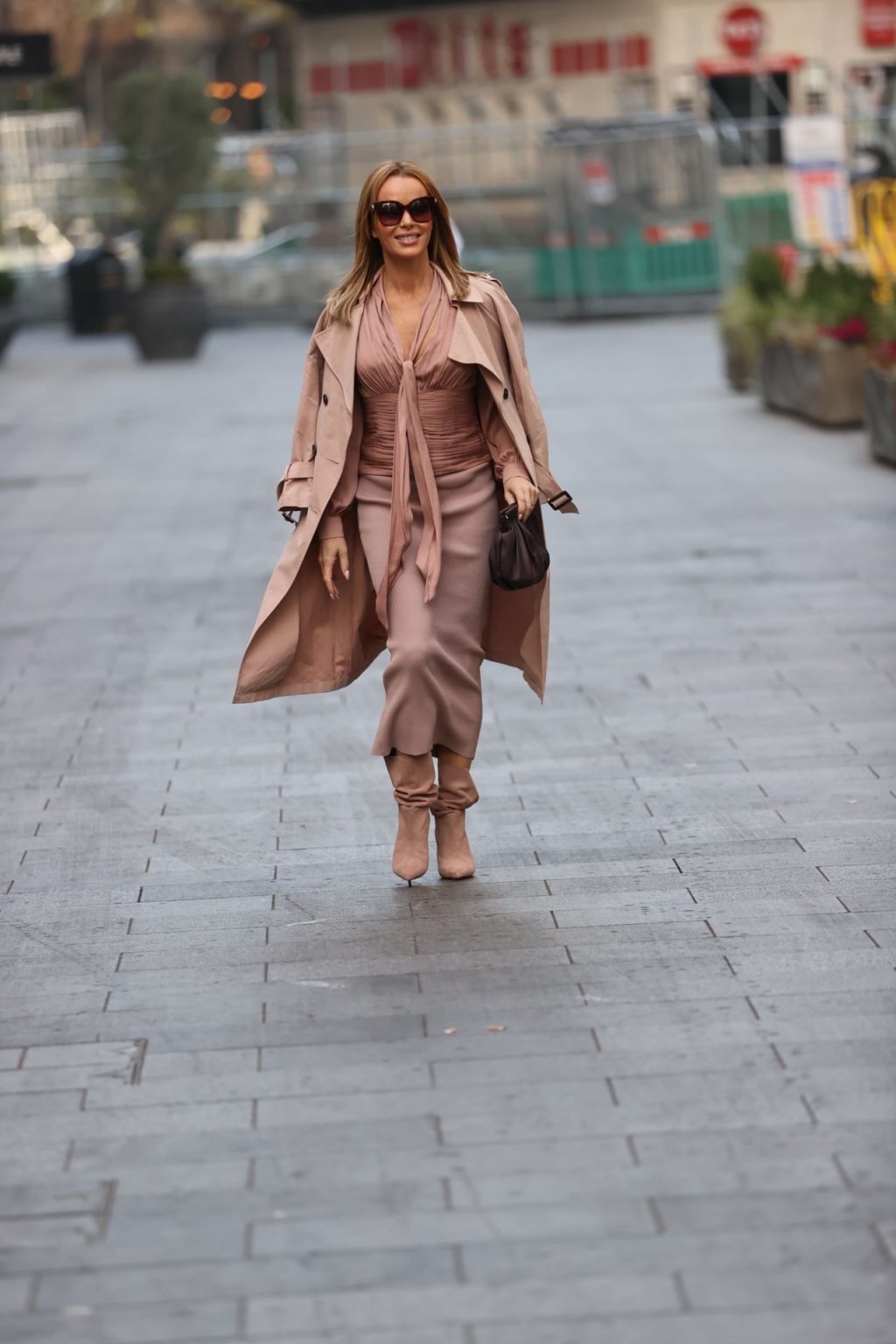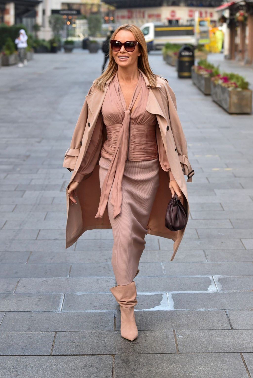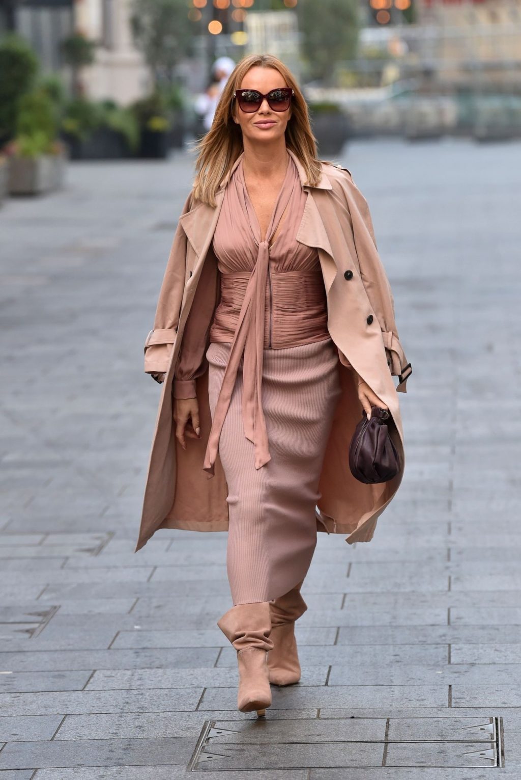 Sexy Amanda Holden usa vestido bege para o programa de rádio Heart em Londres, 11/05/2020.