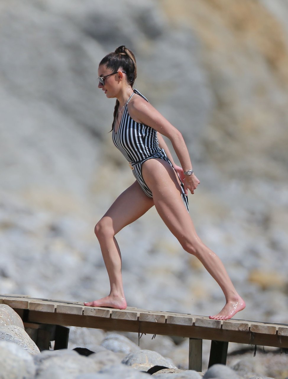 Amber Davies de “Love Island” foi fotografada com amigos em uma praia em Ibiza, 31/08/2018. Amber (21) foi vista usando um maiô listrado preto e branco enquanto aproveitava seu tempo brincando na água e relaxando em um píer flutuante.