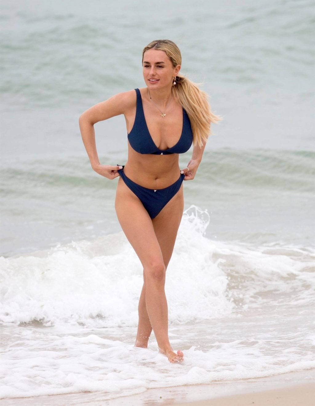 Amber, que é bem conhecida por sua participação no reality show do Reino Unido “Love Island”, foi à praia para o verão australiano usando um biquíni azul Beija London de duas peças que mostrava seu corpo incrível.