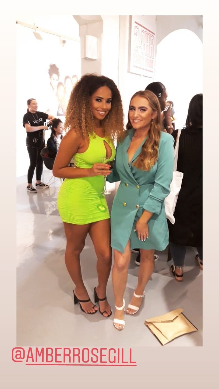 “Love Island” estrela Amber Rose Gill foi vista aqui usando um ousado traje verde neon mostrando bastante decote e pernas enquanto sai do salão de beleza Revlon 24hr com Harley Brash – Londres, 19/09/2019.