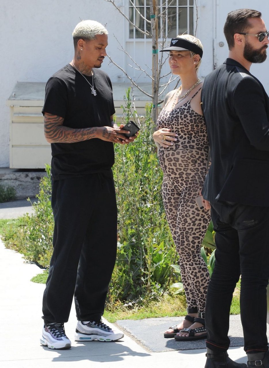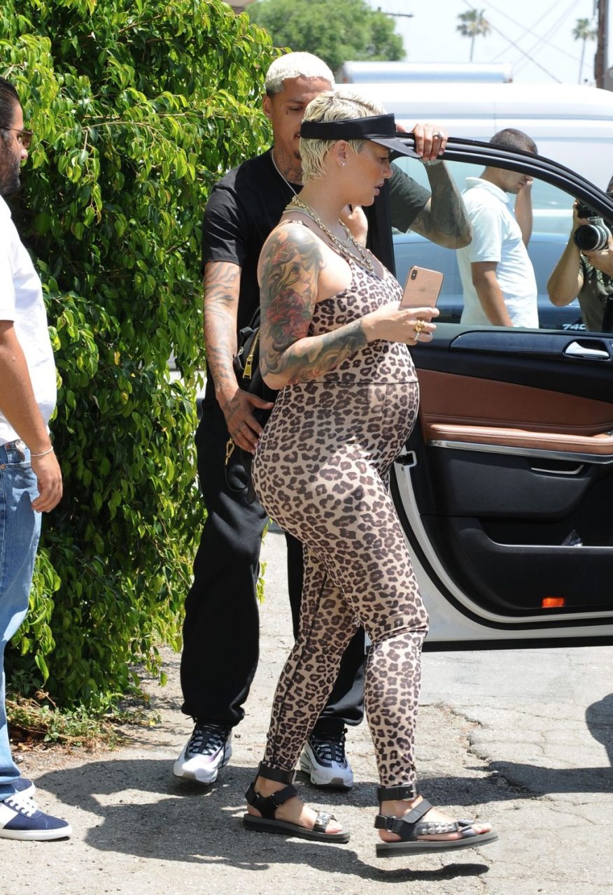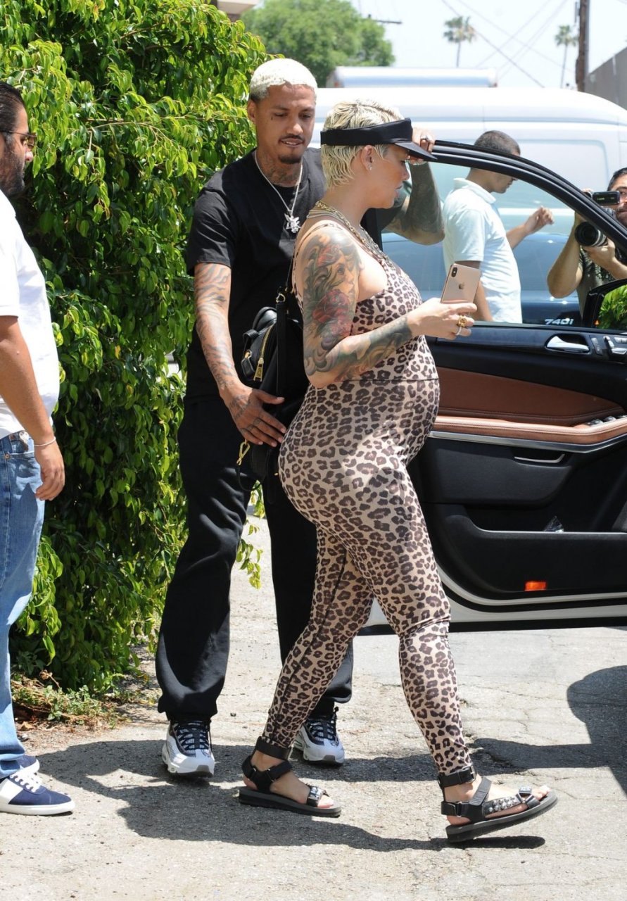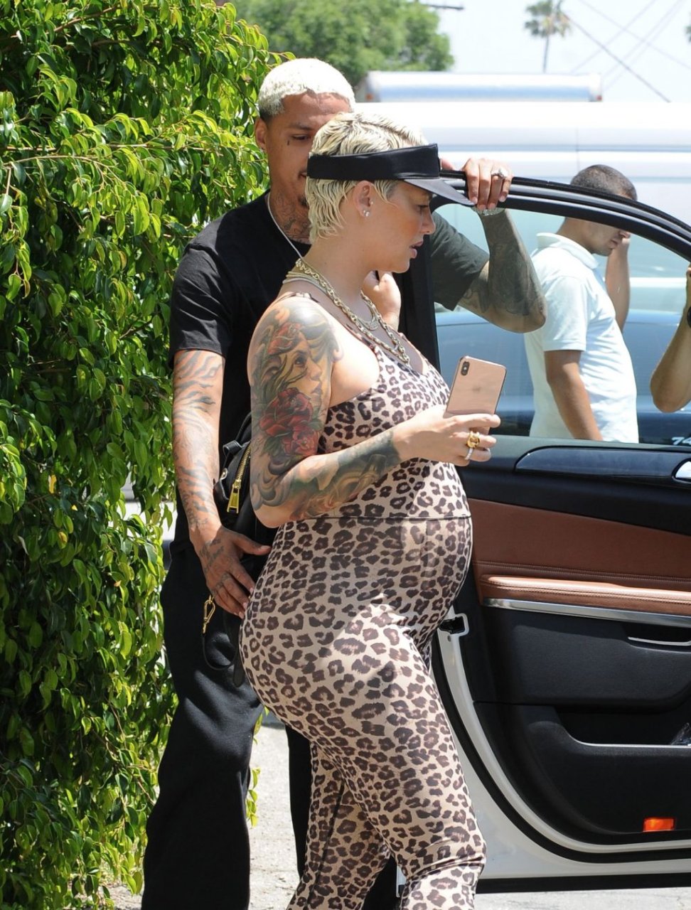 Amber Rose exibe sua crescente barriga de grávida com meia-calça de oncinha enquanto participa de uma reunião de negócios com seus parceiros e o namorado Alexander Edwards no restaurante francês Petit Trois em Sherman Oaks, 03/05/2019. O novo namorado de Amber, Alexander, não conseguia tirar as mãos dela enquanto esperavam pelo carro no valet.