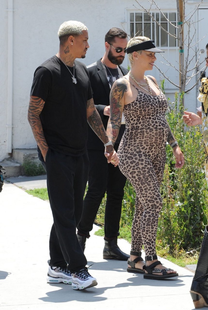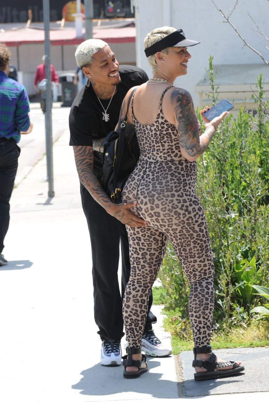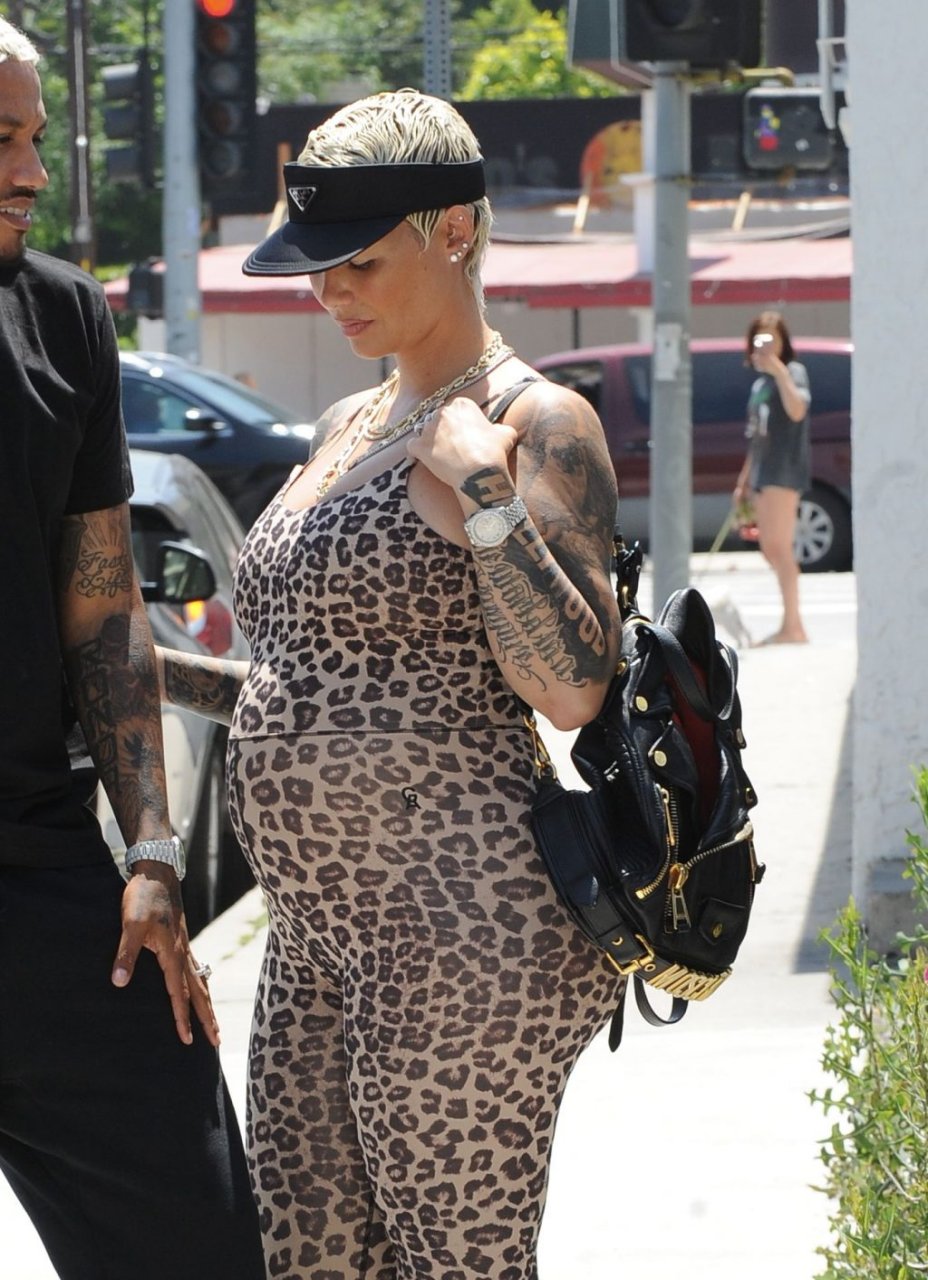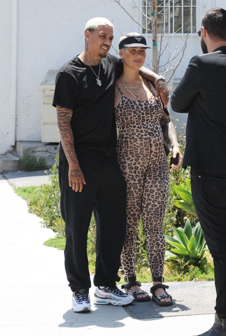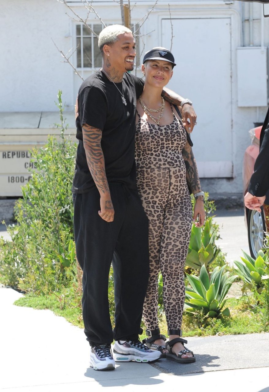 Amber Rose exibe sua crescente barriga de grávida com meia-calça de oncinha enquanto participa de uma reunião de negócios com seus parceiros e o namorado Alexander Edwards no restaurante francês Petit Trois em Sherman Oaks, 03/05/2019. O novo namorado de Amber, Alexander, não conseguia tirar as mãos dela enquanto esperavam pelo carro no valet.