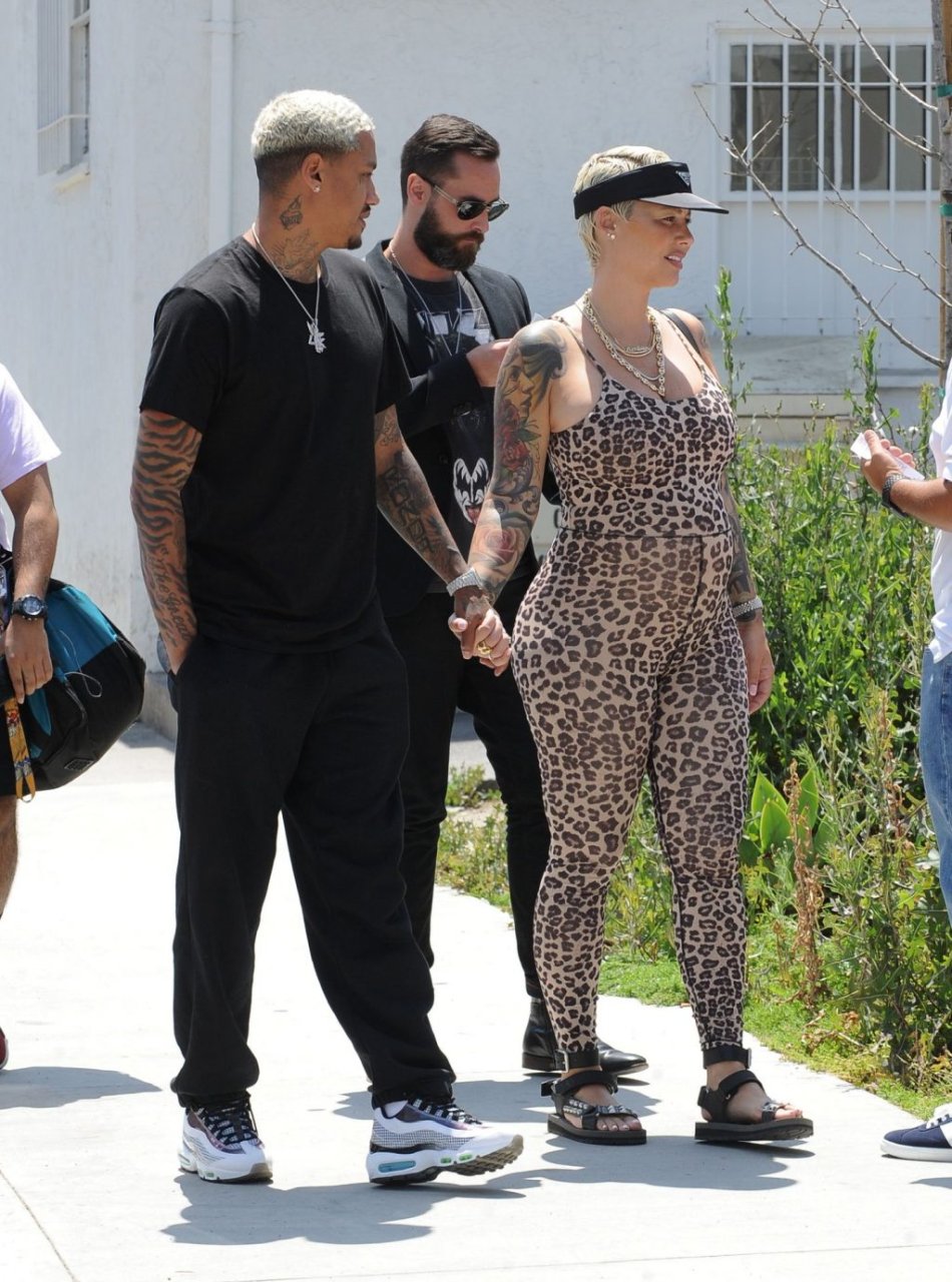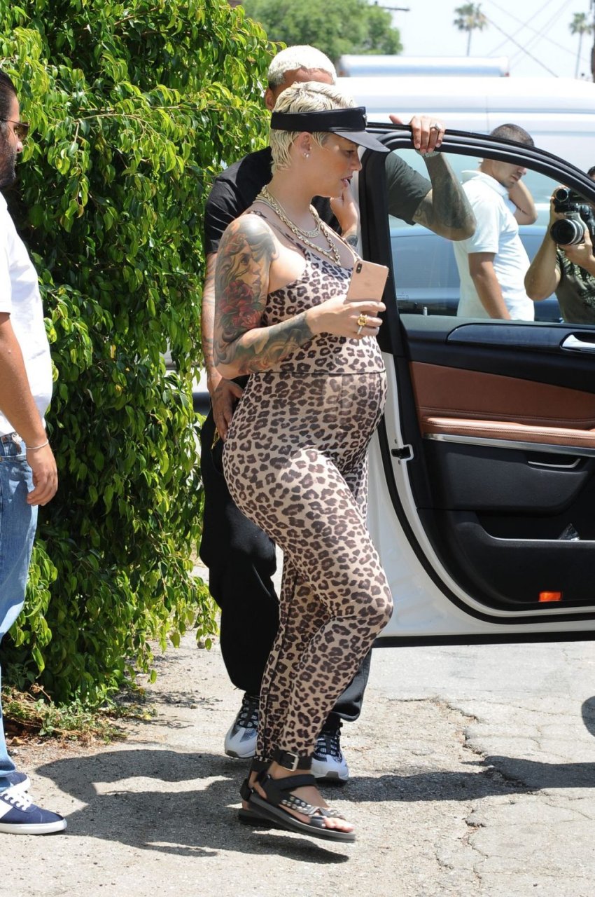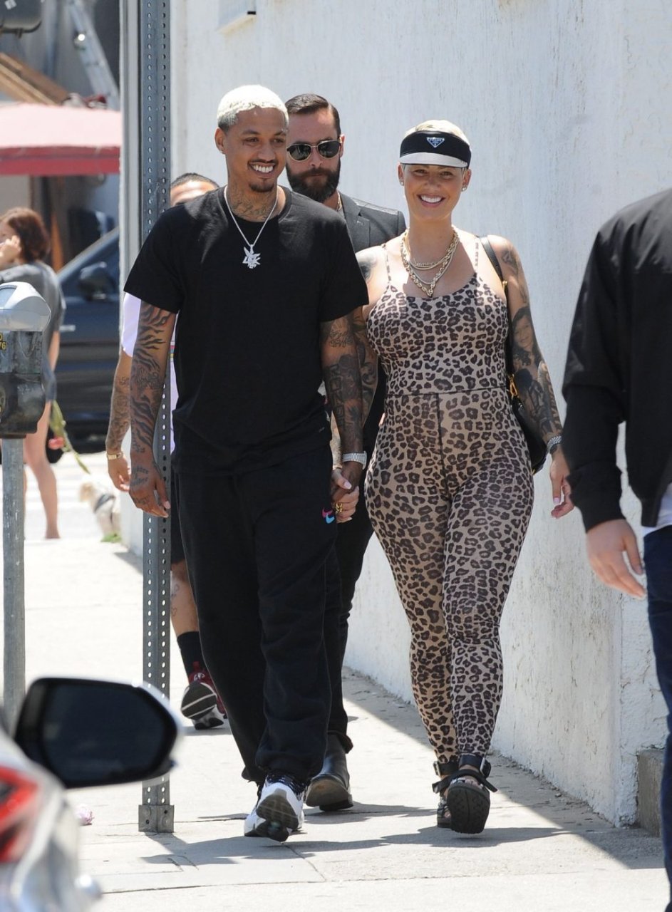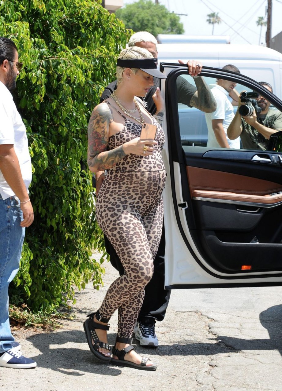 Amber Rose exibe sua crescente barriga de grávida com meia-calça de oncinha enquanto participa de uma reunião de negócios com seus parceiros e o namorado Alexander Edwards no restaurante francês Petit Trois em Sherman Oaks, 03/05/2019. O novo namorado de Amber, Alexander, não conseguia tirar as mãos dela enquanto esperavam pelo carro no valet.