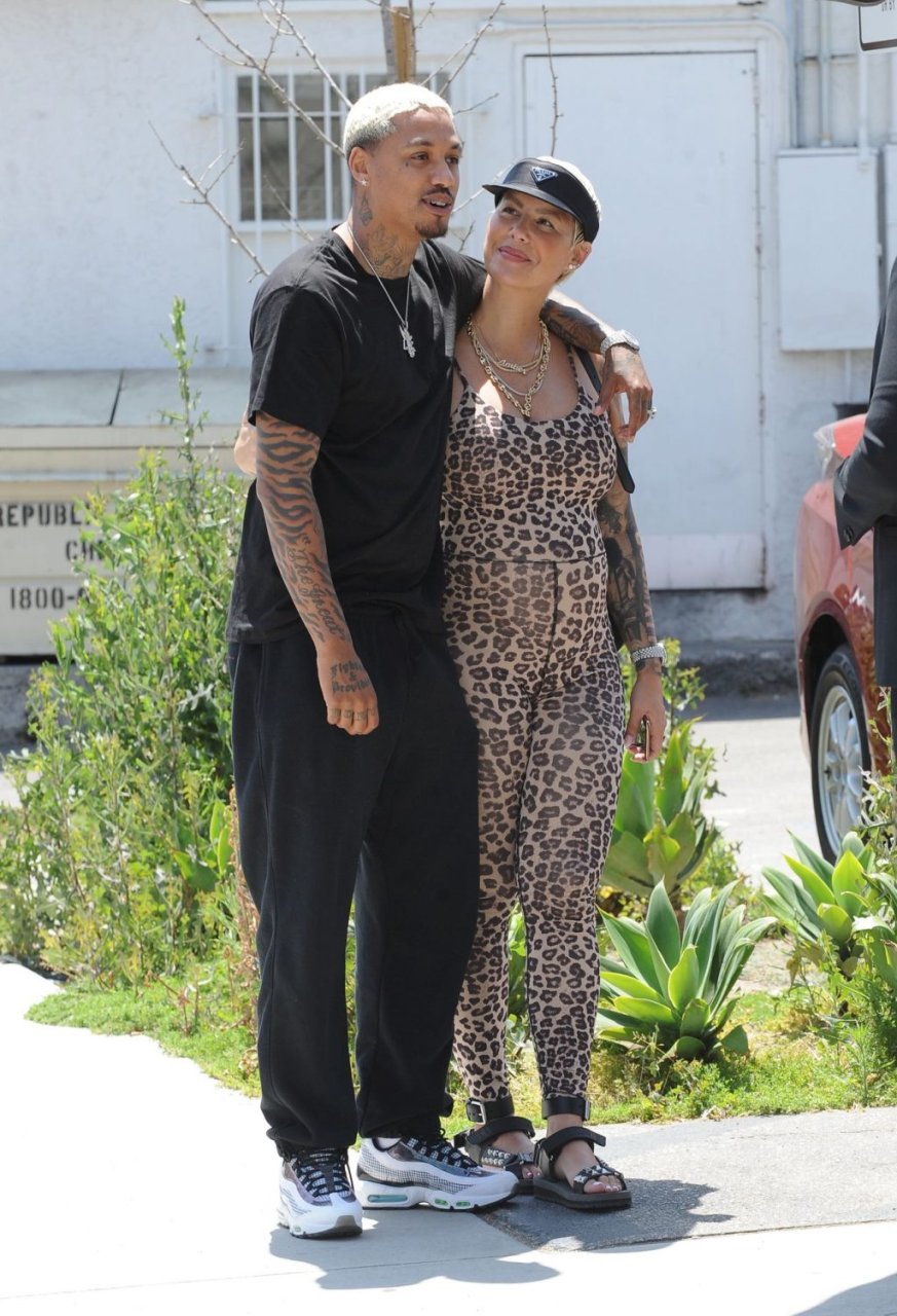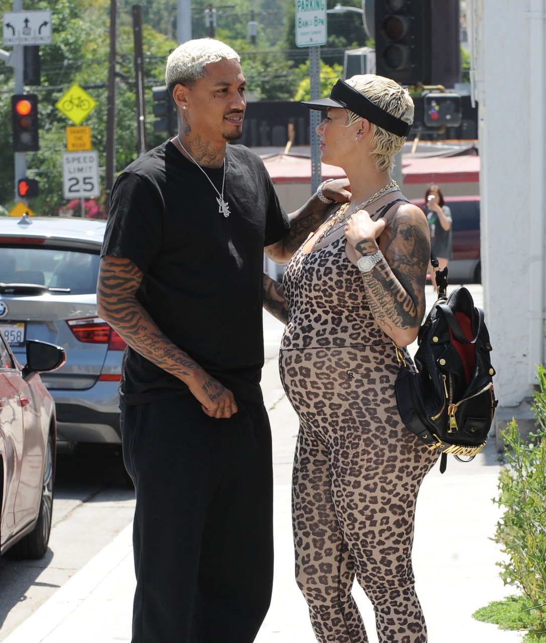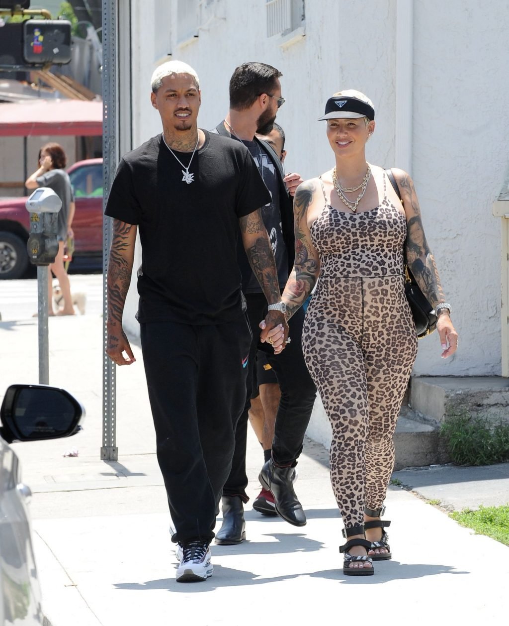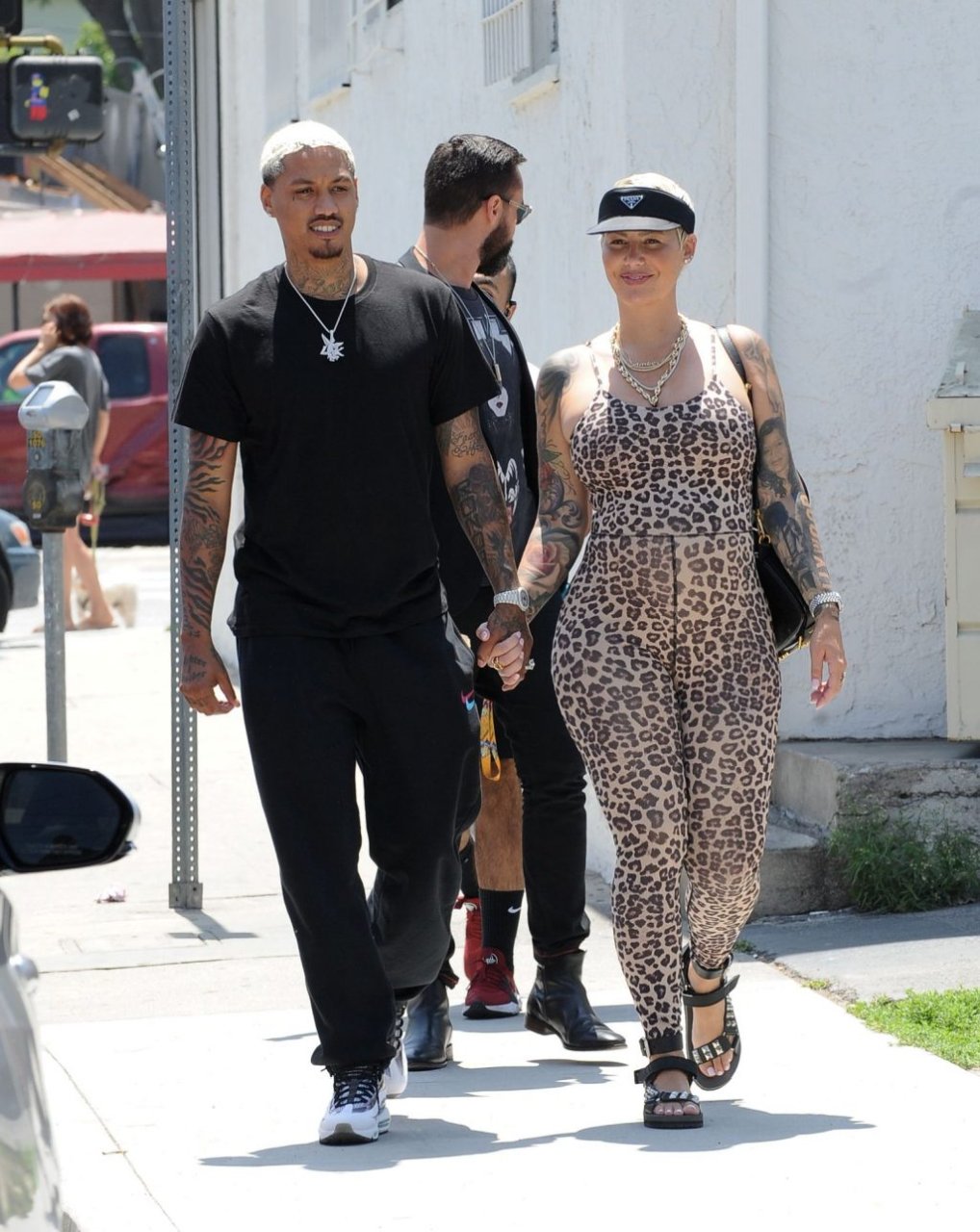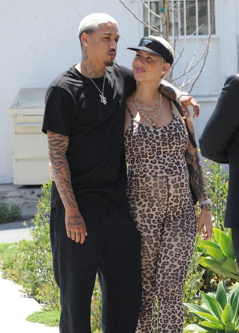 Amber Rose exibe sua crescente barriga de grávida com meia-calça de oncinha enquanto participa de uma reunião de negócios com seus parceiros e o namorado Alexander Edwards no restaurante francês Petit Trois em Sherman Oaks, 03/05/2019. O novo namorado de Amber, Alexander, não conseguia tirar as mãos dela enquanto esperavam pelo carro no valet.