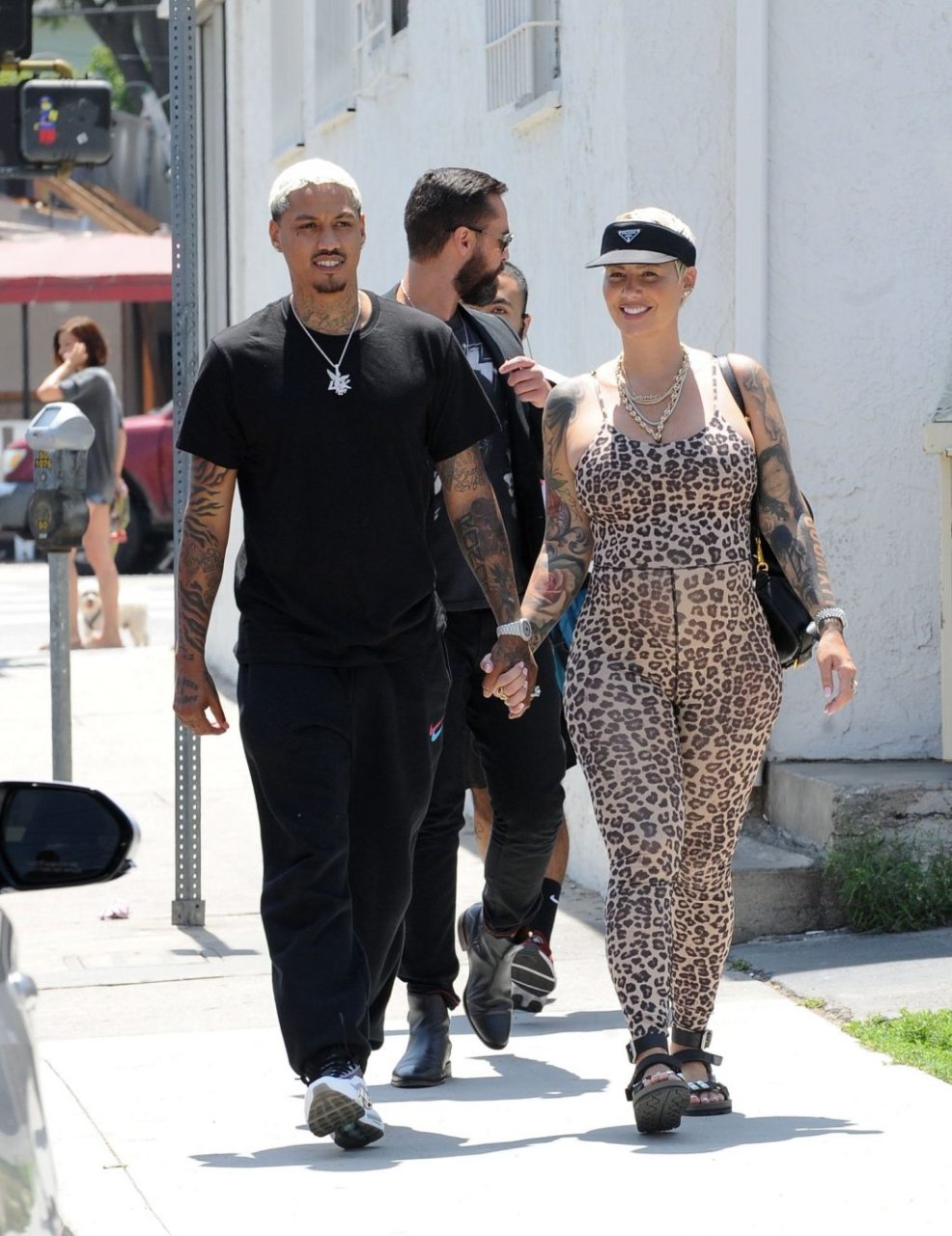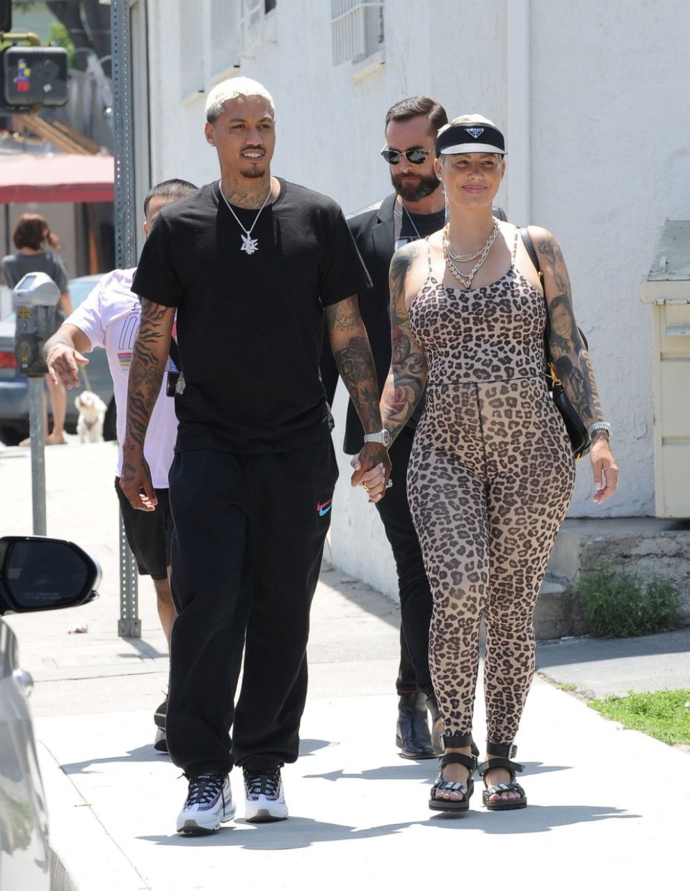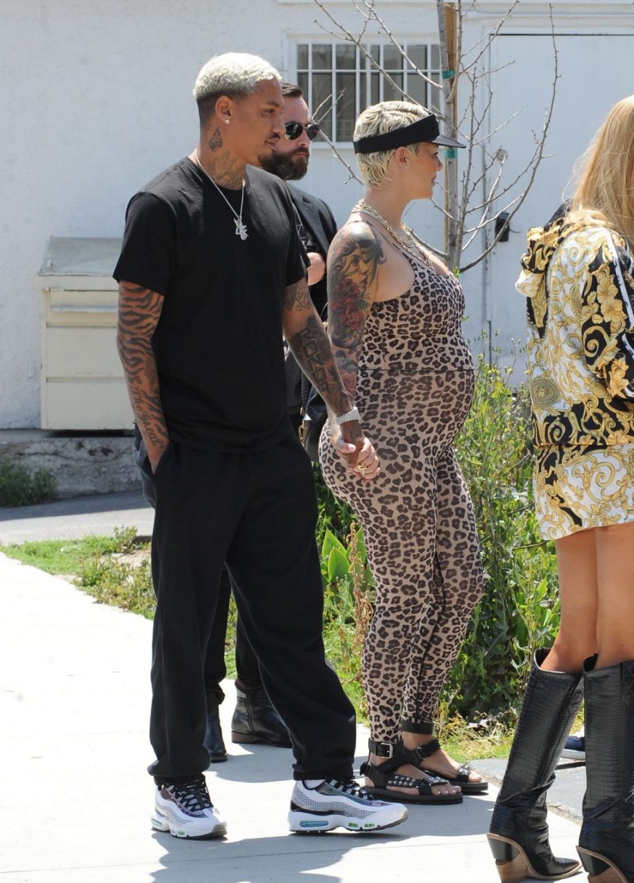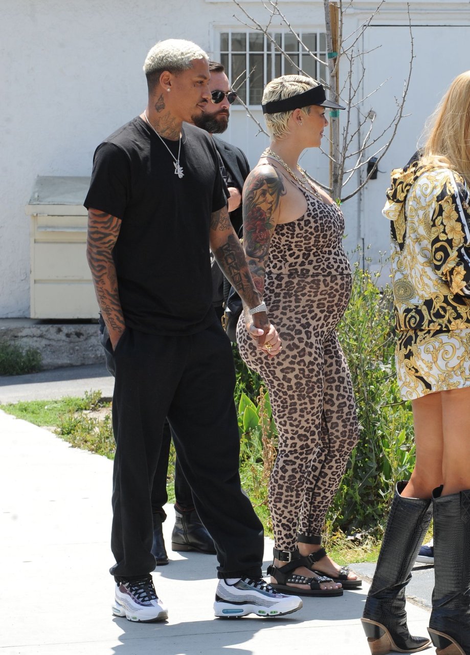 Amber Rose exibe sua crescente barriga de grávida com meia-calça de oncinha enquanto participa de uma reunião de negócios com seus parceiros e o namorado Alexander Edwards no restaurante francês Petit Trois em Sherman Oaks, 03/05/2019. O novo namorado de Amber, Alexander, não conseguia tirar as mãos dela enquanto esperavam pelo carro no valet.