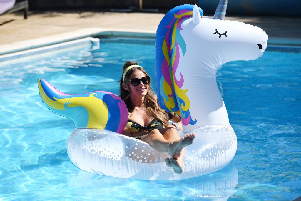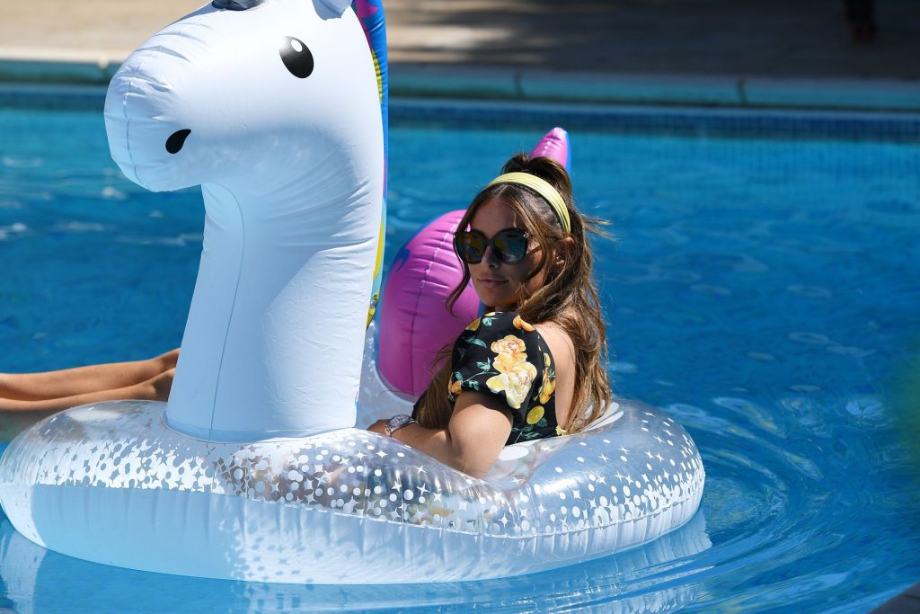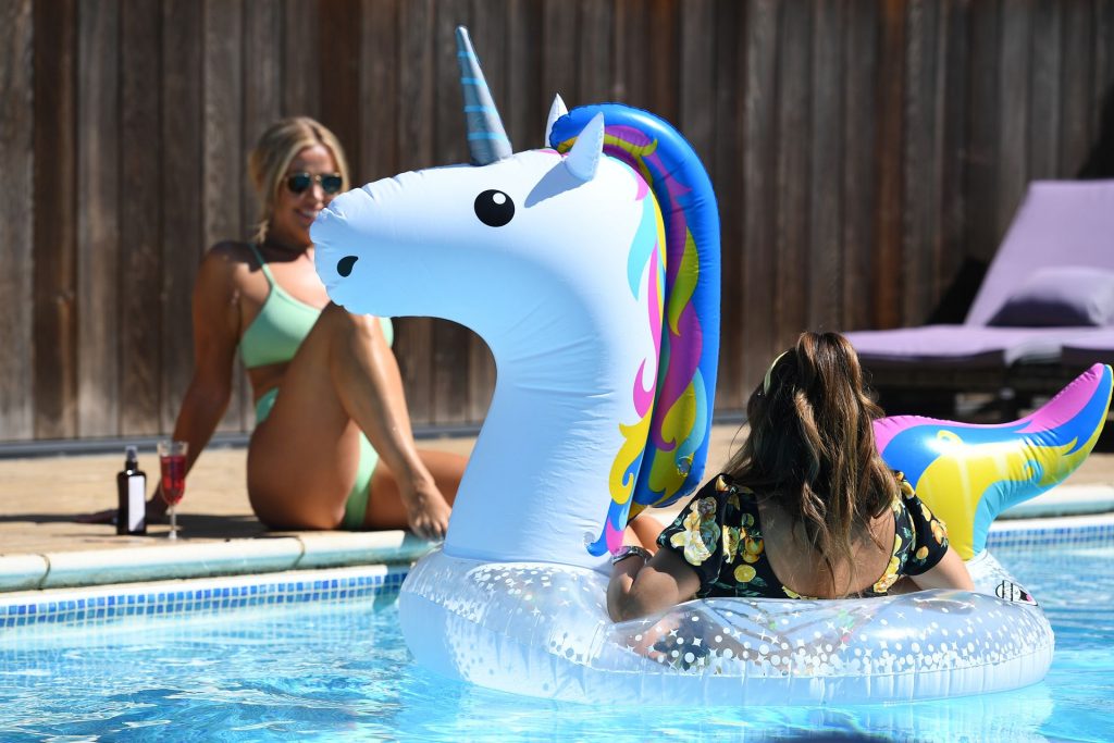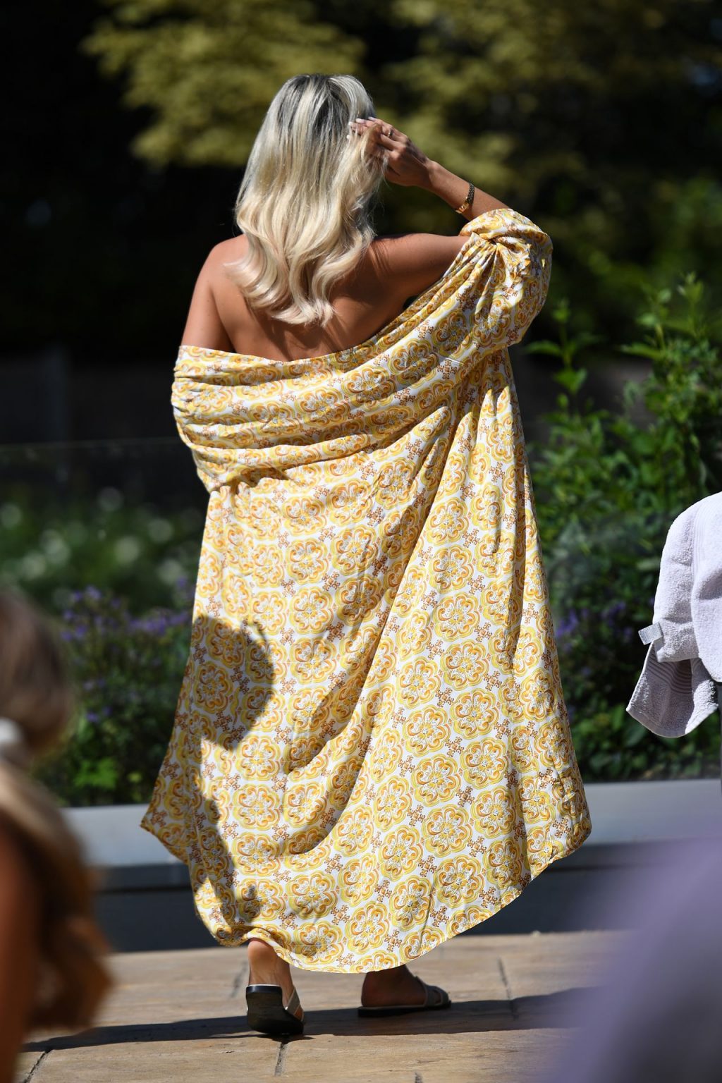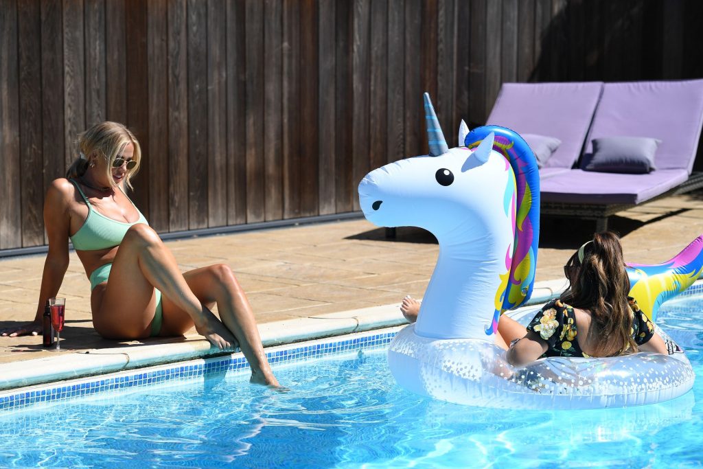 Amber Turner, Chloe Meadows, Courtney Green mostram seus corpos sensuais no programa de TV “The Only Way is Essex” filmando na piscina, 29/07/2020.