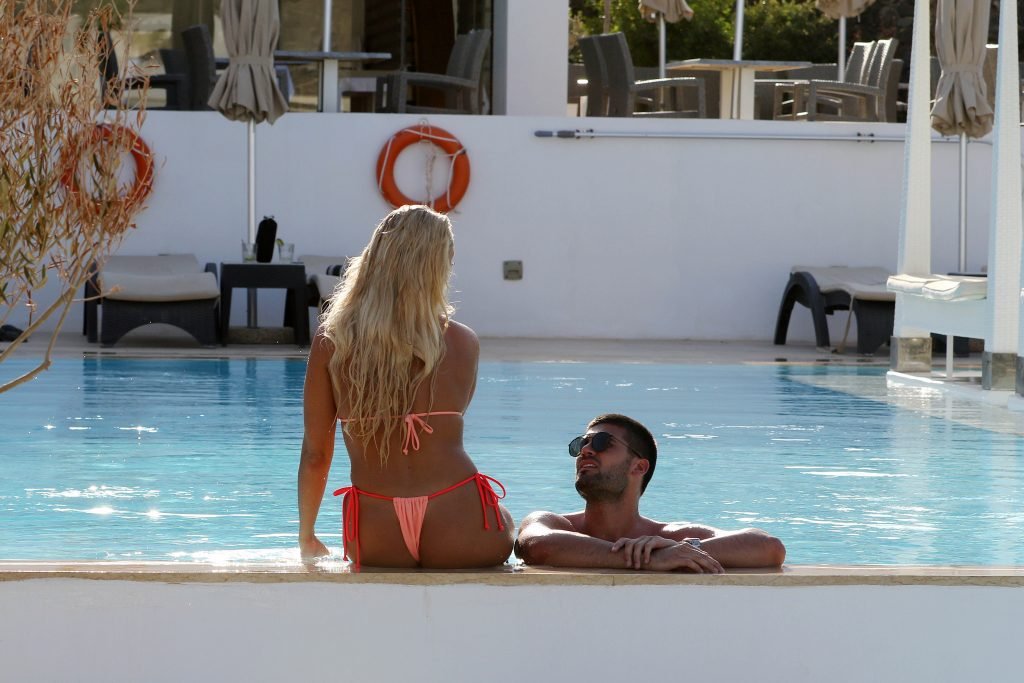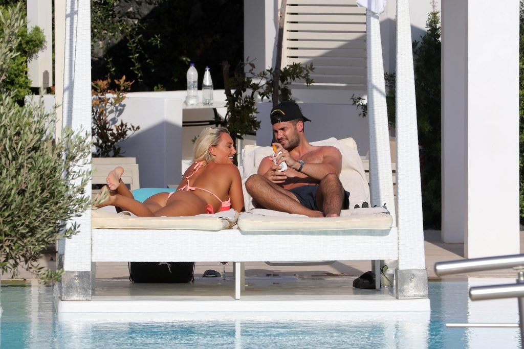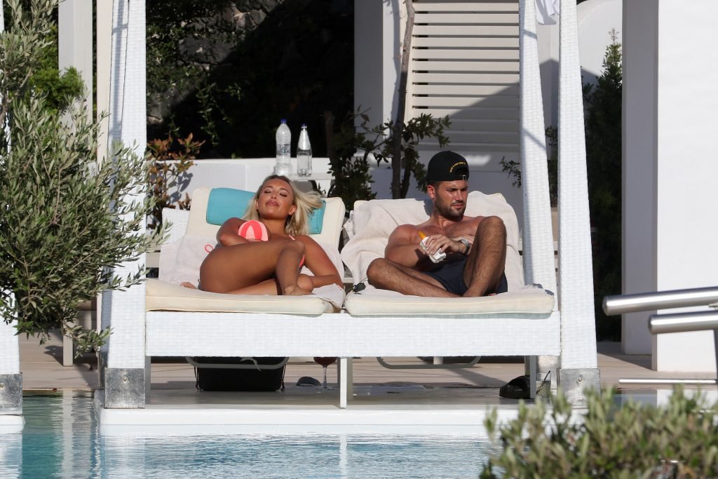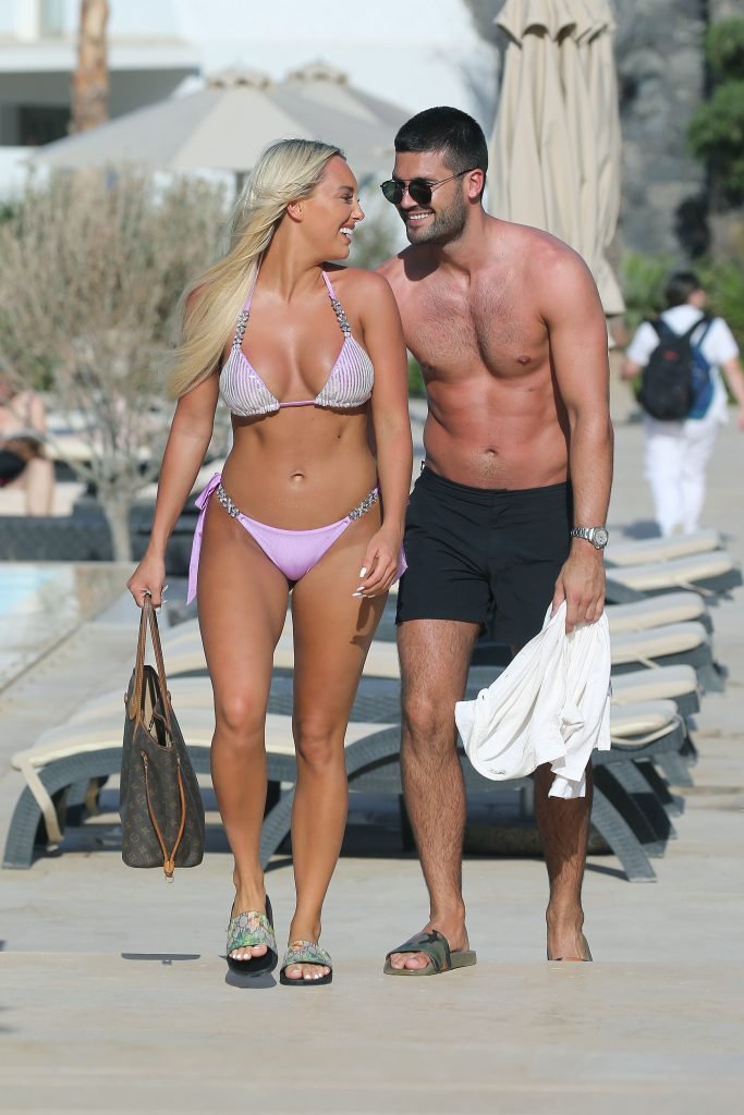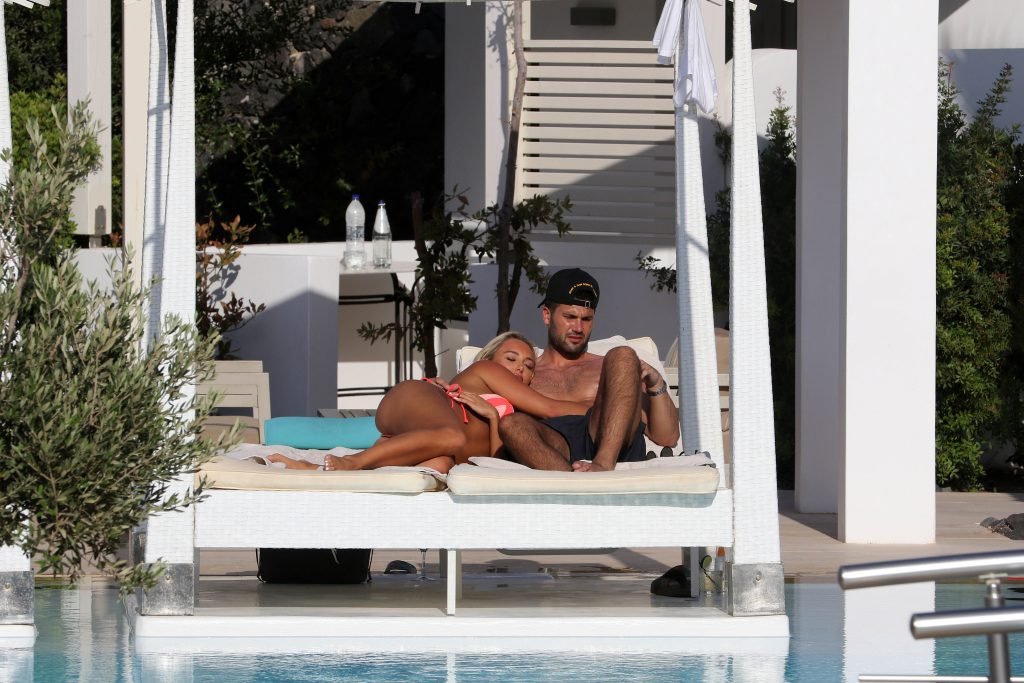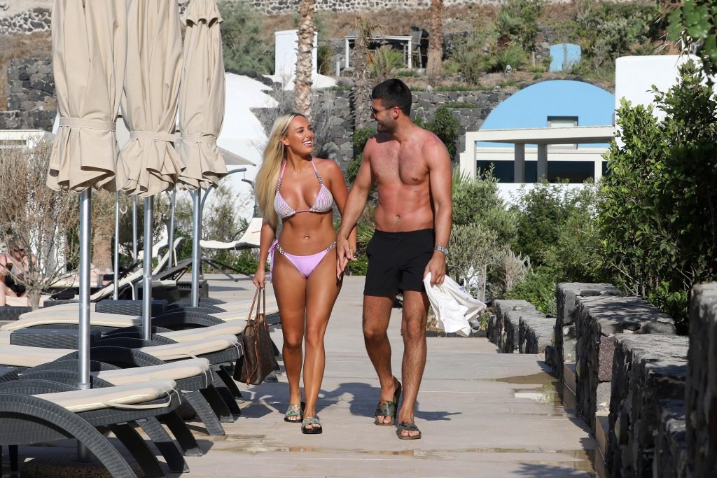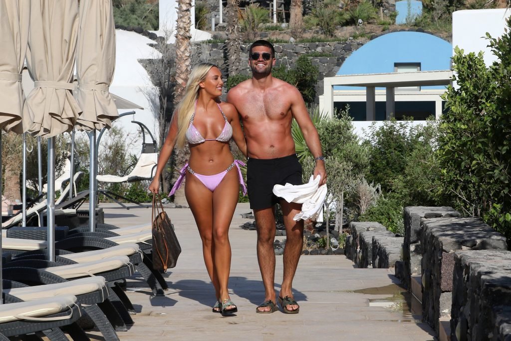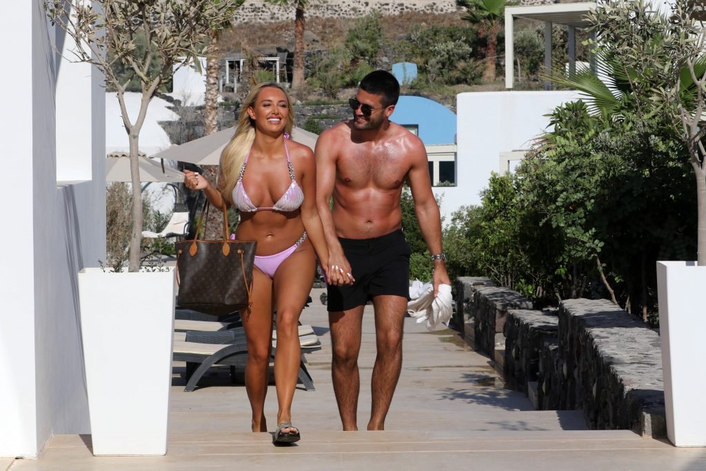 Fashion blogger Amber Turner & Dan Edgar foram vistos de férias em Santorini, Grécia (junho de 2018). As estrelas do TOWIE estavam muito apaixonadas enquanto aproveitavam o sol grego. Amber foi vista exibindo sua silhueta em biquínis.