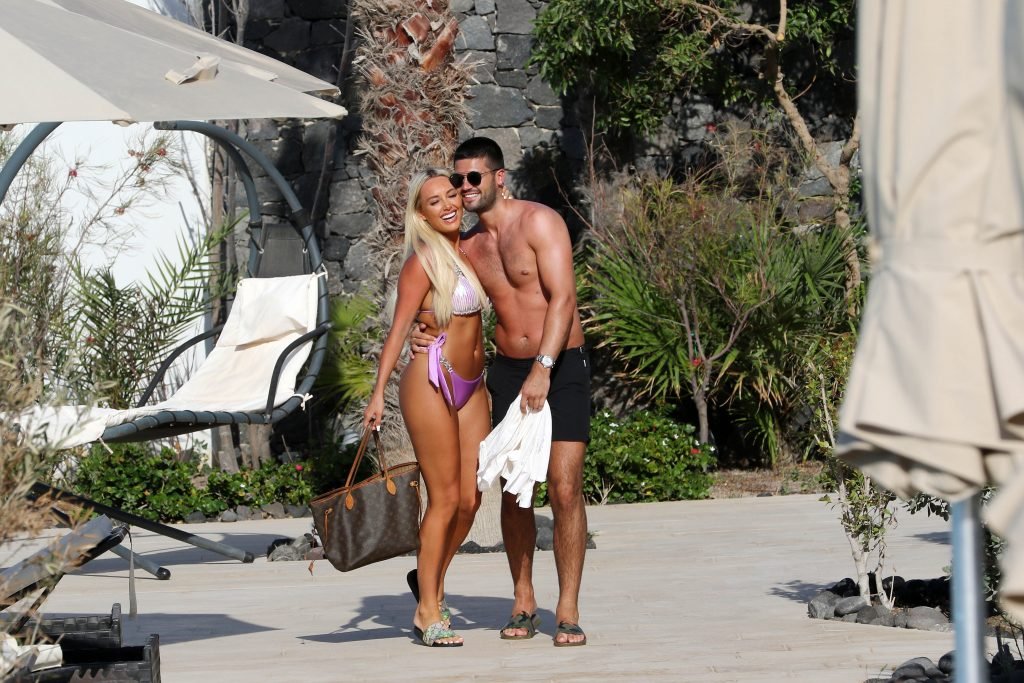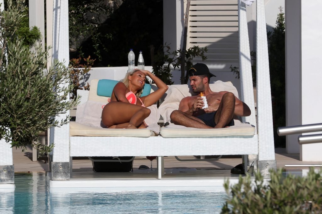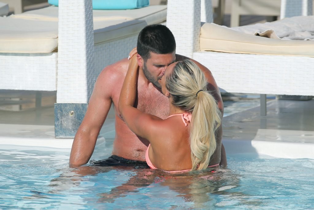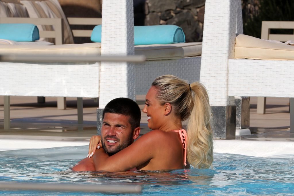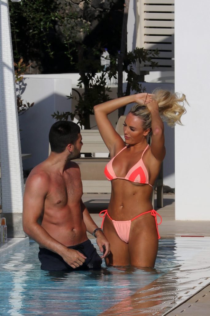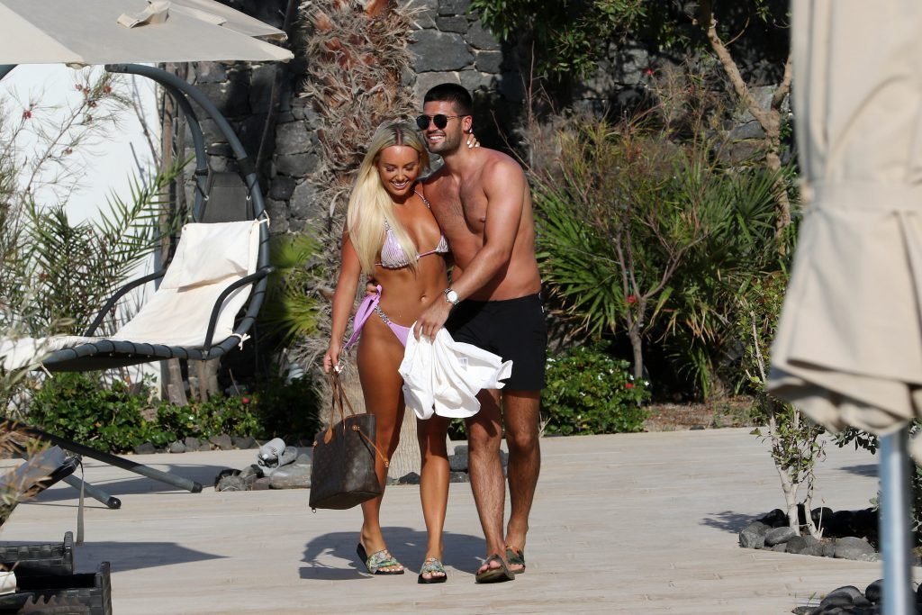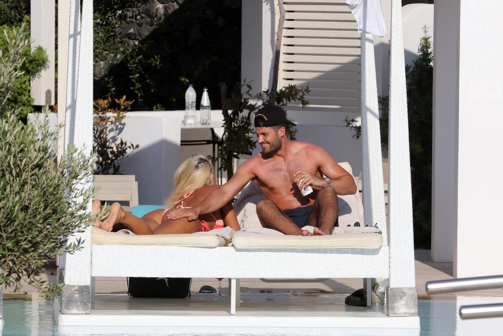 Fashion blogger Amber Turner & Dan Edgar foram vistos de férias em Santorini, Grécia (junho de 2018). As estrelas do TOWIE estavam muito apaixonadas enquanto aproveitavam o sol grego. Amber foi vista exibindo sua silhueta em biquínis.