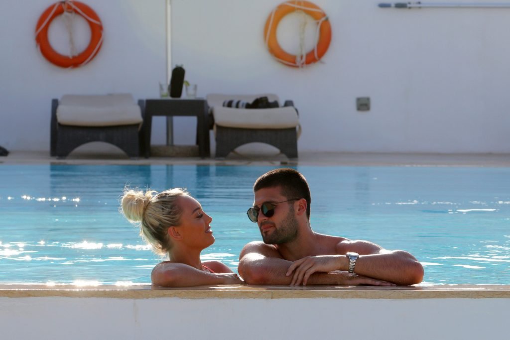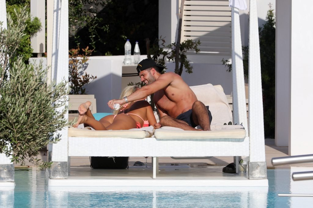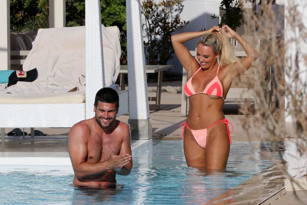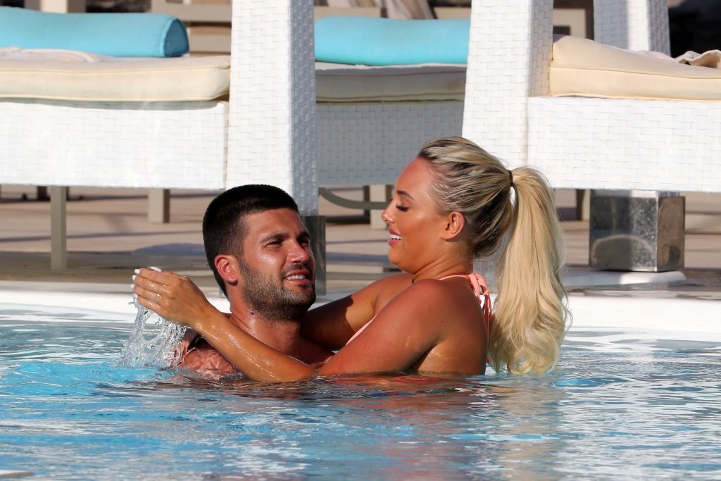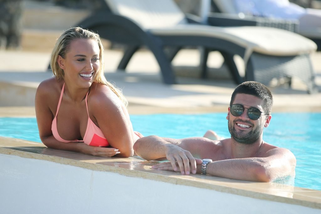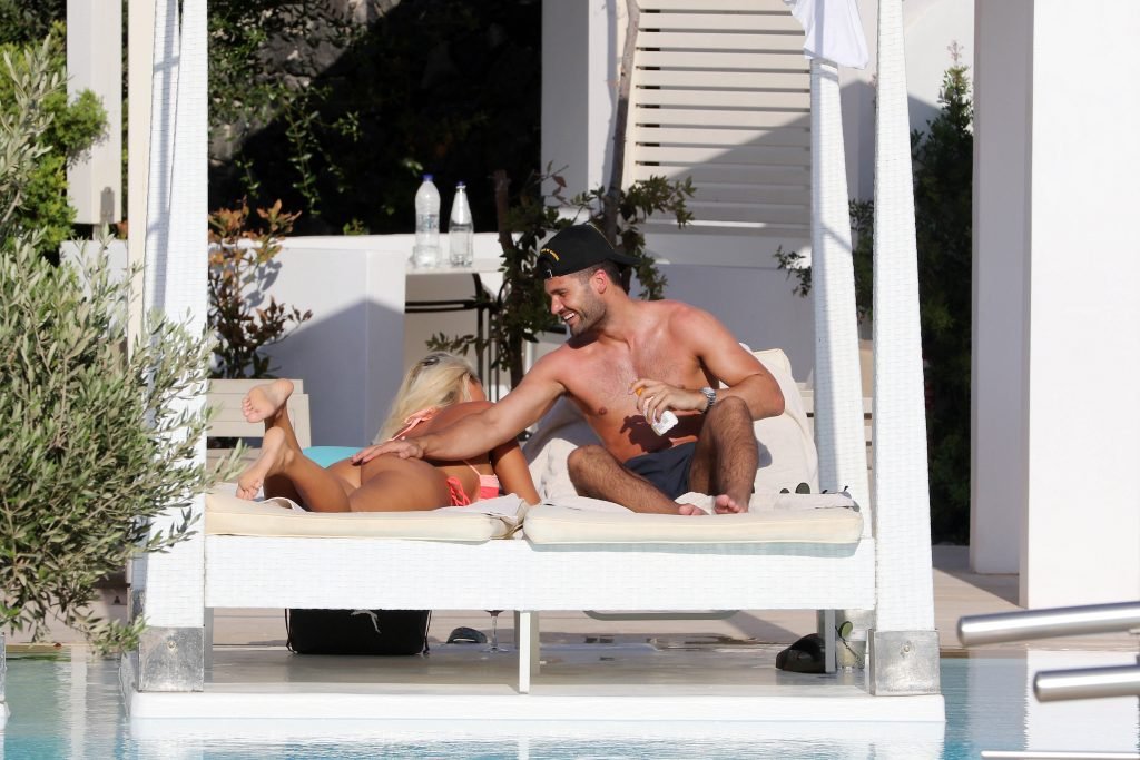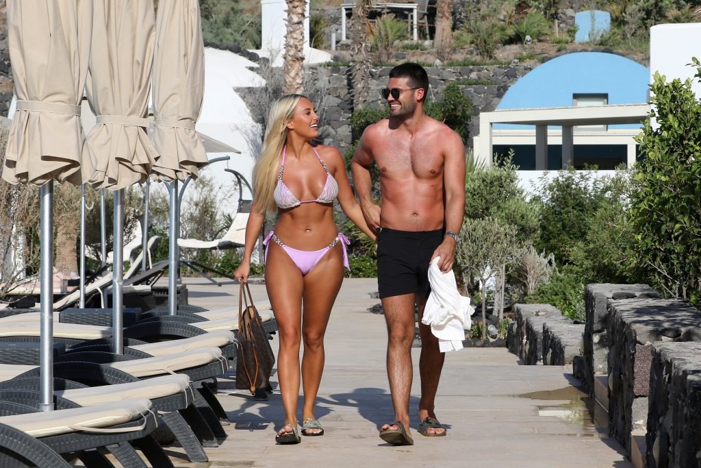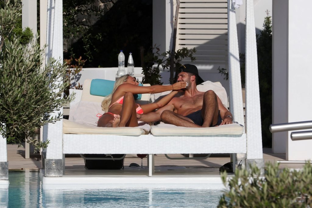 Fashion blogger Amber Turner & Dan Edgar foram vistos de férias em Santorini, Grécia (junho de 2018). As estrelas do TOWIE estavam muito apaixonadas enquanto aproveitavam o sol grego. Amber foi vista exibindo sua silhueta em biquínis.