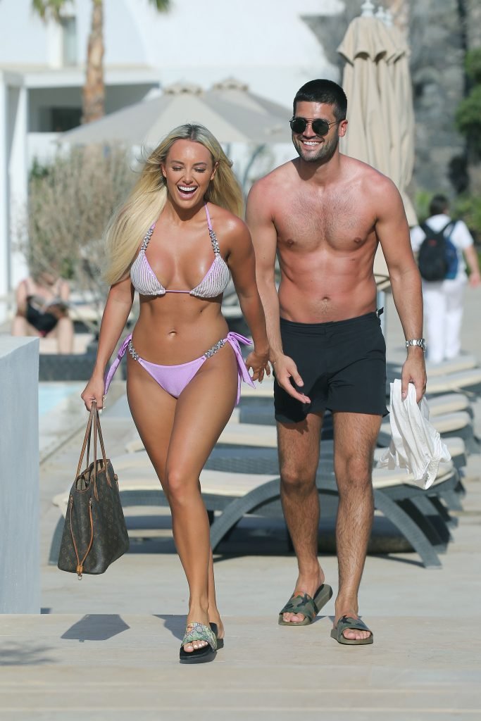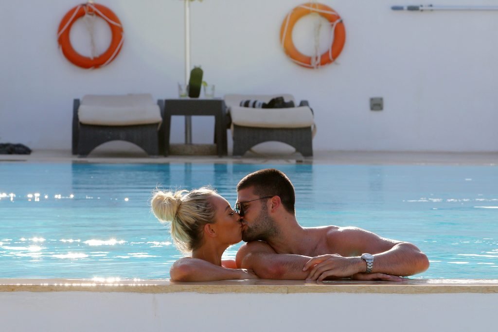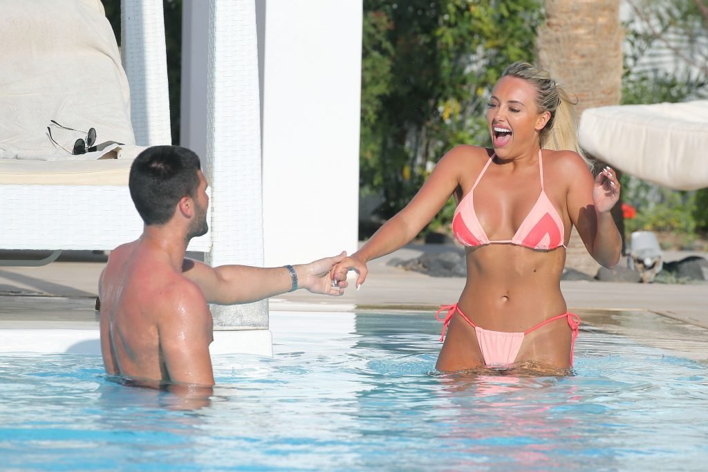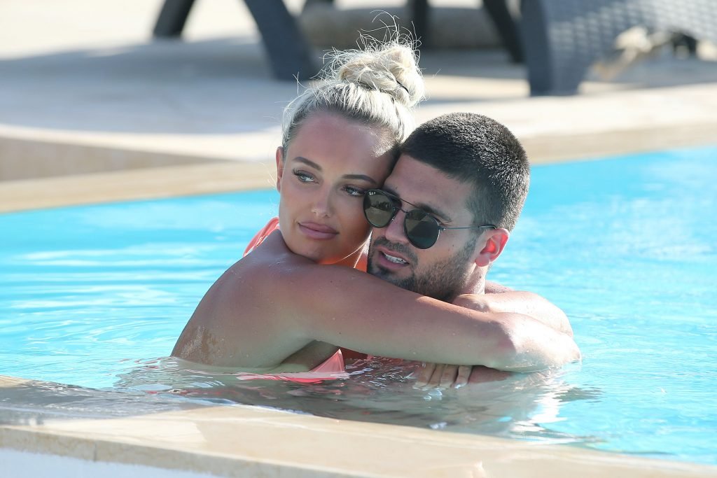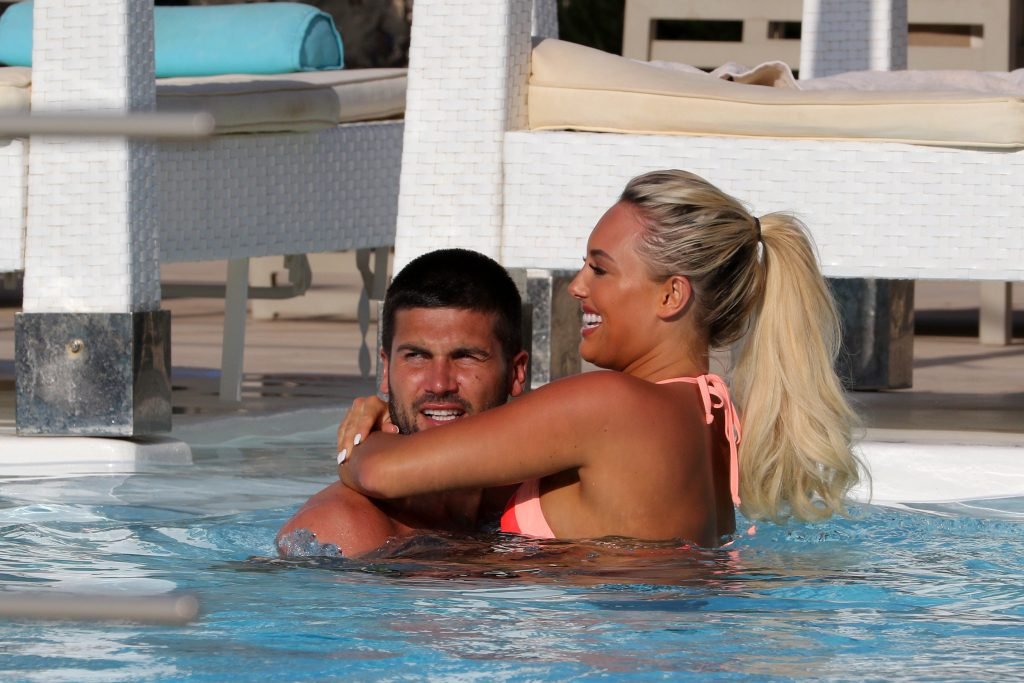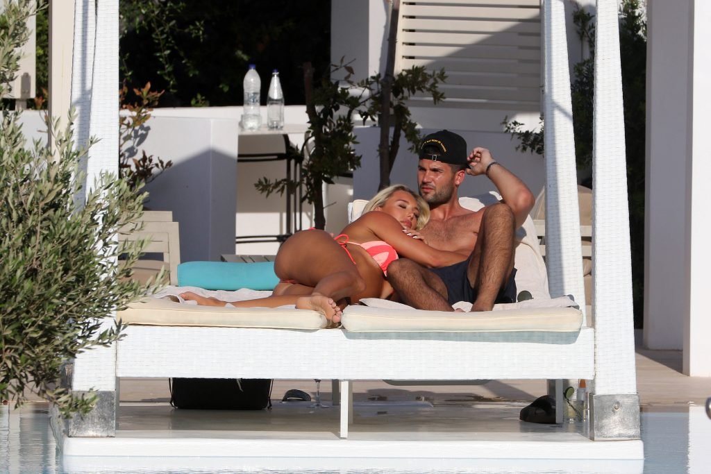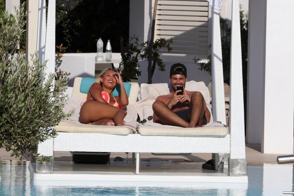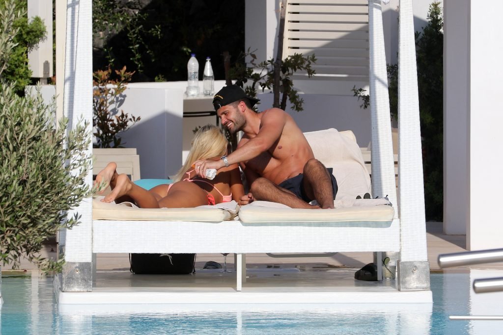 Fashion blogger Amber Turner & Dan Edgar foram vistos de férias em Santorini, Grécia (junho de 2018). As estrelas do TOWIE estavam muito apaixonadas enquanto aproveitavam o sol grego. Amber foi vista exibindo sua silhueta em biquínis.