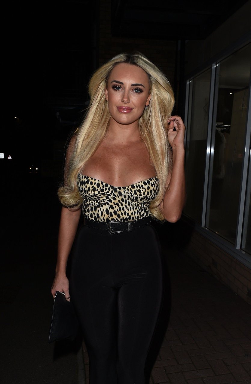 Amber Turner chega ao aniversário do By Georgina Salon em Loughton, Reino Unido, 24/02/2018. A blogueira de moda de 24 anos usava uma blusa reveladora com estampa de leopardo.