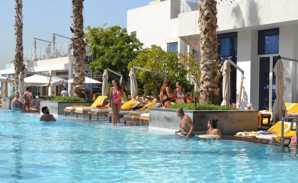 Não é de se admirar, pois as garotas exibem seus maiôs sexy em seus corpos bronzeados enquanto aproveitam à beira da piscina o quente sol árabe.