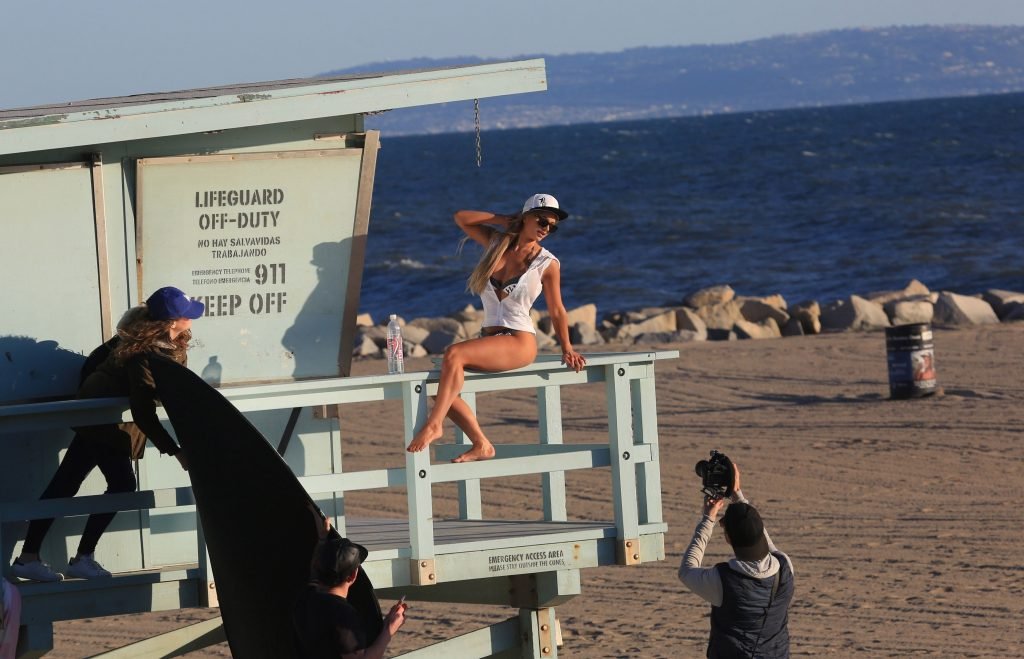 Modelo australiana de seios fartos Amy Lee Summers (26) enfrenta o calor em Los Angeles e exibe seu corpo sexy de biquíni no set de uma sessão de fotos da 138 Water em Malibu, 31/08/2017.