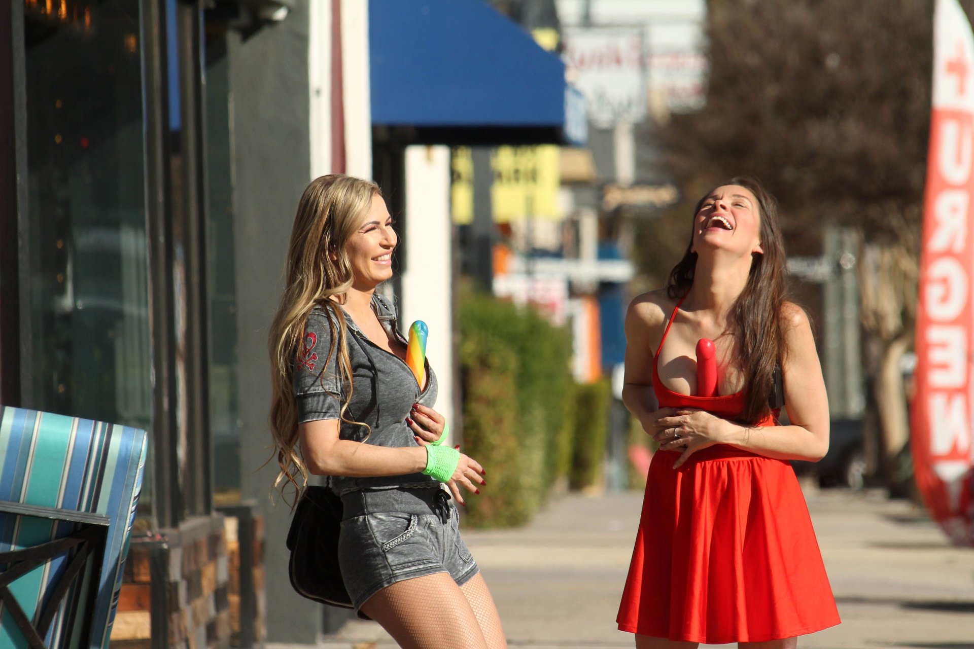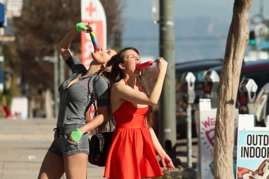 A brasileira Ana Braga, playmate, e a atriz de “Baywatch” Alicia Arden posam para os paparazzi quando são flagradas saindo de uma boutique erótica, aproveitando os pirulitos que compraram em Studio City, 22/01/2018.
