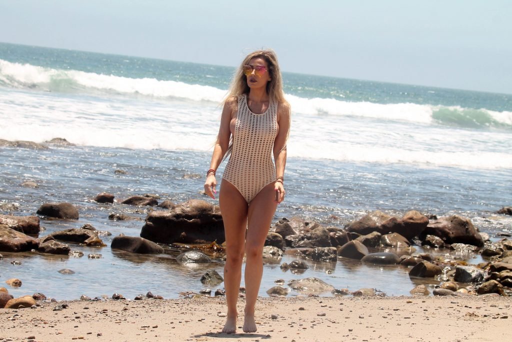 Brazilian Playmate Ana Braga vista usando um maiô transparente na Praia de Malibu, na Flórida, 25/07/2017.