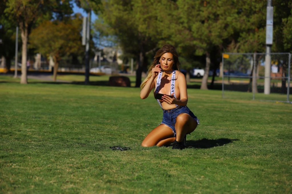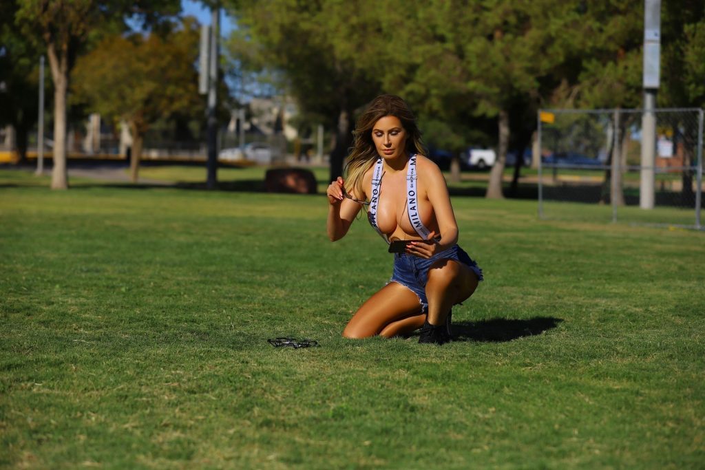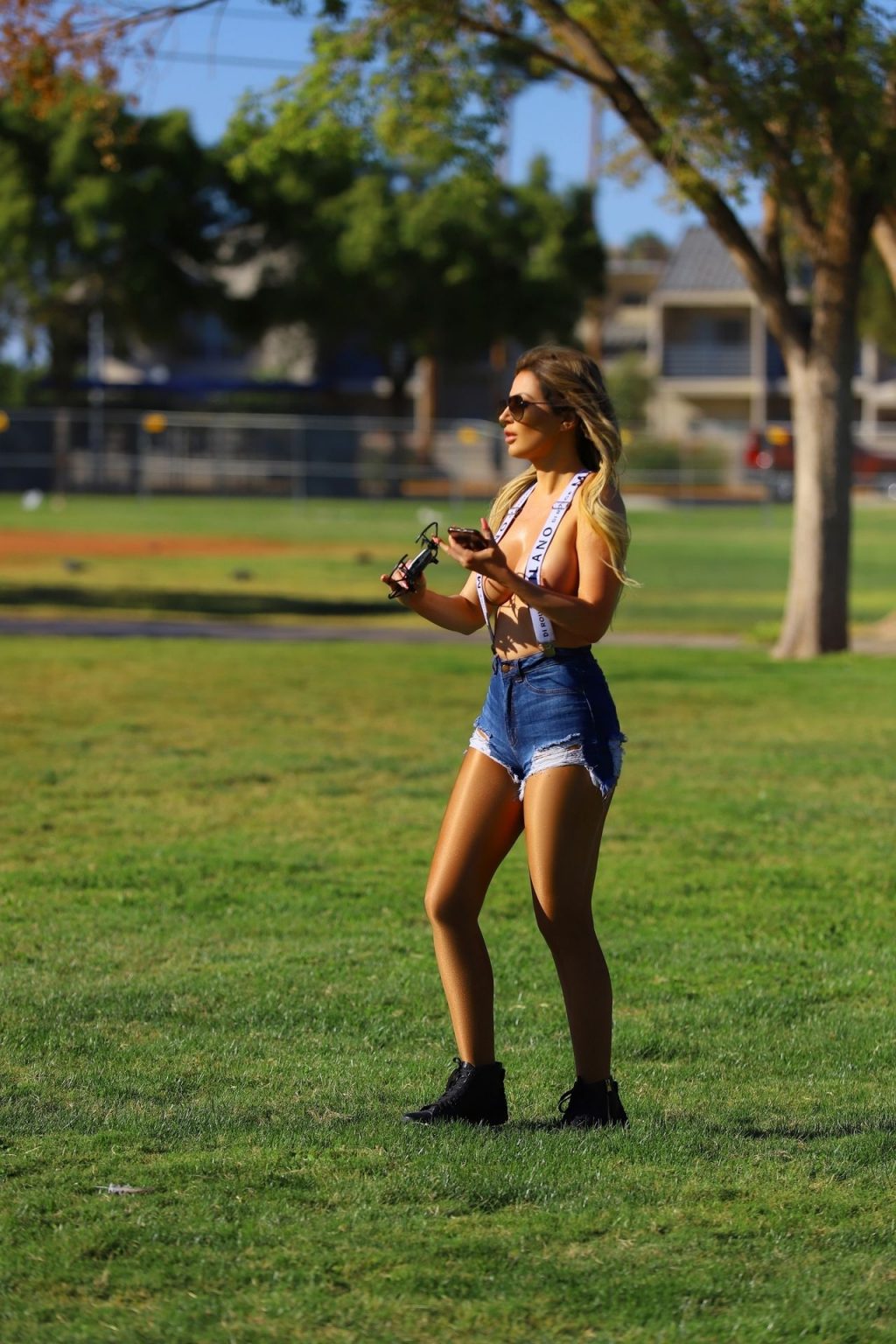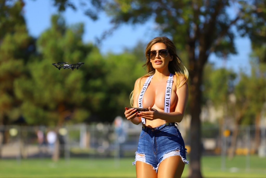 A Playmate brasileira Ana Braga deixa pouca coisa para a imaginação enquanto se cobre apenas com suspensórios no parque brincando com drones – Los Angeles, 18/11/2019.