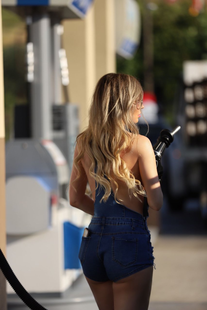A Playmate brasileira Ana Braga foi vista usando jardineiras e nada mais enquanto abastecia em um posto de gasolina em Calabasas, 10/09/2019.