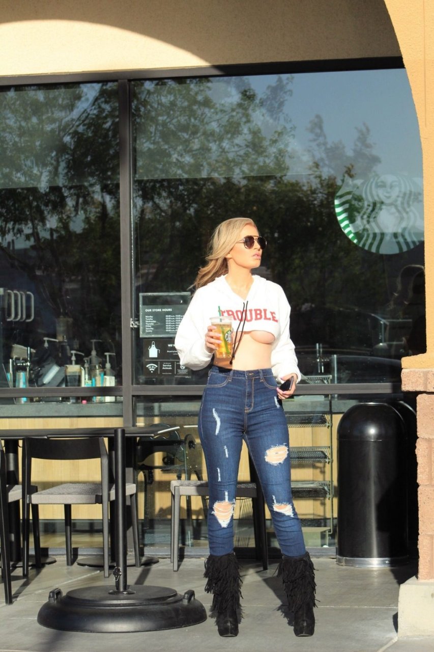 A playmate brasileira Ana Braga mostra um grande underboob enquanto vai buscar um café no Starbucks em Calabasas, 14/10/2018. A modelo de 36 anos tem um pequeno problema de guarda-roupa ao voltar para seu carro usando um suéter cropped.