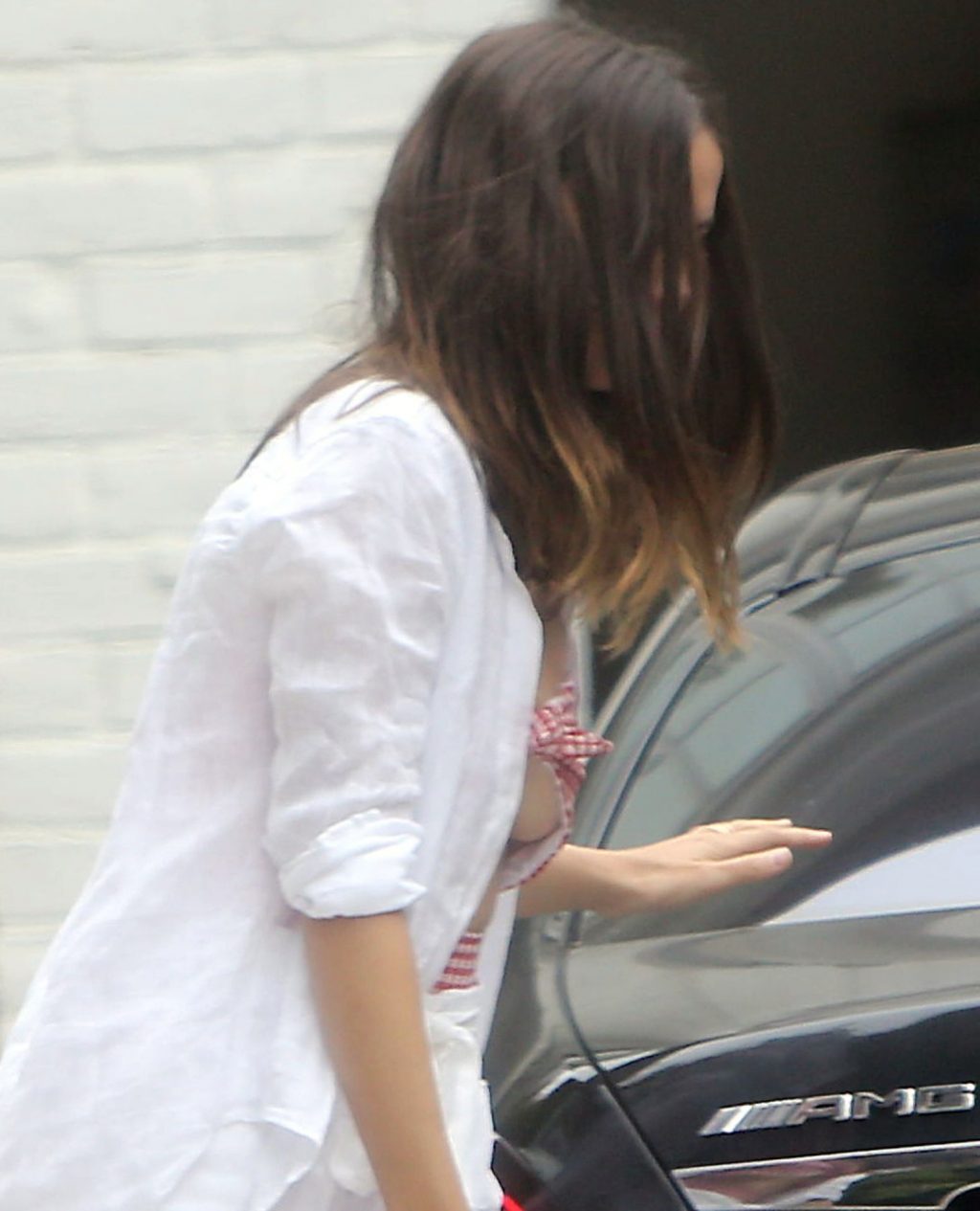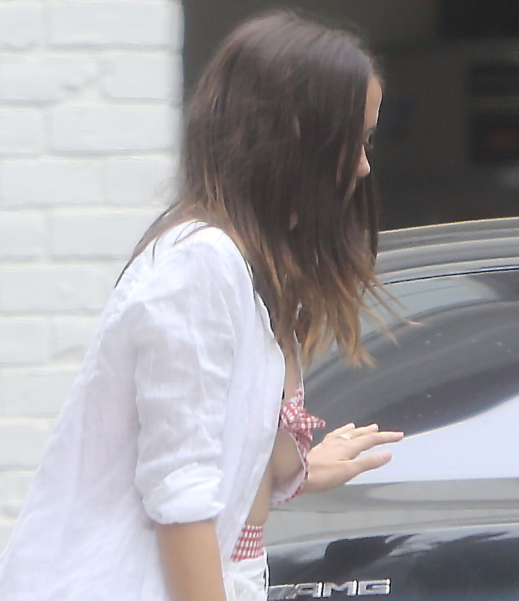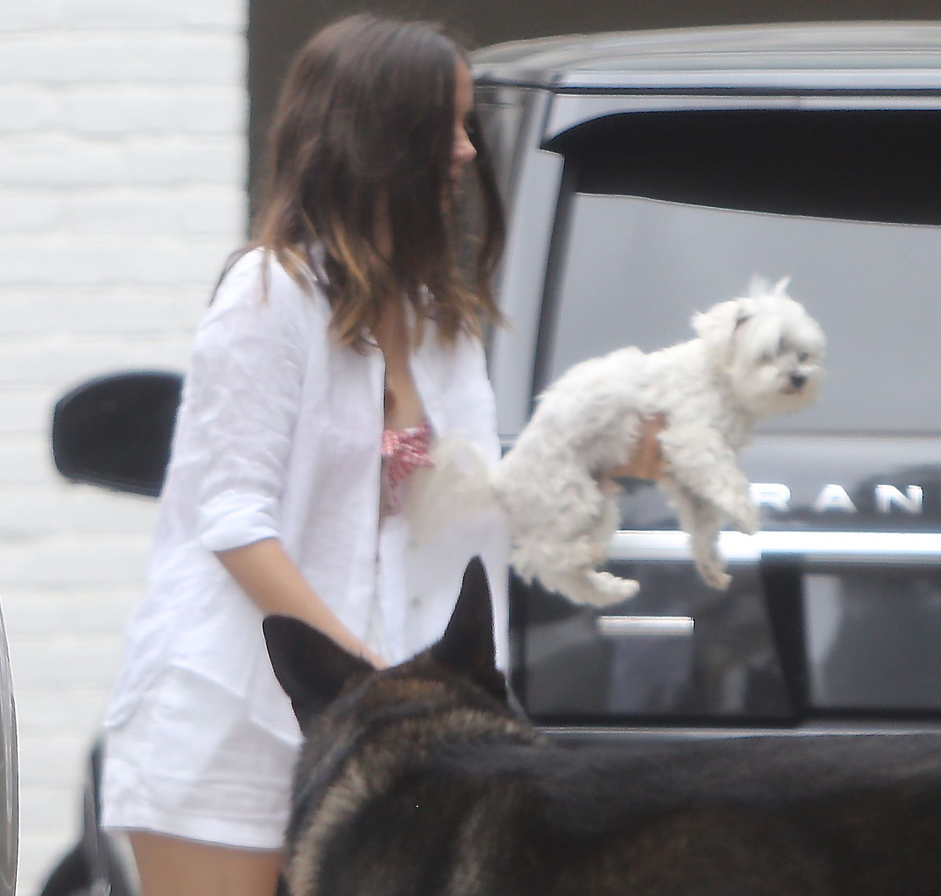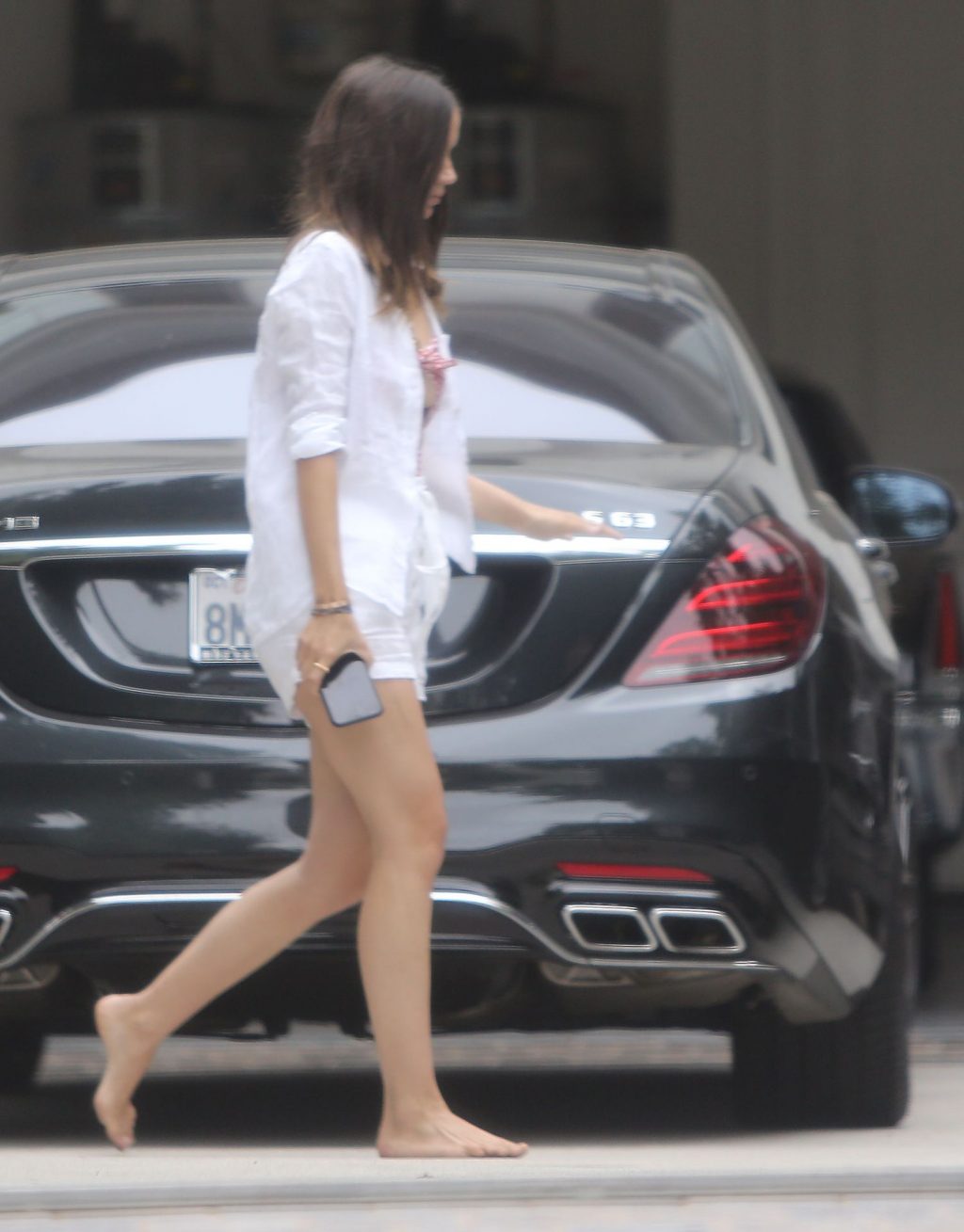 A bela atriz, namorada de Ben Affleck, Ana De Armas, foi vista usando um biquíni Vichy vermelho na moda no domingo em Brentwood com seu adorável filhote, 28/06/2020.